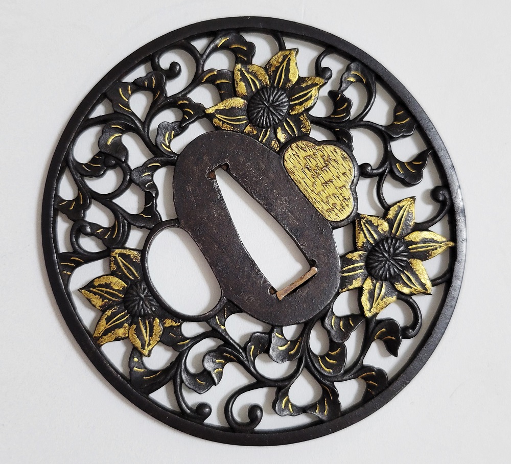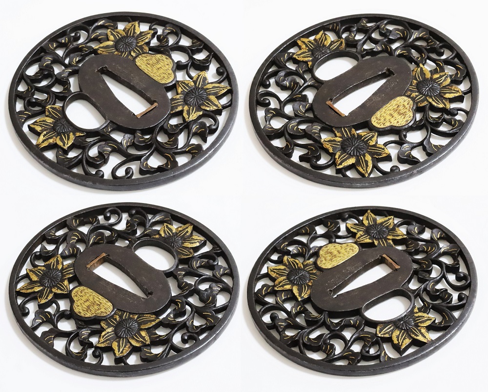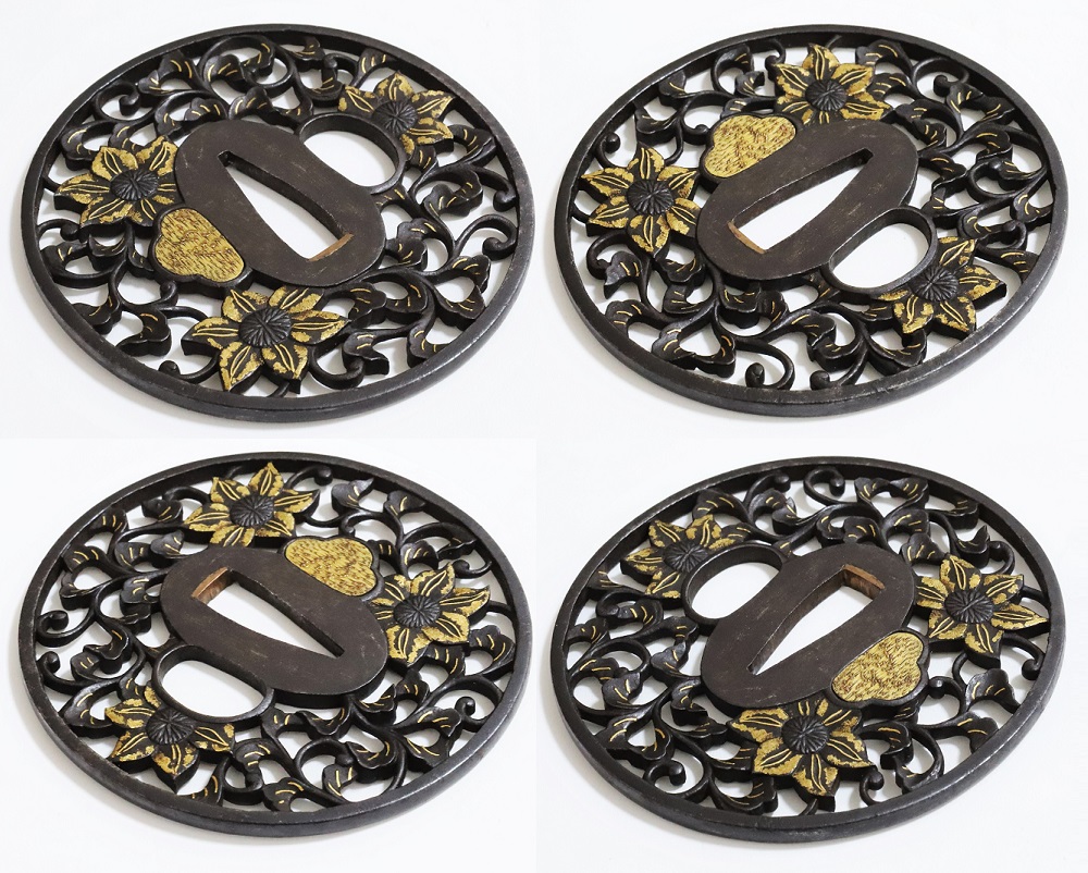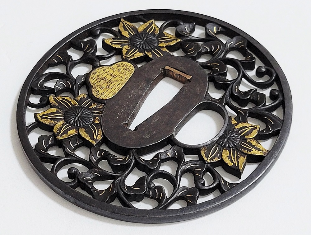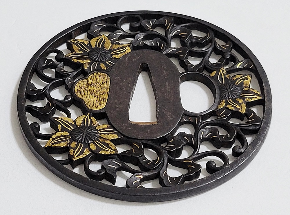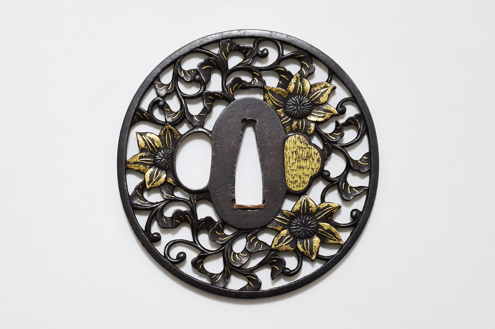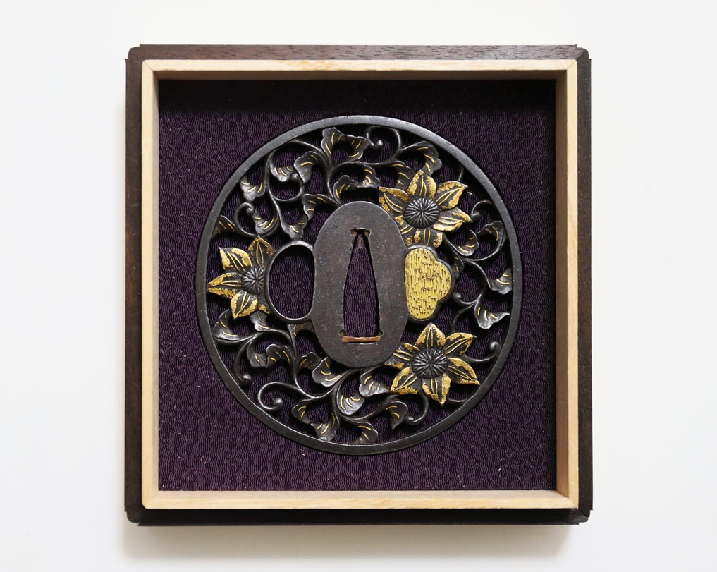 | 毛利家を藩主とする長州藩は、多くの鐔工を抱えて財政を潤すべく積極的に作鐔をおこない他国に鐔を供給。長州鐔は拵に用いて釣合いよく広く一般に愛好された。河治、中井、岡本の三家が主流をなし繁栄した。特徴は鉄を磨仕上げとし密画風に画面一杯綿密に山水、草花図を肉彫地透し象嵌を施す。本作は2024年2月審査で「長州」に極められ特別保存合格。精巧優美な鐔。 |