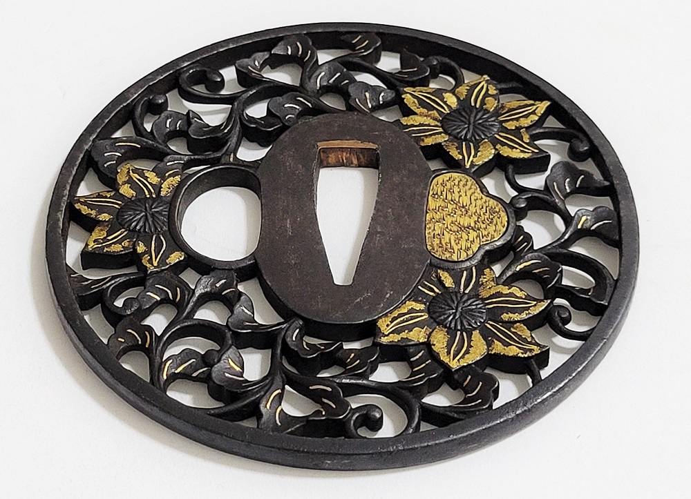 | 材質 | 鉄磨地 肉彫地透 金布目象嵌 角耳小肉 |