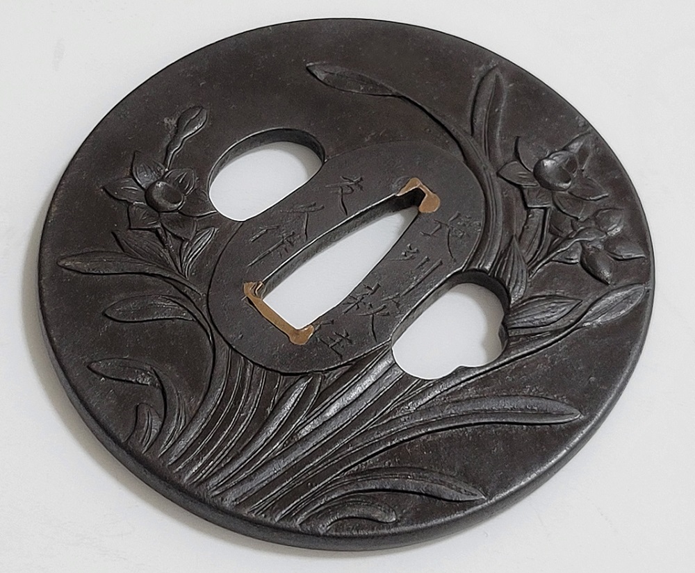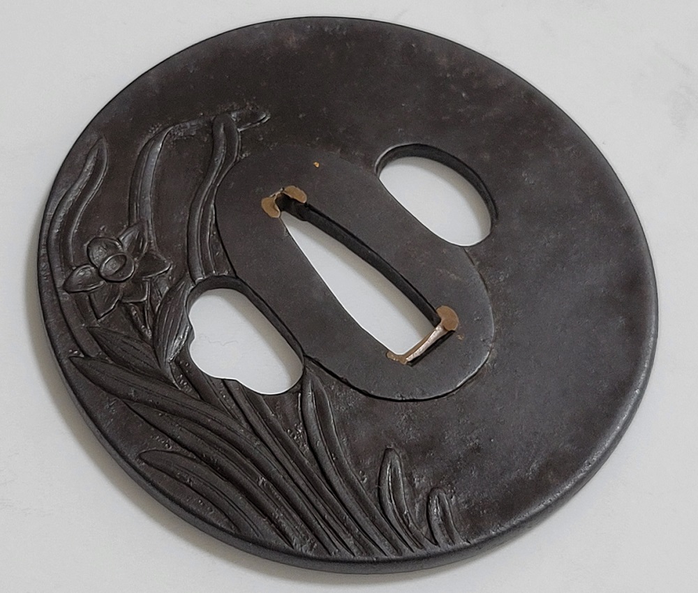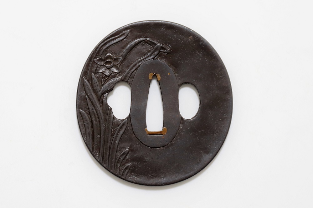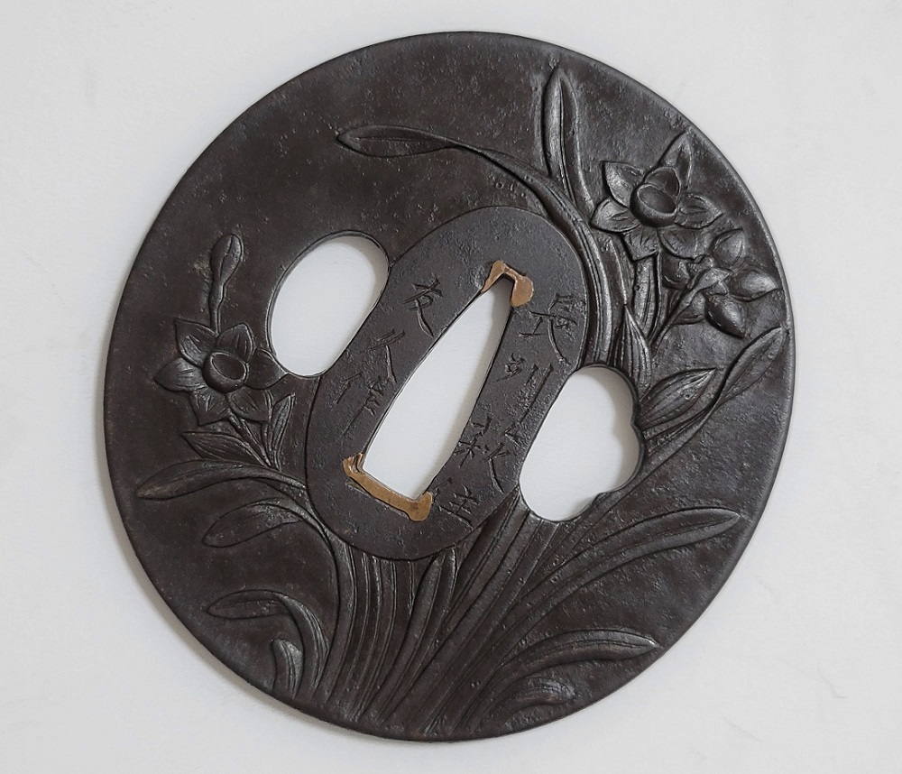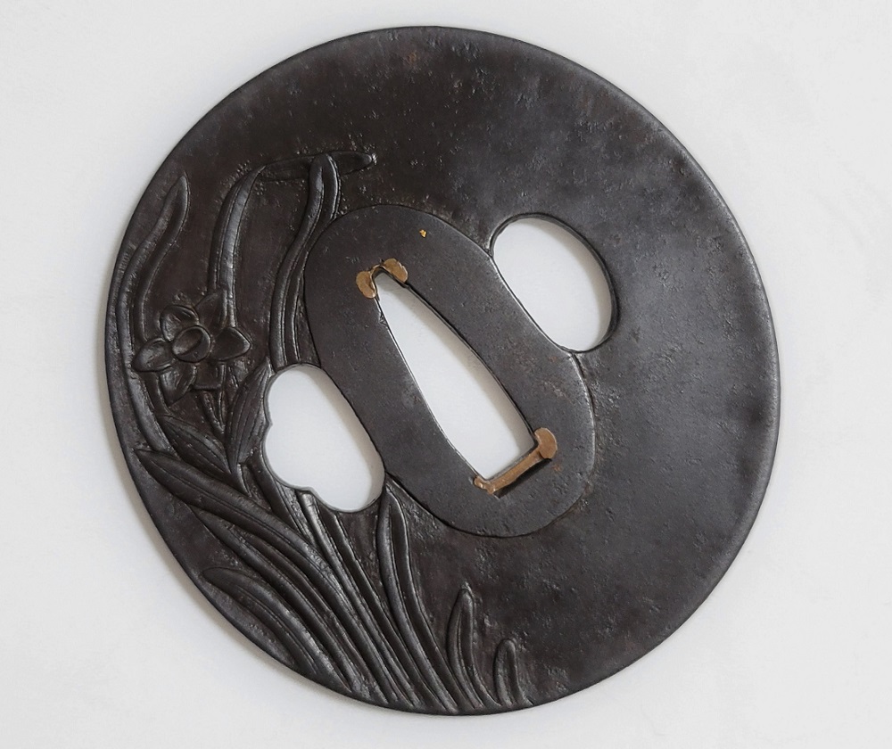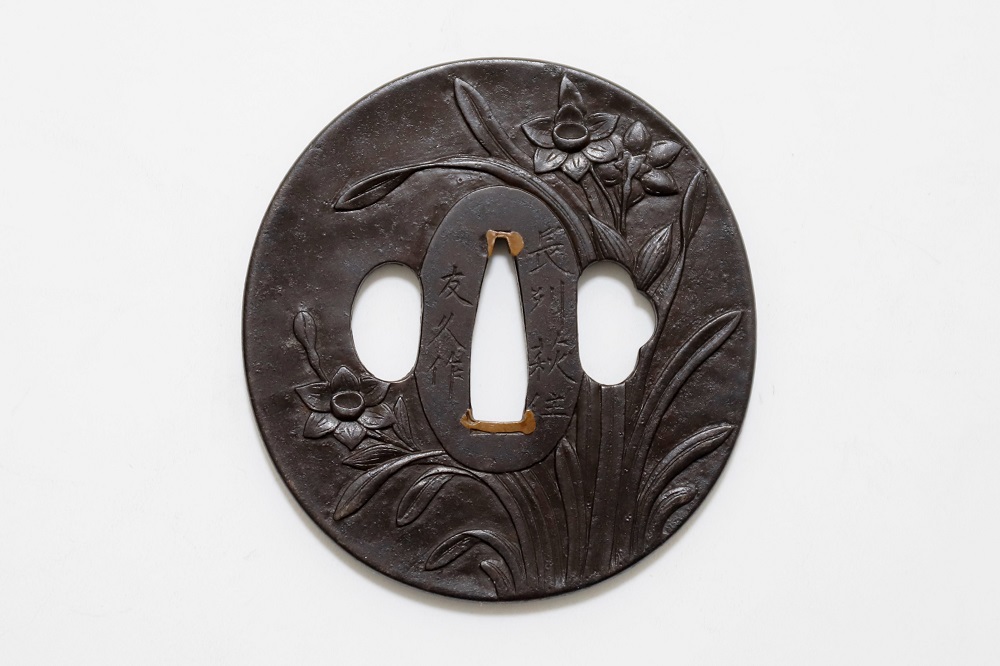 | 長州は、藩公の奨励もあり他国他藩に広く輸出されて全国で最も鐔工が多い。長州鐔は拵に用いて釣合いが良く広く愛好された。本作は竪丸形やや厚手に鍛錬の良い地鉄が用いられ精巧な鋤出彫で水仙を描く。江戸時代後期の典型的かつ長州鐔の優品。特別保存刀装具。 |