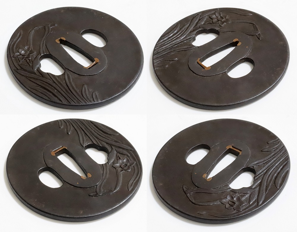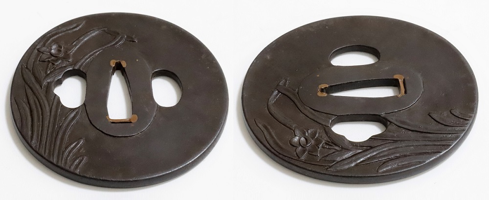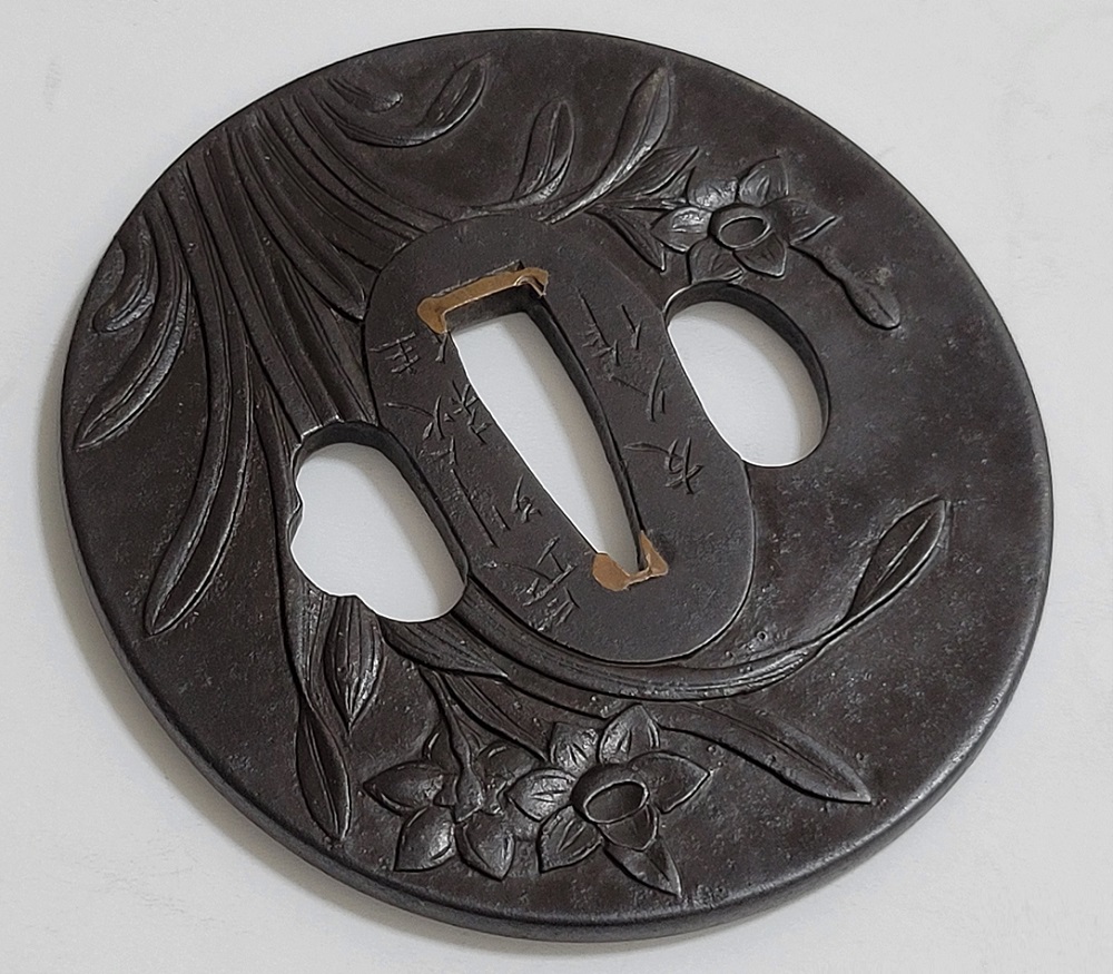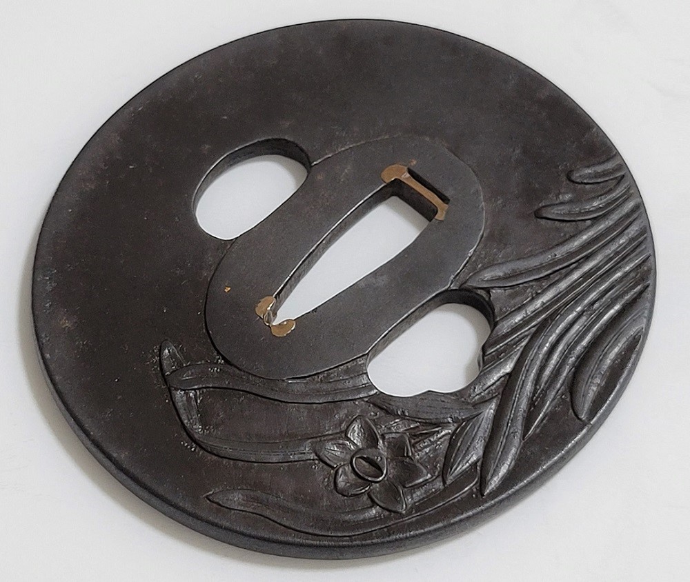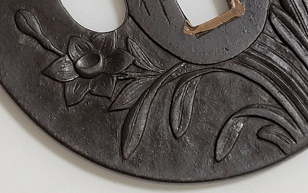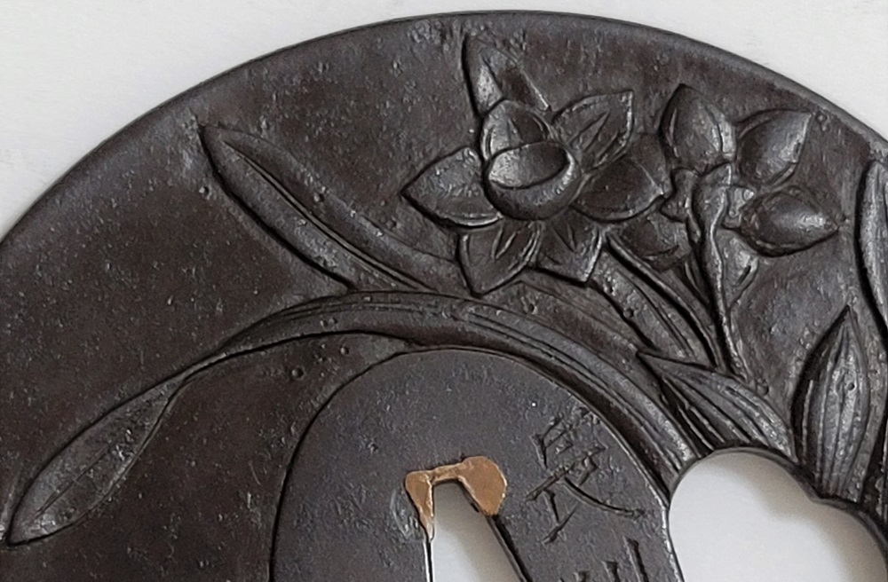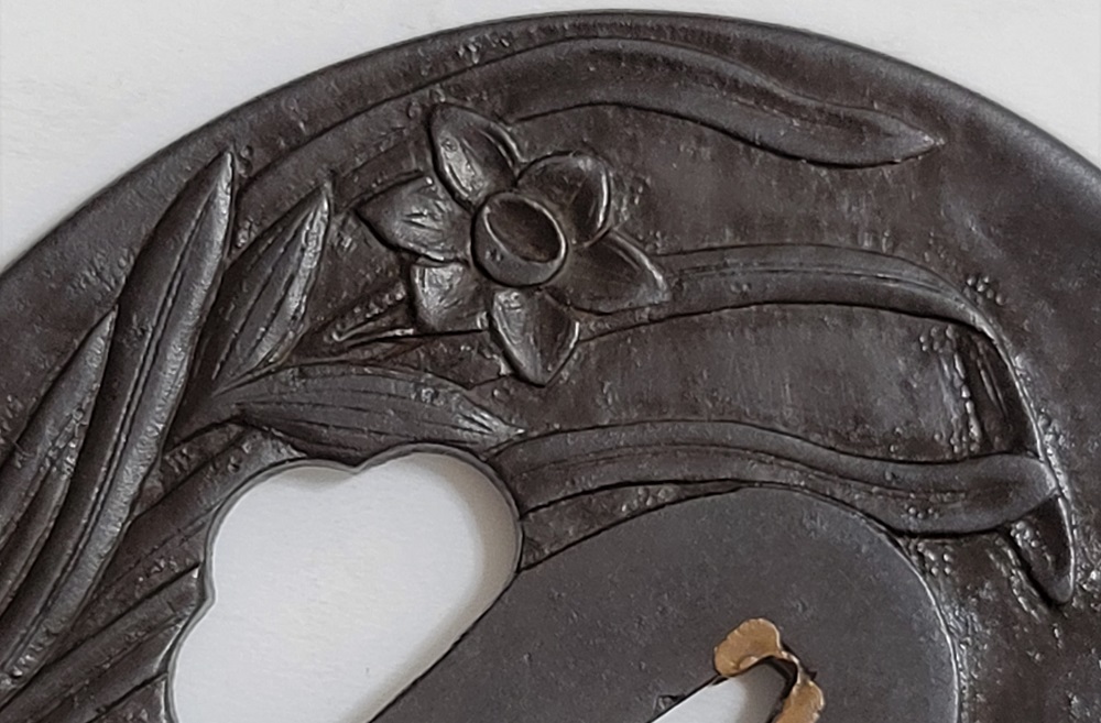 | 長州は、藩公の奨励もあり他国他藩に広く輸出されて全国で最も鐔工が多い。長州鐔は拵に用いて釣合いが良く広く愛好された。本作は竪丸形やや厚手に鍛錬の良い地鉄が用いられ精巧な鋤出彫で水仙を描く。江戸時代後期の典型的かつ長州鐔の優品。特別保存刀装具。 |