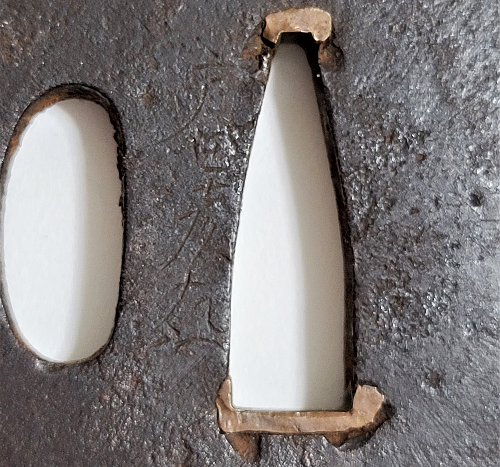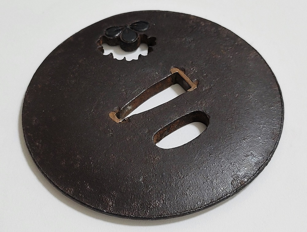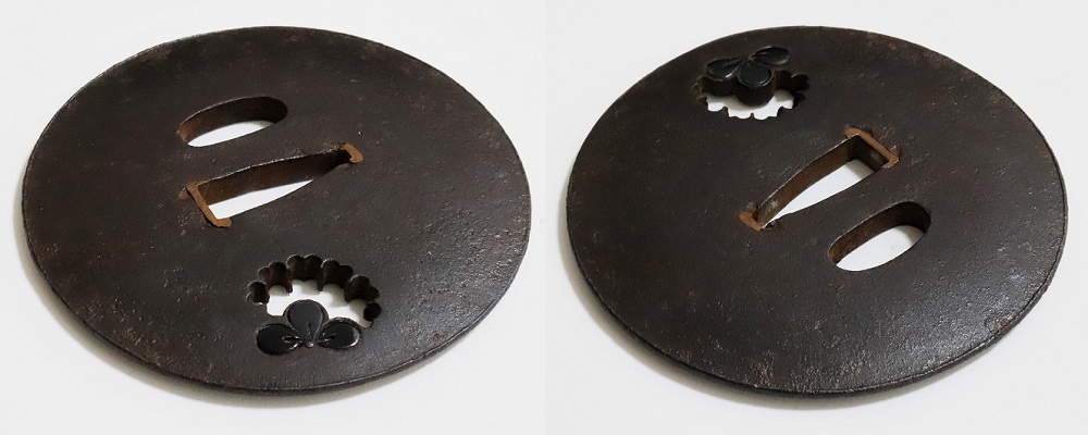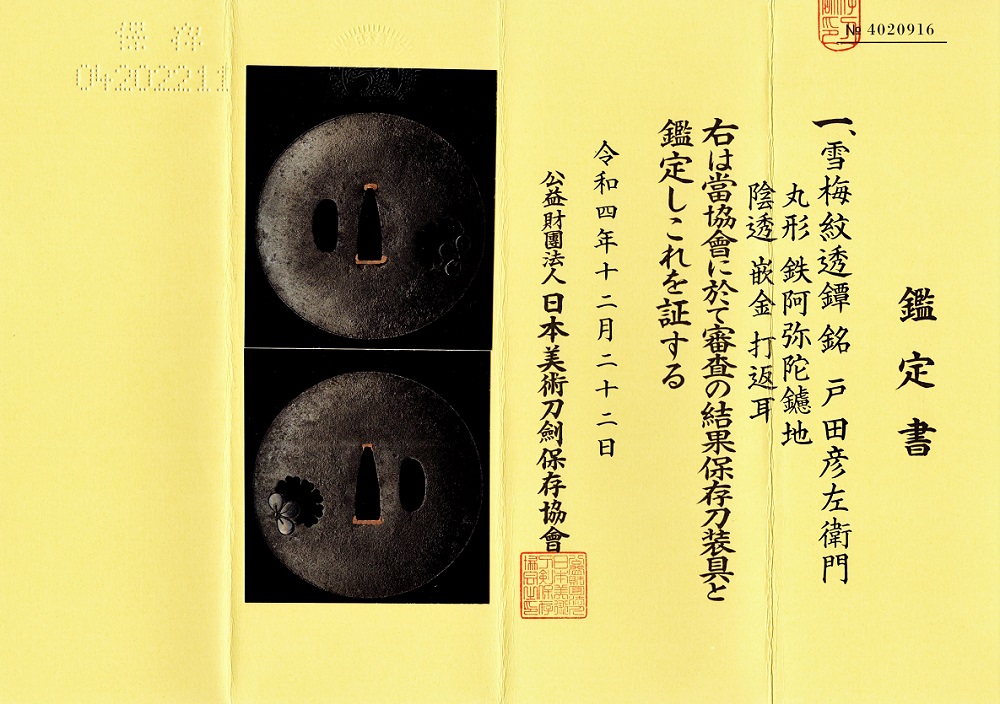 | 材質 | 鉄阿弥陀鑢地 丸形 陰透 嵌金 打返耳 |