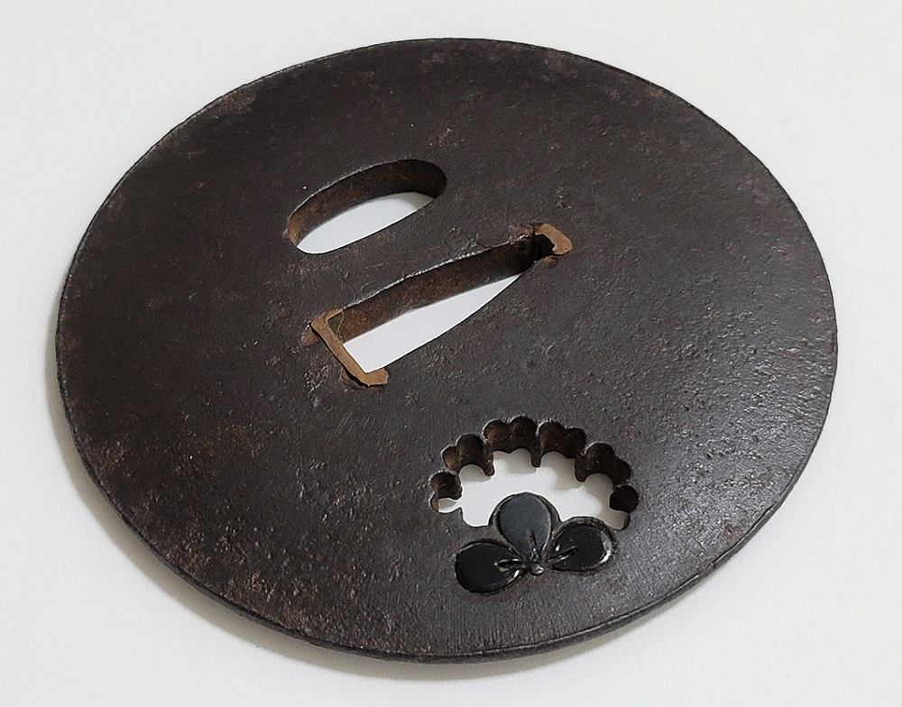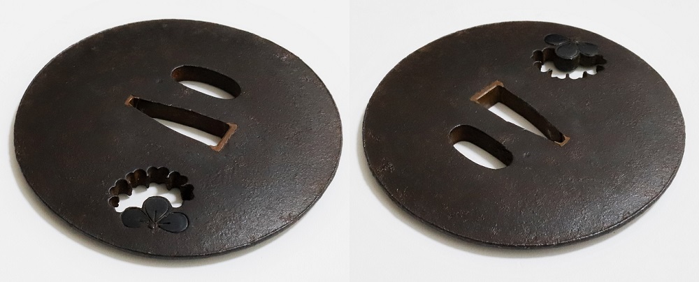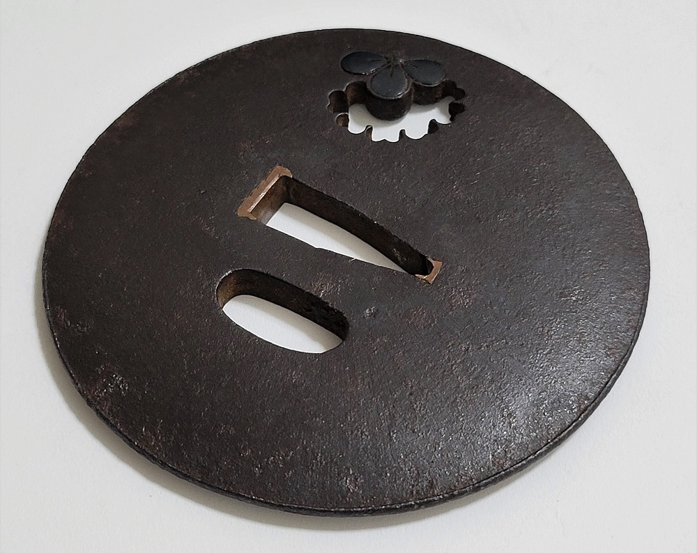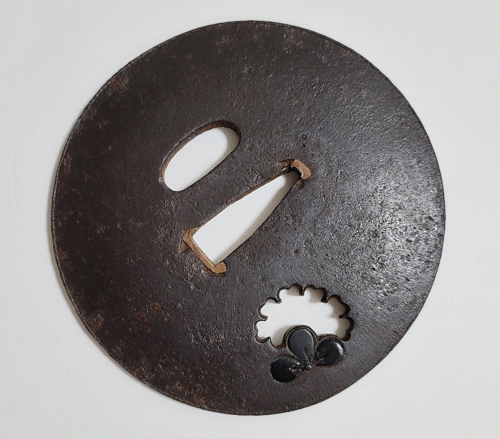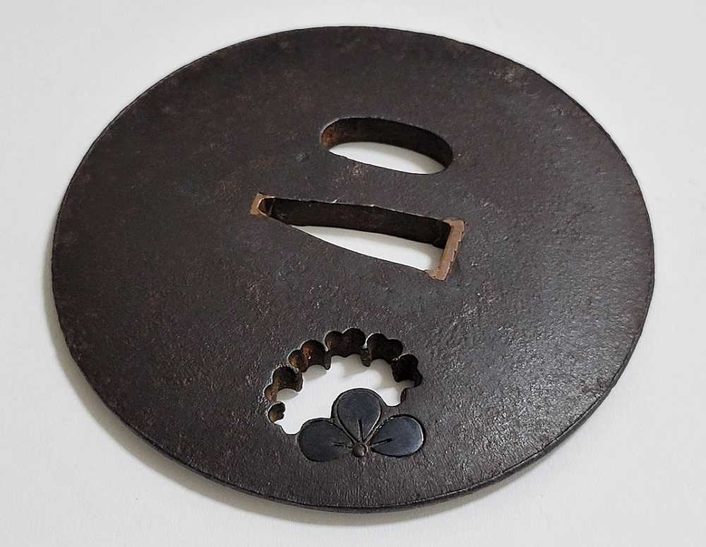 | 彦左衛門は戸田氏。尾張江戸期代表工の一人。小透し多く、阿弥陀鑢得意。尾張戸田村住。本作は中高の碁石形に微細な阿弥陀鑢を掛け僅かに打返し耳を付ける。精錬された鉄地には雪華紋小透と赤銅梅の花を半分づつワンポイントで配す。冬の終わりを告げる早春の図。質素ながらも気品ある鐔。2022年保存刀装具審査合格。 |