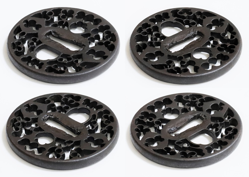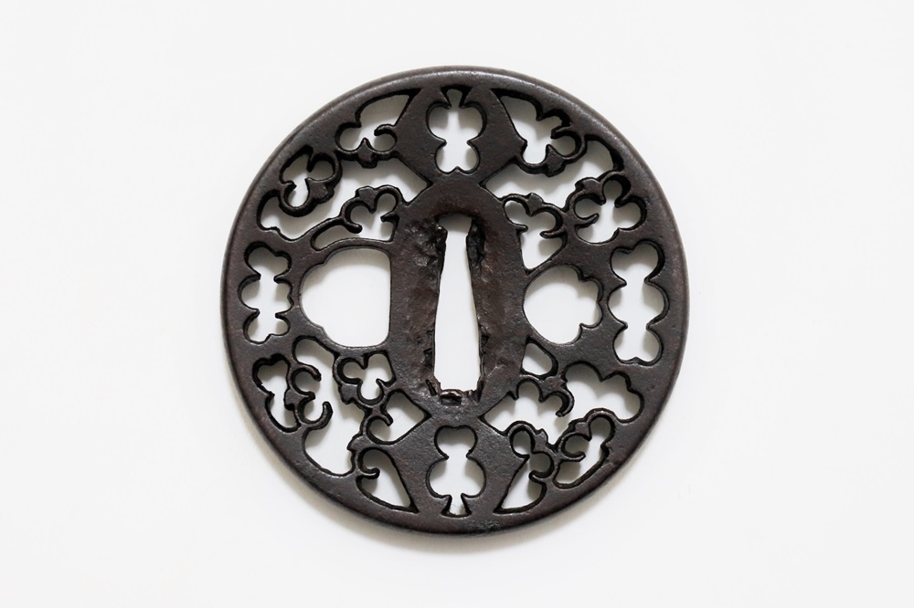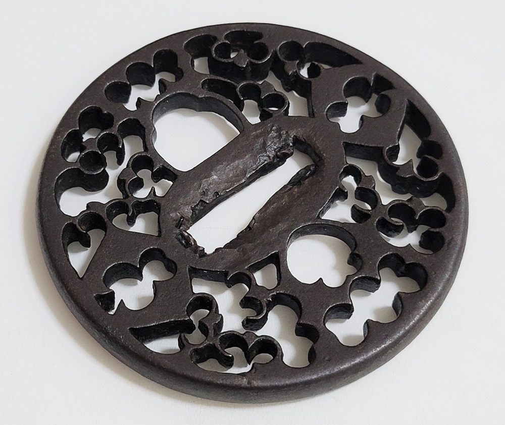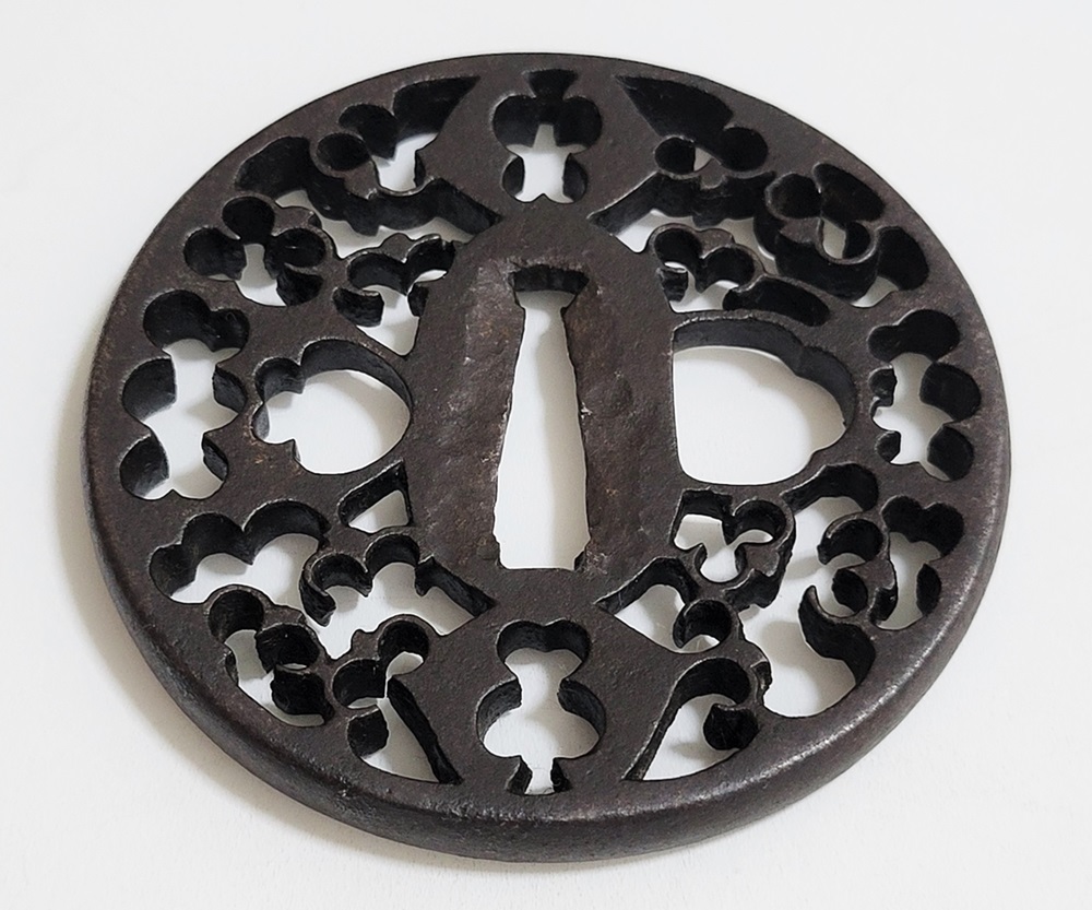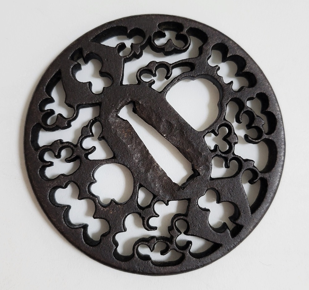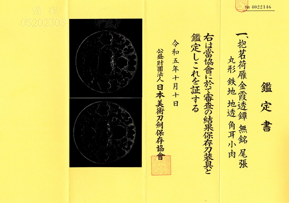 | 尾張と極められた厚手、大振り、丸形、鉄地、角耳小肉、地透鐔。精良な地鉄には深みがあり、耳に鉄骨があらわれ重厚で骨太。中低(なかびく)が顕著な造込み。構図は抱茗荷と雁金の対称的な透に見えるが精察すると微妙に違えている。地透鐔の優品。2024年保存刀装具審査合格 |