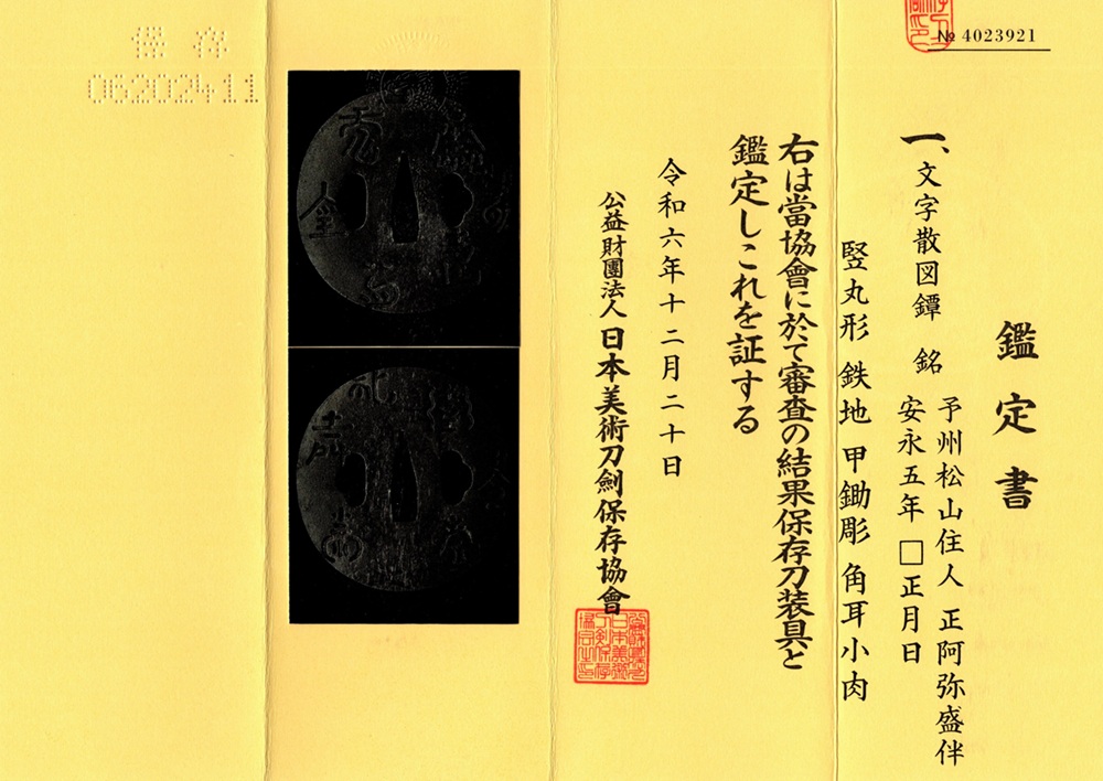 | 伊予正阿弥は、豊臣秀吉の重臣加藤嘉明が慶長八年(1603)松山に入城の際に、京都から京正阿弥を招いたことに始まるといわれる。銘において、予州正阿弥一派は「予州」の「州」の字はすべて「刕」字となる。本作の盛伴は「盛」通字とする盛某の一門。安永五年(1776)の年紀入作。2024年11月刀装具審査で保存合格。 |