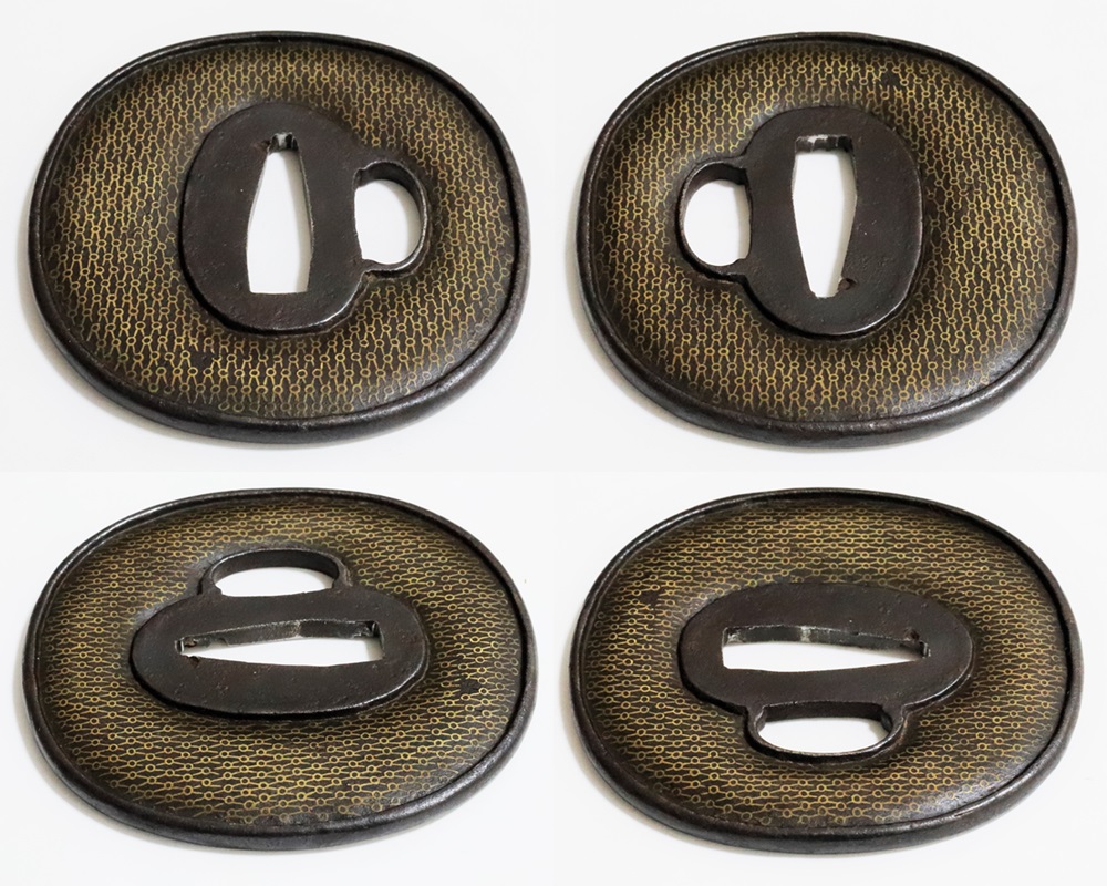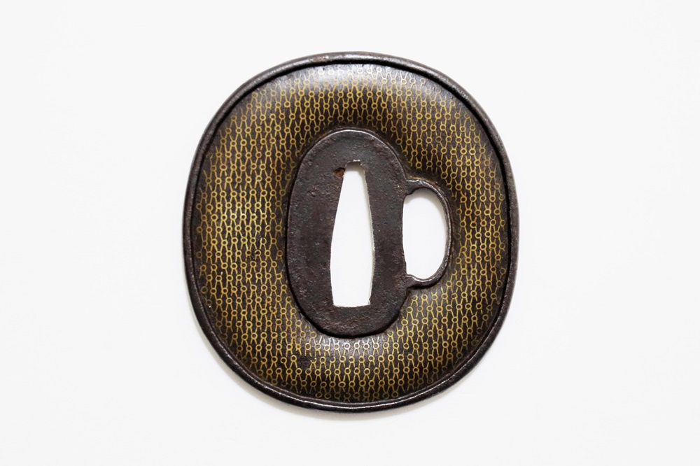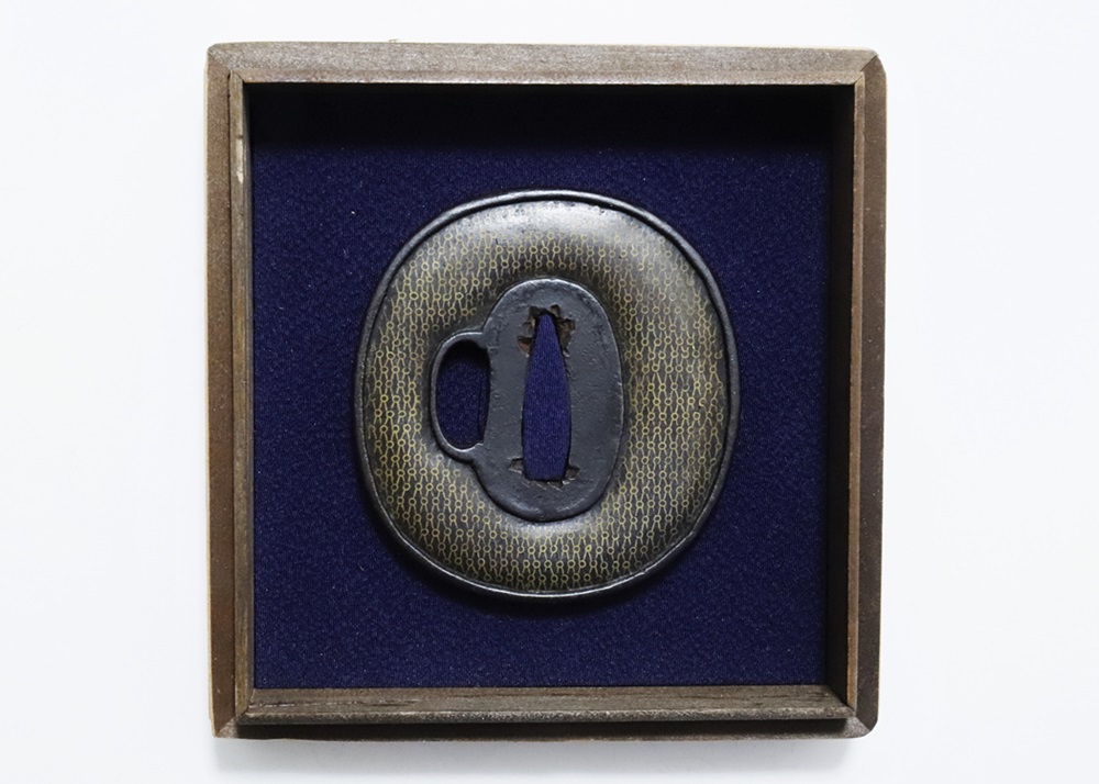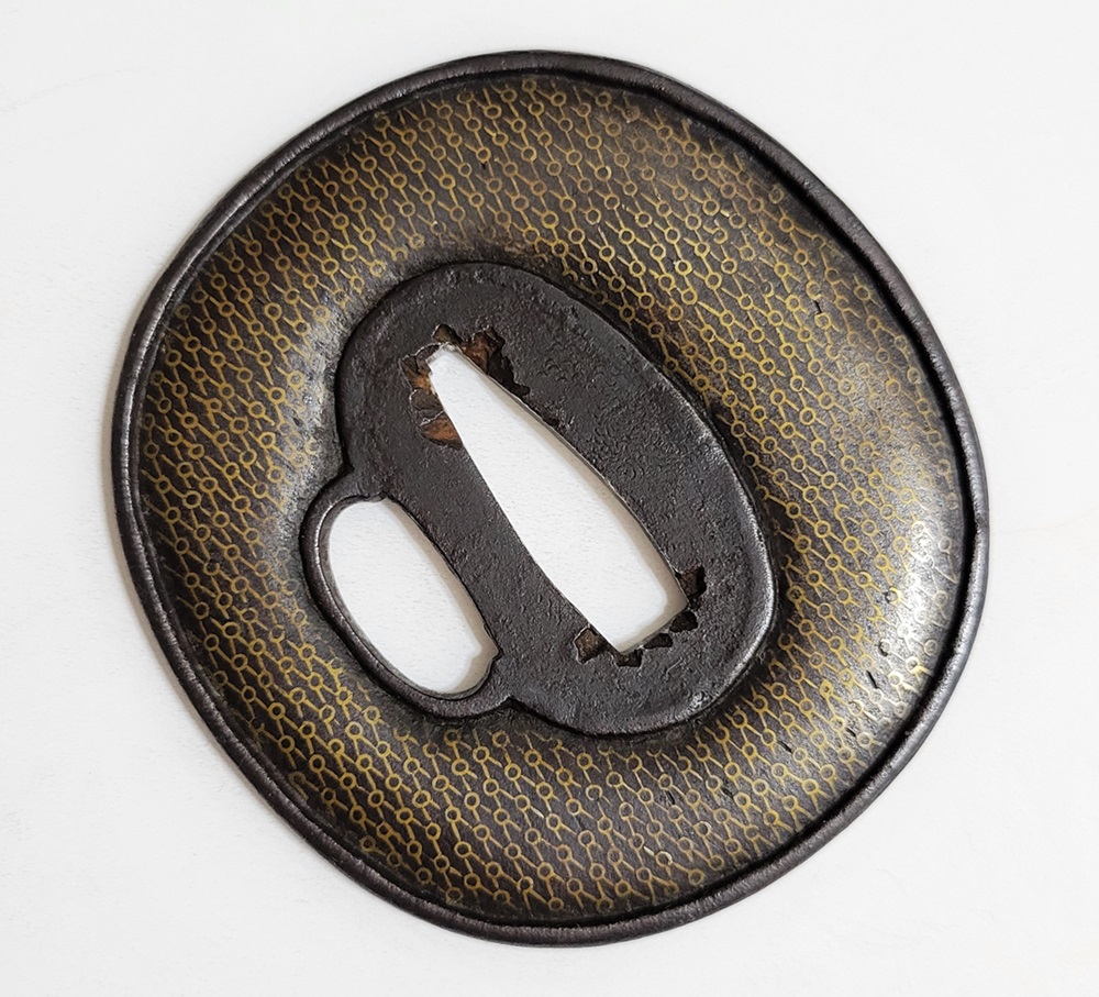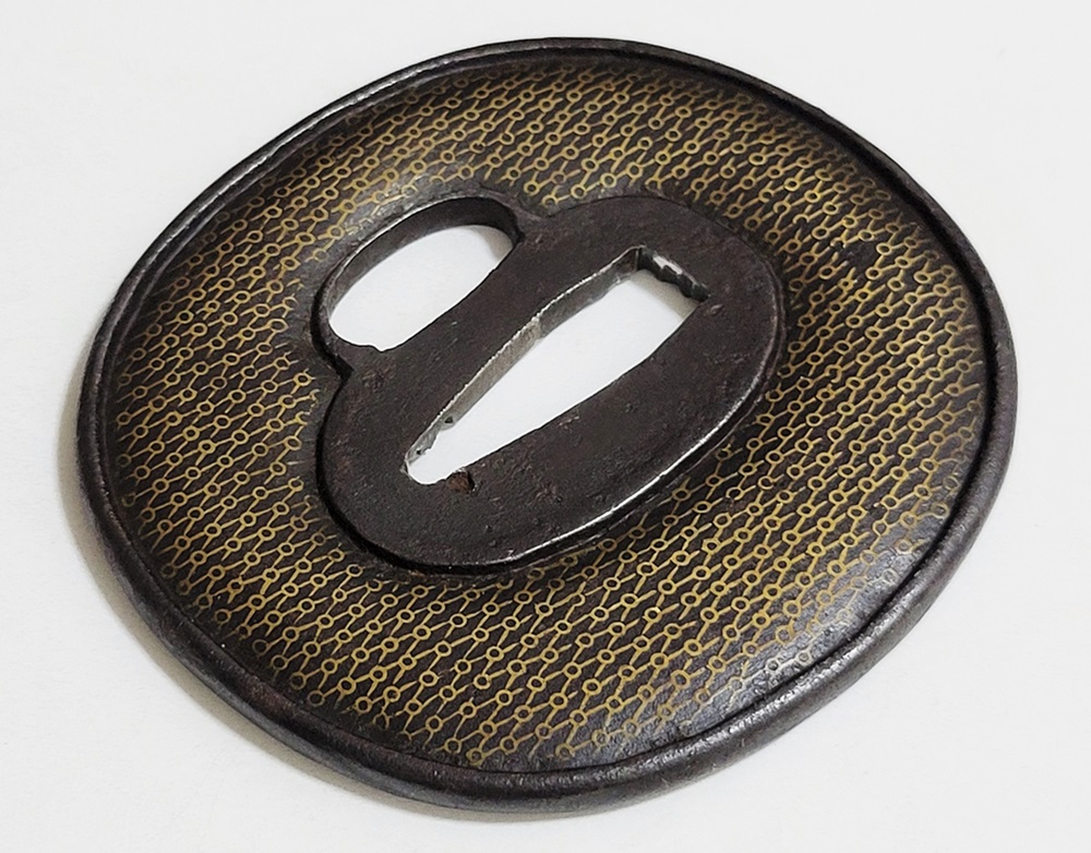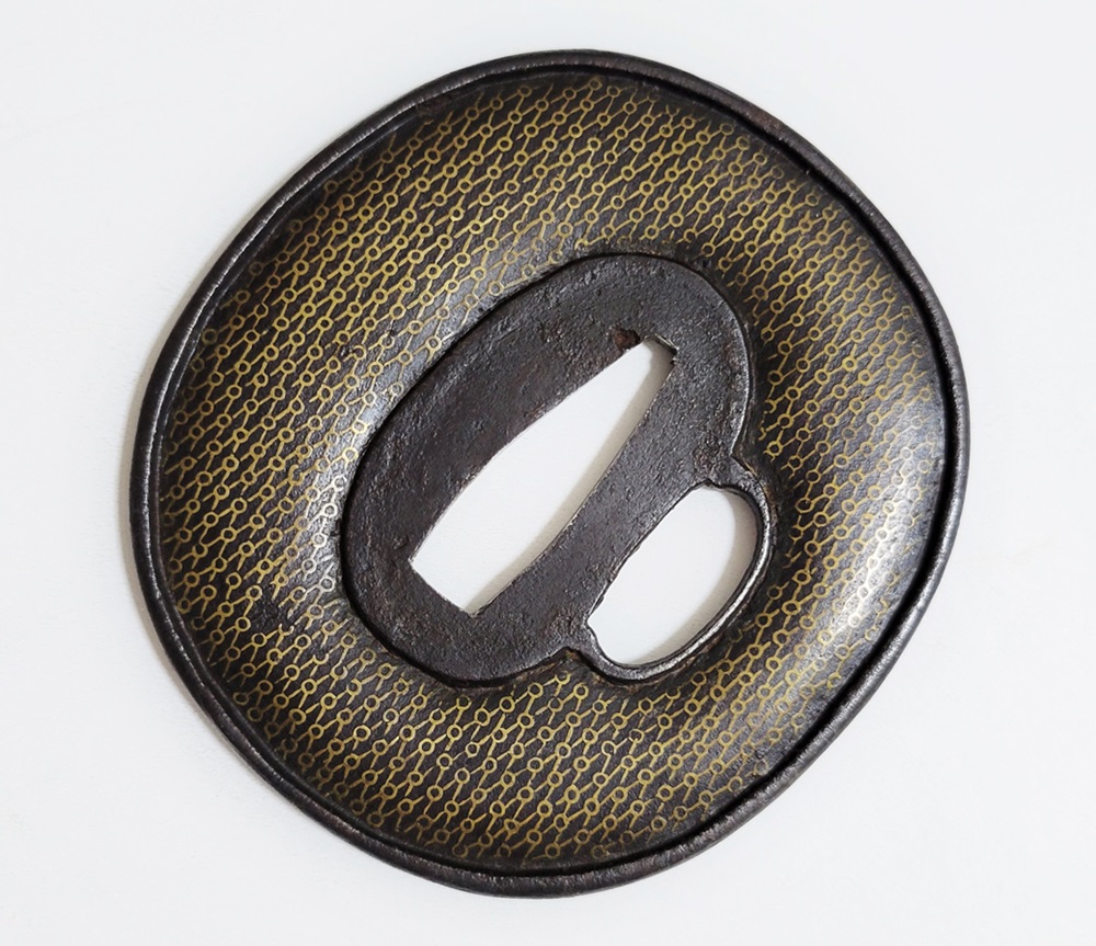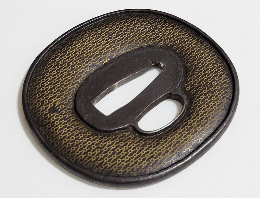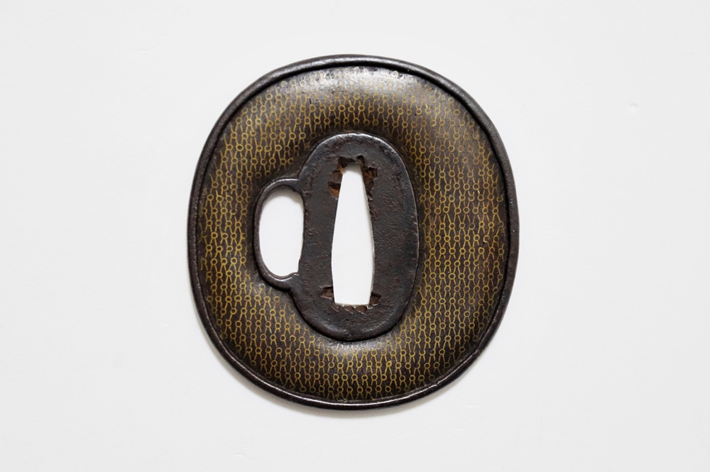 | 網目紋は結ばれて離れないことをあらわす吉祥紋。また一網打尽で一度に全てを捉えることから勝利を意味し武将に好まれた。本作は「庄内」と極められた真鍮平象嵌の網目図鐔。出羽国庄内は現在の山形県鶴岡市を拠点とした地域。酒井家十四万石が藩主の庄内藩城下町で、古くは羽黒山僧侶の作と伝わる数珠鐔、江戸時代後期には奈良風を庄内に広めた珍久やその弟子で後に娘を嫁にした安親(初代)、鷲田光仲や桂野赤文などを始め著名な金工が出現した。作風は進取の気性が窺われ、本作も鉄平地を鋤下彫して立体感のあるめずらしい肉置きをあらわしている。保存鑑定書付。 |