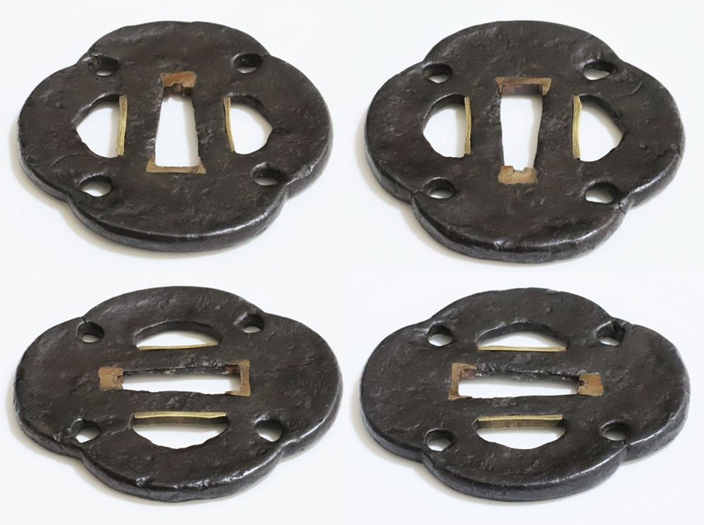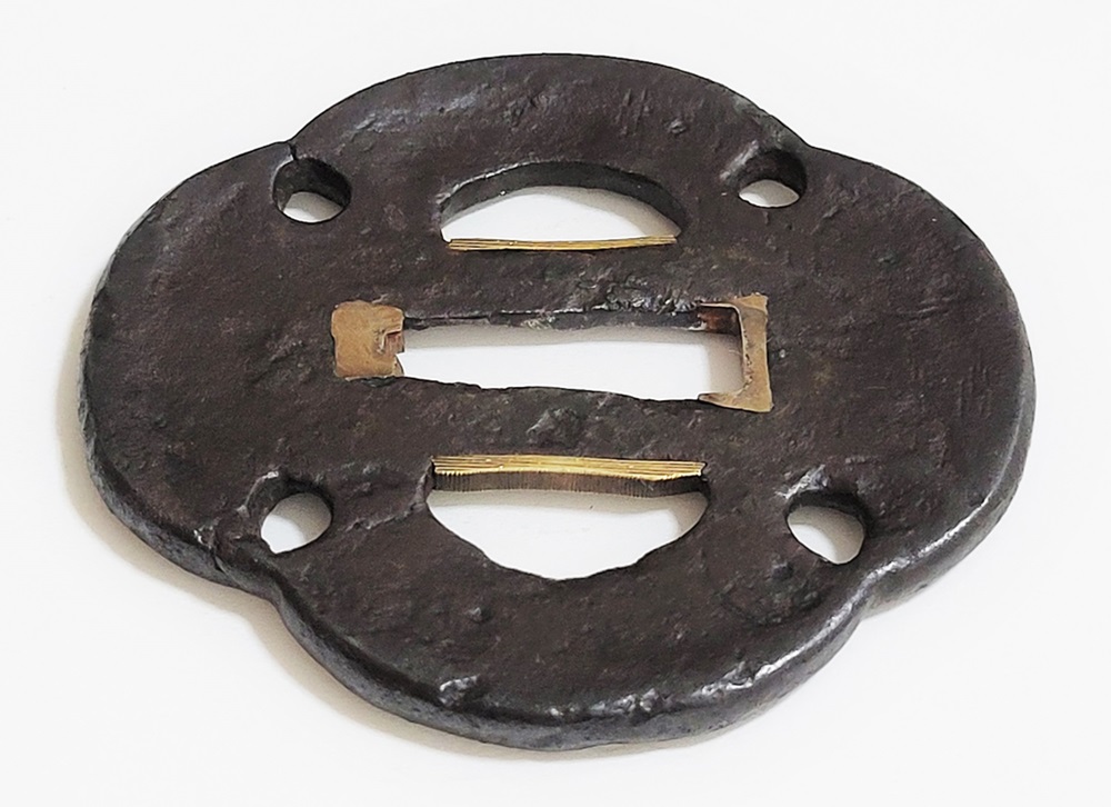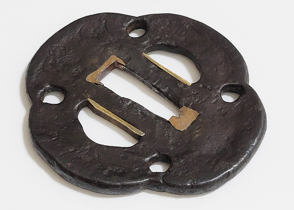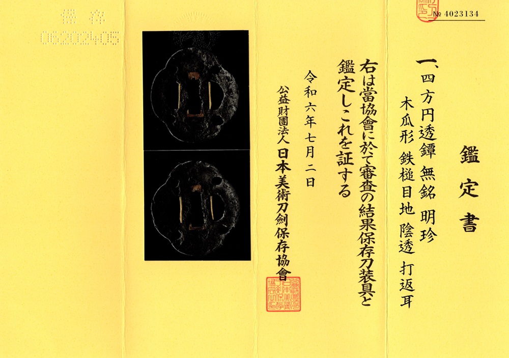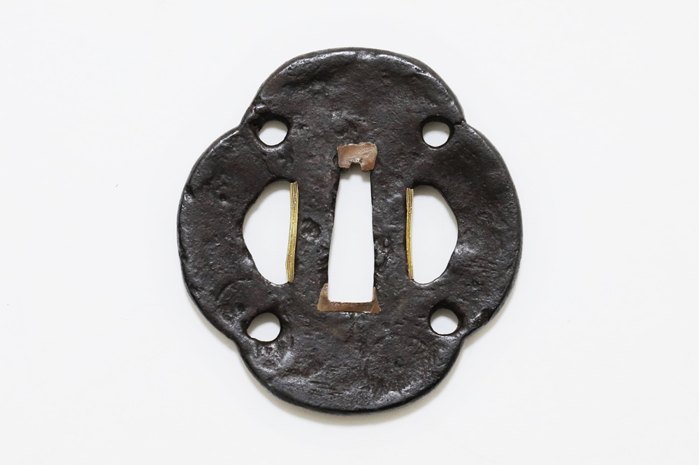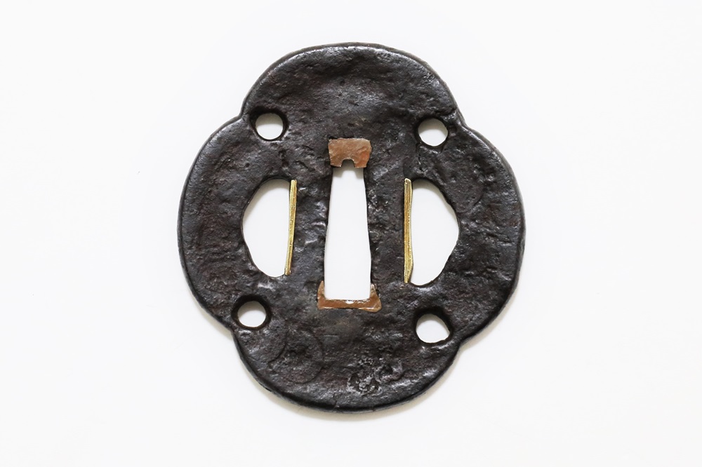 | 本作は耳に鉄骨があらわれ中低の造込みであることから尾張系統と思料するが、2024年5月刀装具審査で明珍と極められた。明珍家は古くは鎌倉時代までさかのぼり、甲冑・具足の製作から後代は鐔、鉄製置物、各種鉄工品の製作を全国に分布しておこない幕末まで繁栄する。本作両櫃孔には金の責金が施され伝来を思わしめる作。 |