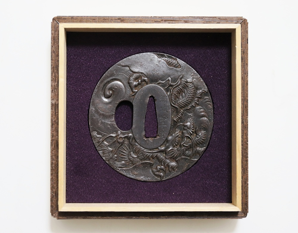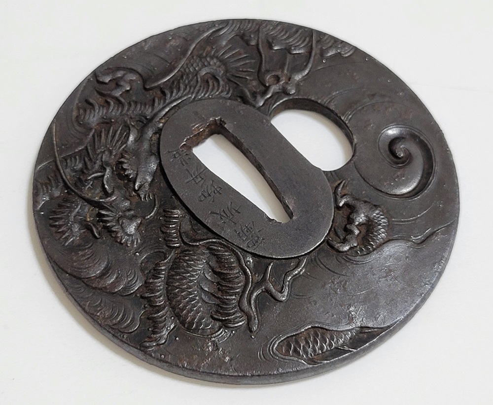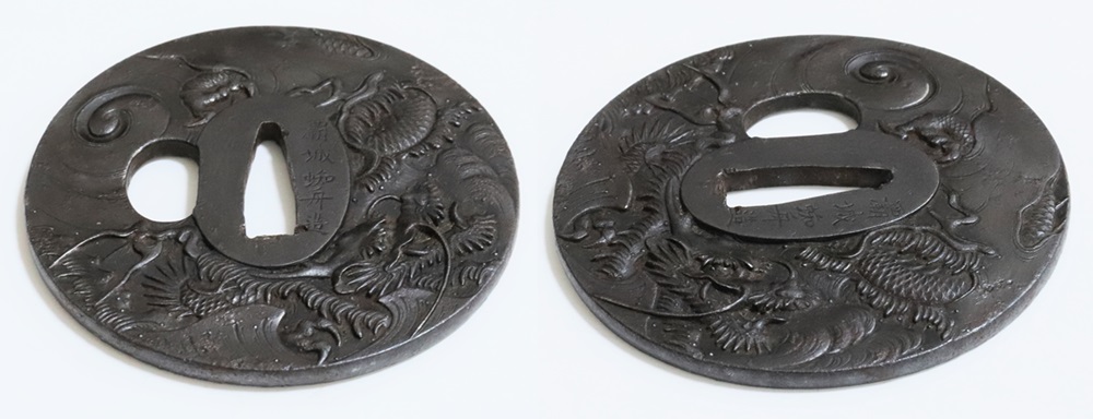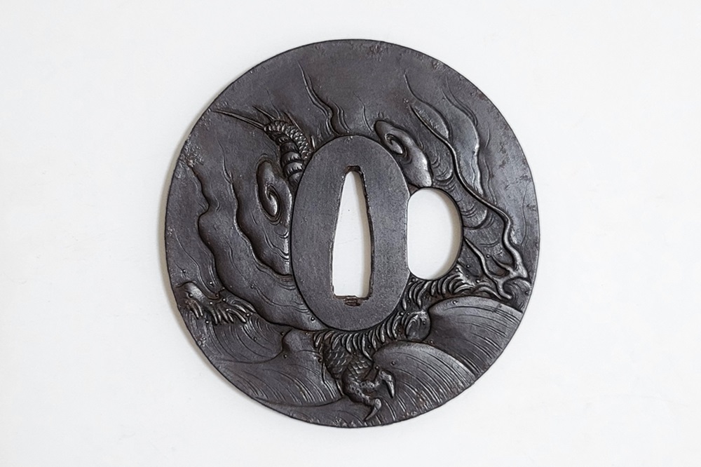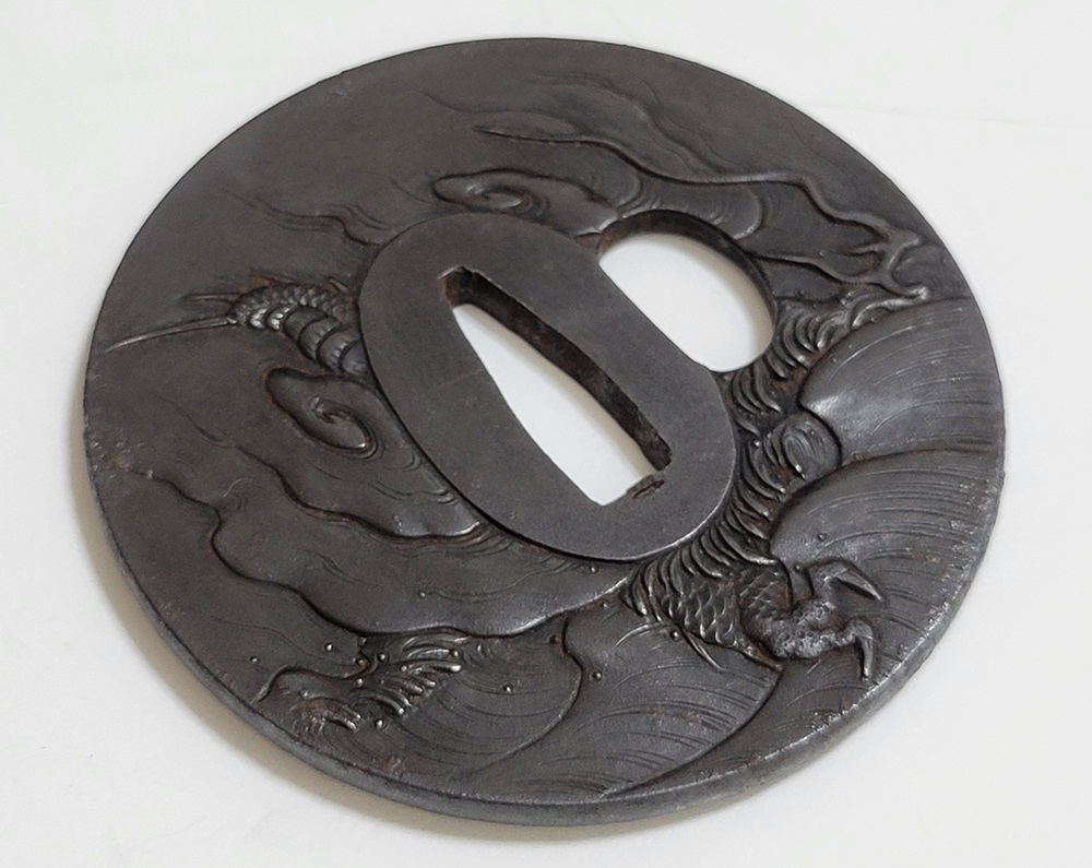 精巧な鋤出高彫で波濤雲龍図をあらわす。作者の蜘舟は、長州を意味する「覇城」を用いており、岡本家五代で毛利家抱工の知賢(ともかた)門人か。「知周」等の銘を当て字で切ったか。めずらしい銘の迫力見応えある長州鐔。2024年特別保審査存合格。