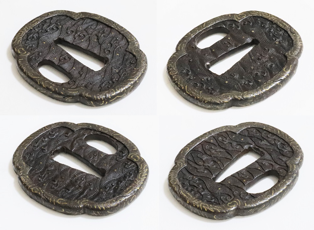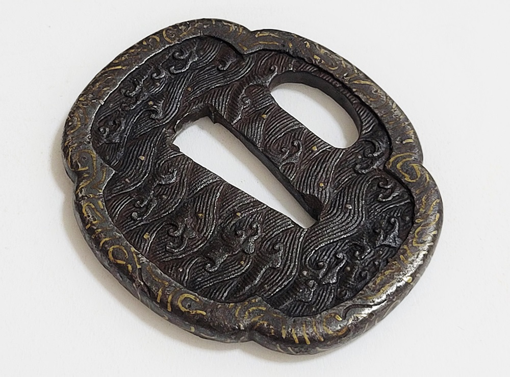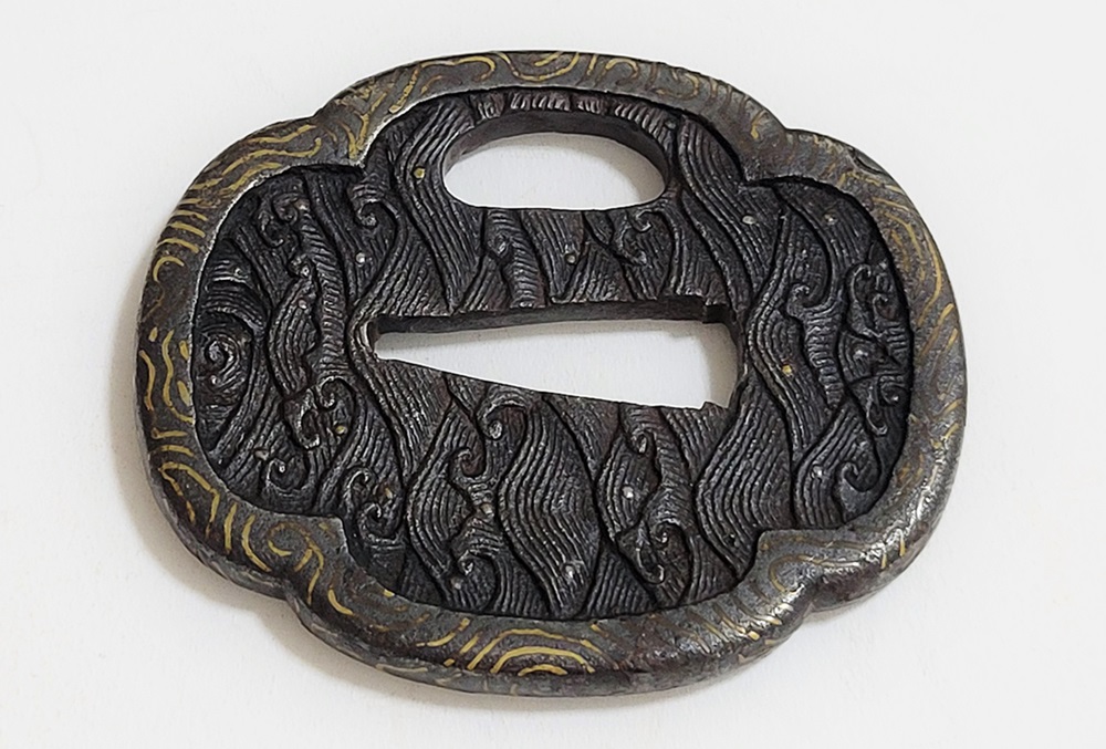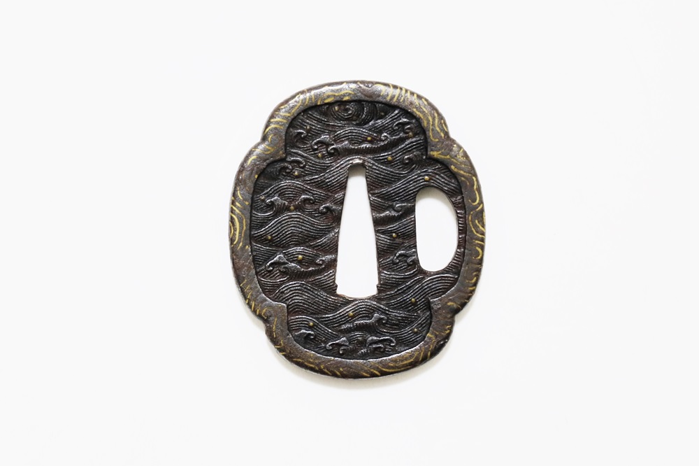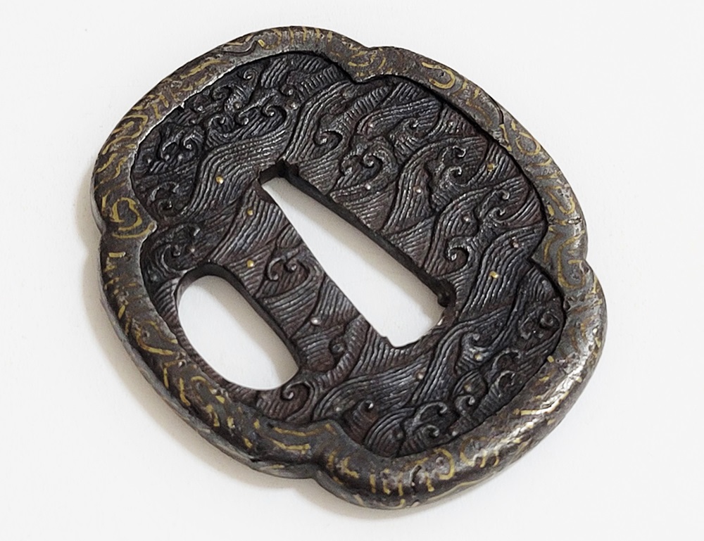| 波は寄せては返し果てることがなく、吉祥文様として、永遠・不滅・長寿・誕生など未来永劫や永遠の平安の意味がある。本作は、平地に鋤出毛彫で波濤をあらわし、飛沫の露象嵌、土手耳の与四郎風象嵌を真鍮で施す喰出鐔。 |