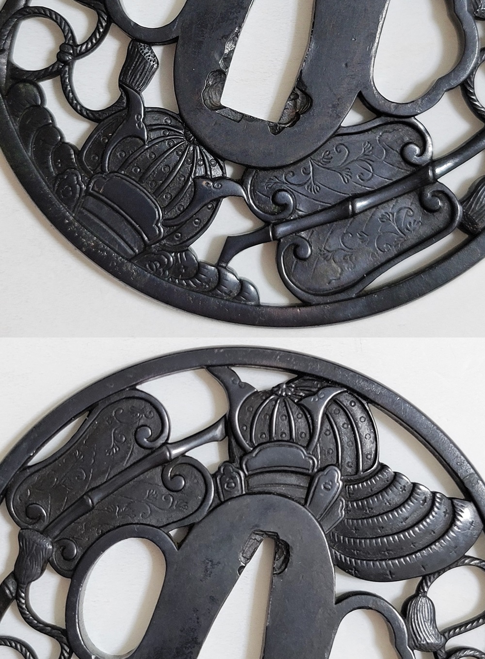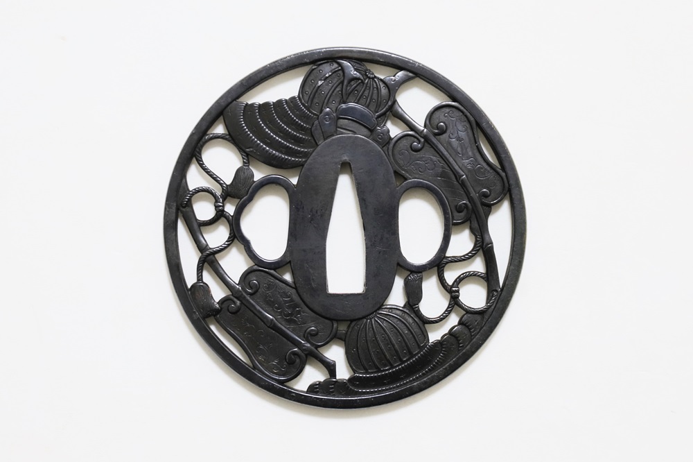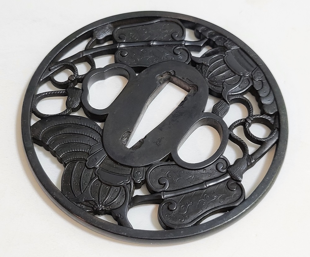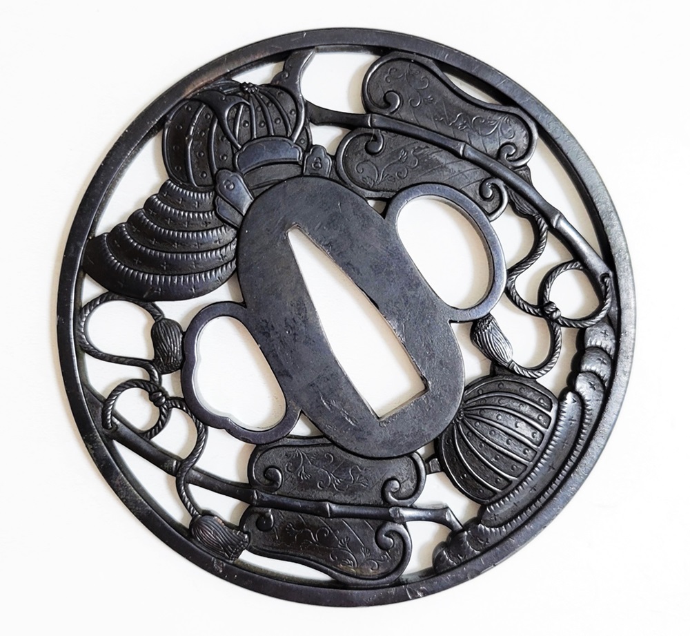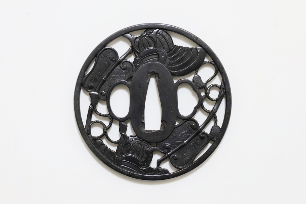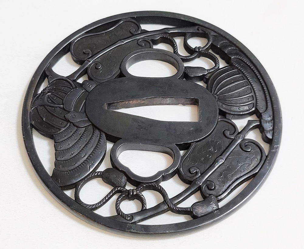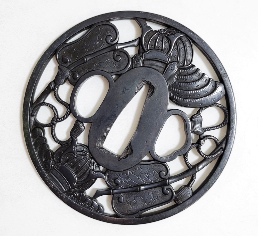 真丸形、赤銅地無色、肉彫透、角耳小肉の長州に極められた兜軍配透鐔。精巧で重厚感あり優美高尚。2024年特別保存審査合格。