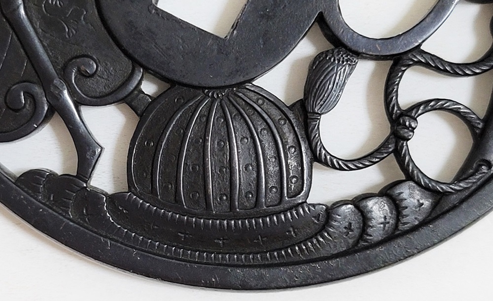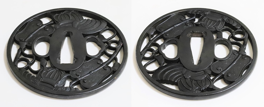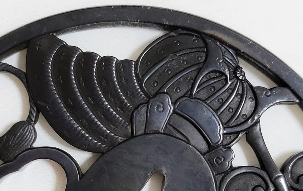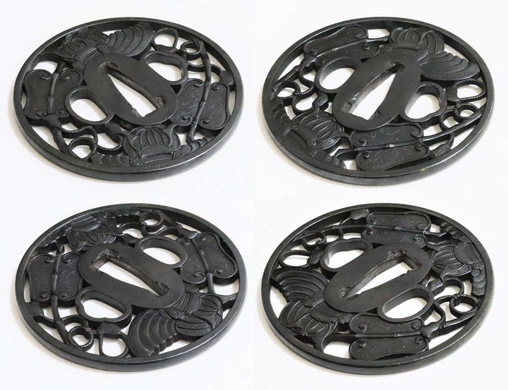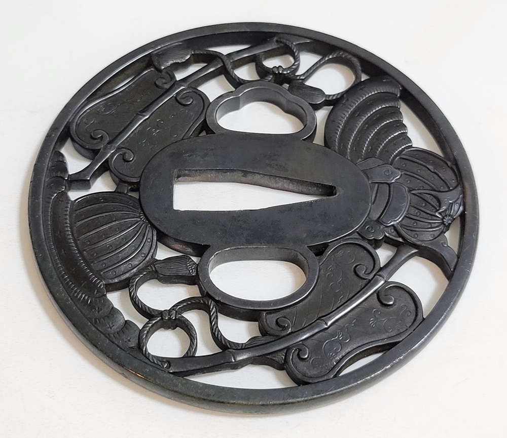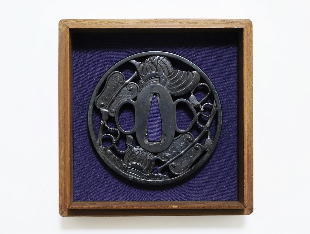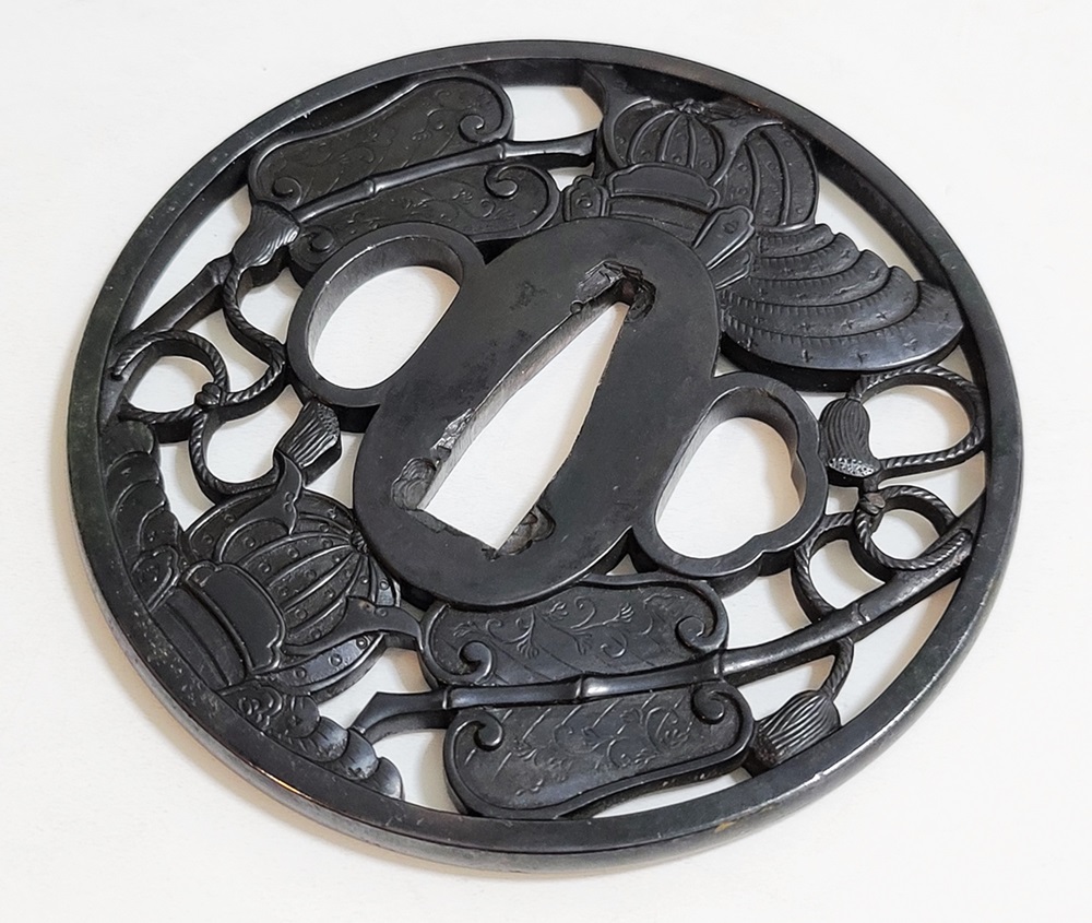 真丸形、赤銅地無色、肉彫透、角耳小肉の長州に極められた兜軍配透鐔。精巧で重厚感あり優美高尚。2024年特別保存審査合格。