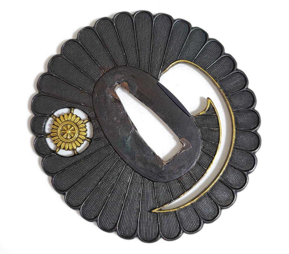 | 埋忠家は装剣金工史における名流。京都名門の生まれで初代といわれる桃山・江戸初期の名工埋忠明寿から江戸後期まで続き、その末流は全国に移住し繁栄した。特徴は、赤銅・山銅・真鍮などの変り金を用いて、重ねが薄く小形。高い技術で写実的に色絵平象嵌し優雅で温和な作。本作は赤銅魚子の地菊花に輪宝と巴を透彫りであらわした崇高な鐔。2024年8月審査で埋忠に極められて保存合格。 |