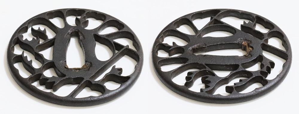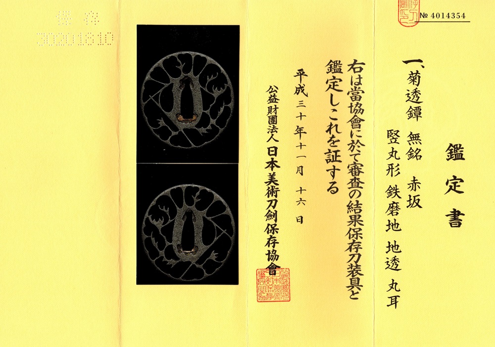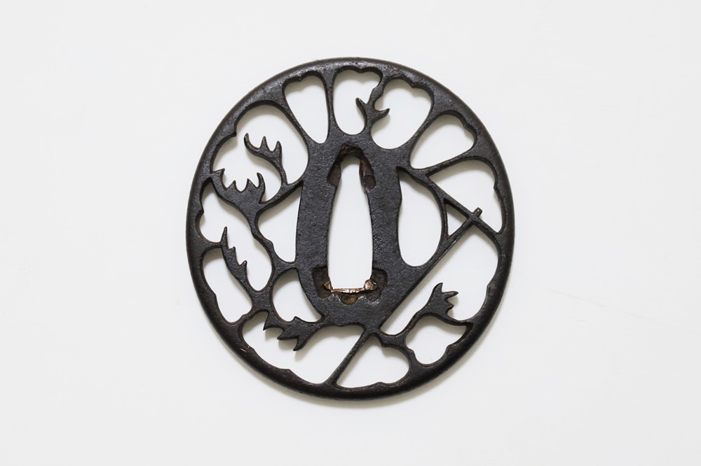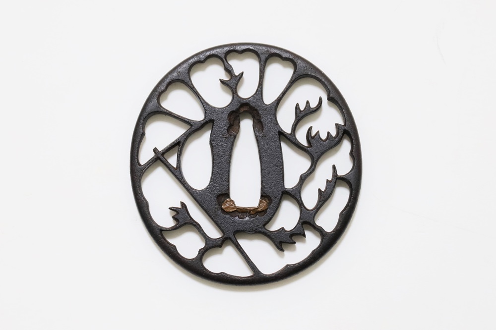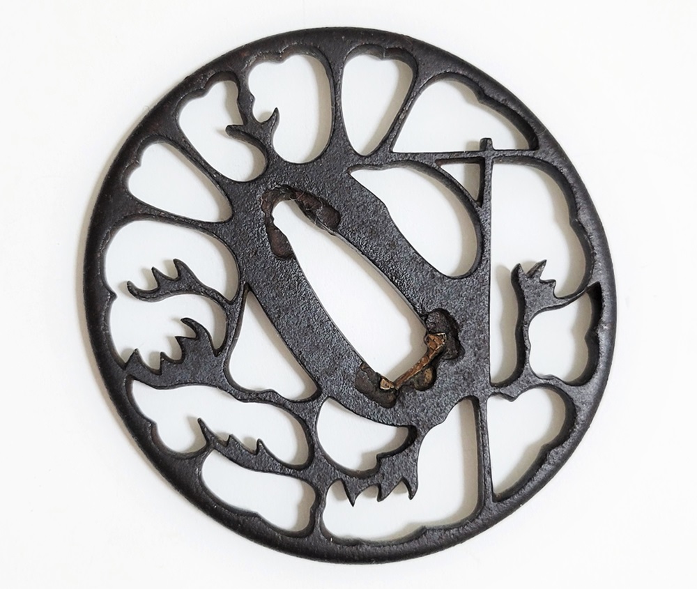 | 洗練された意匠で鉄の鍛がよい赤坂透鐔は、繊細優美な京透や重厚で豪放な尾張透とは異なる。本作は菊花形に内周を透かし、枝葉を地透であらわす菊透鐔。菊花と枝葉の表現が妙で赤坂の洗練感覚があらわれている。2018年保存審査合格。 |