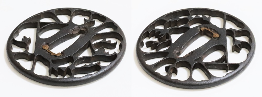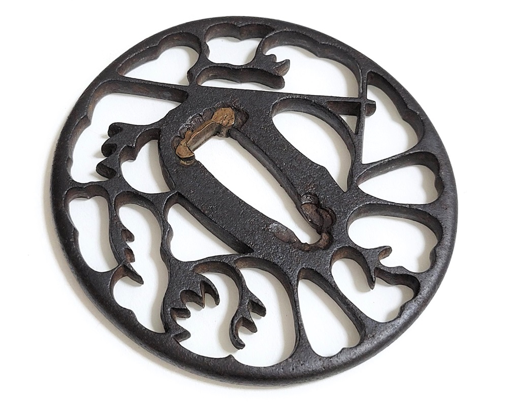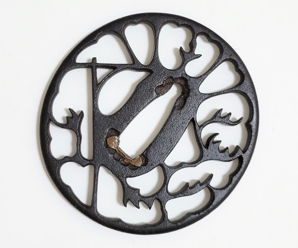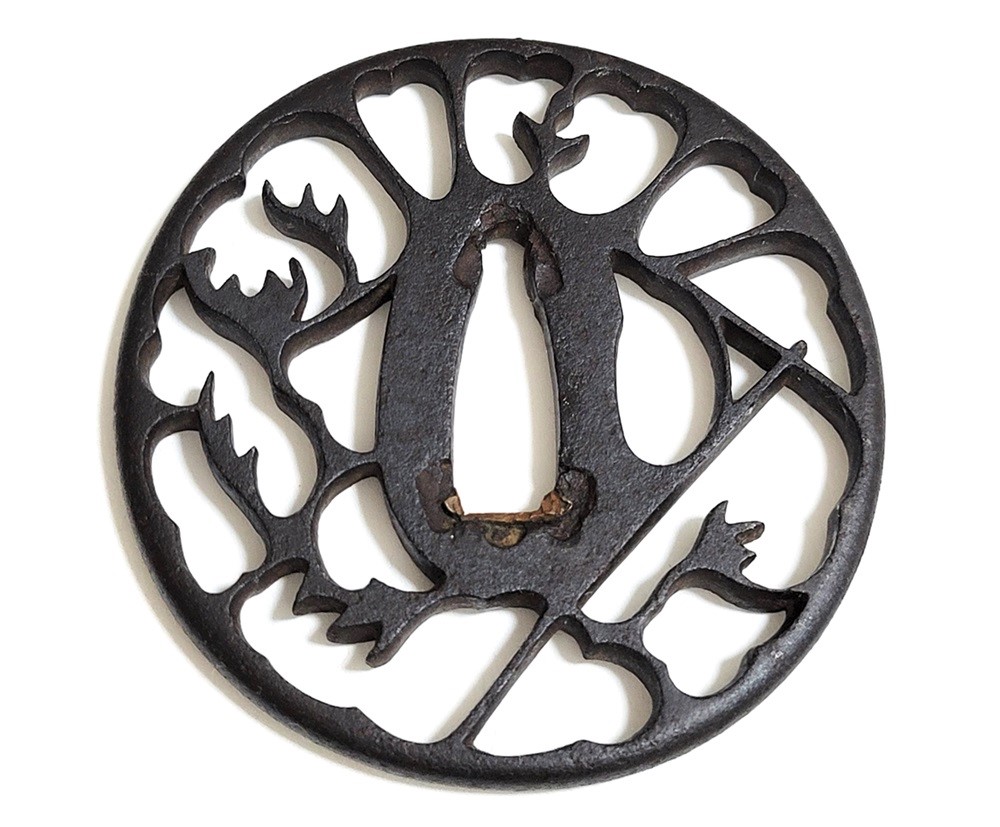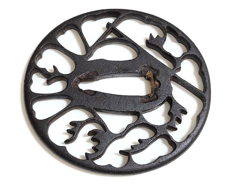 | 洗練された意匠で鉄の鍛がよい赤坂透鐔は、繊細優美な京透や重厚で豪放な尾張透とは異なる。本作は菊花形に内周を透かし、枝葉を地透であらわす菊透鐔。菊花と枝葉の表現が妙で赤坂の洗練感覚があらわれている。2018年保存審査合格。 |