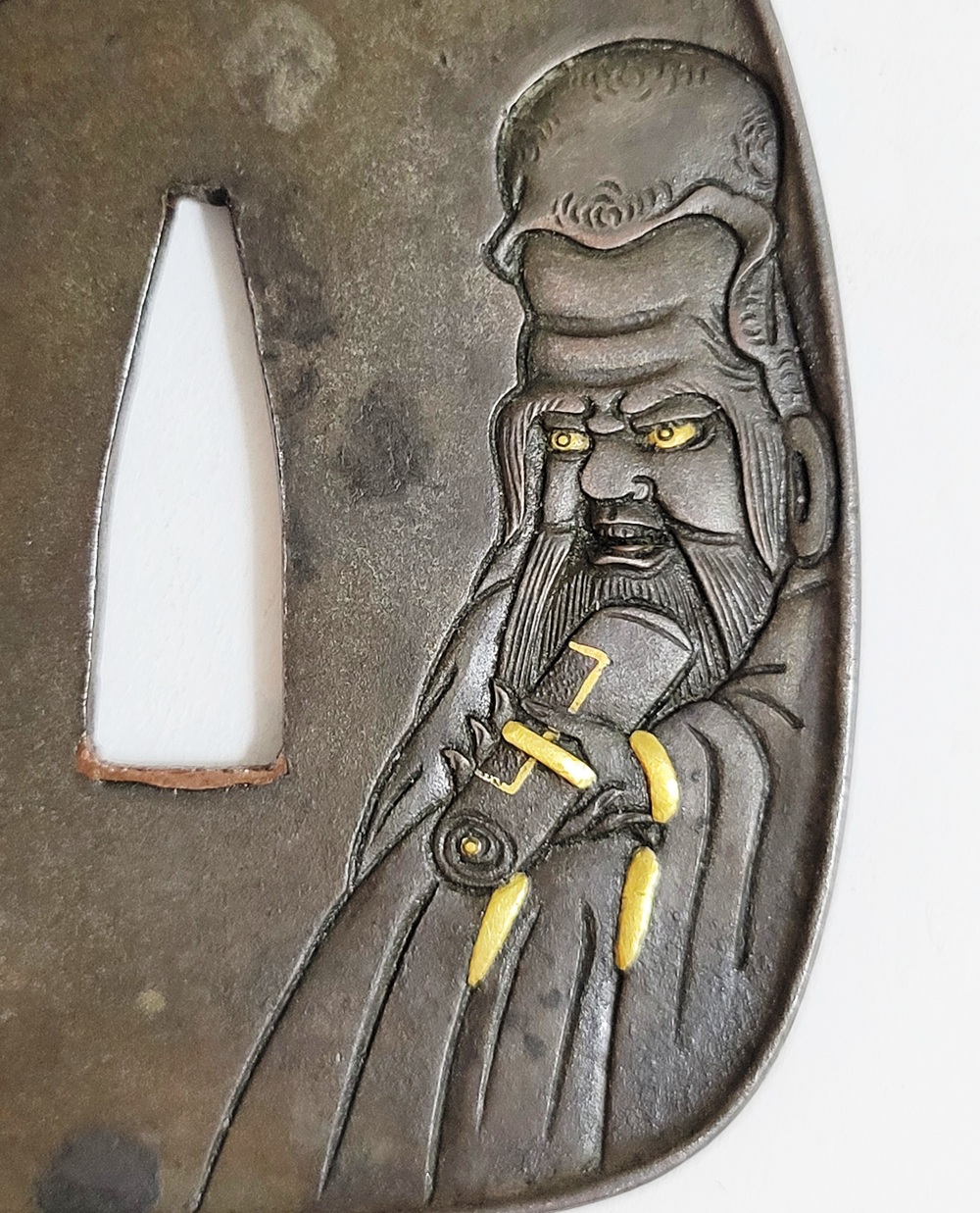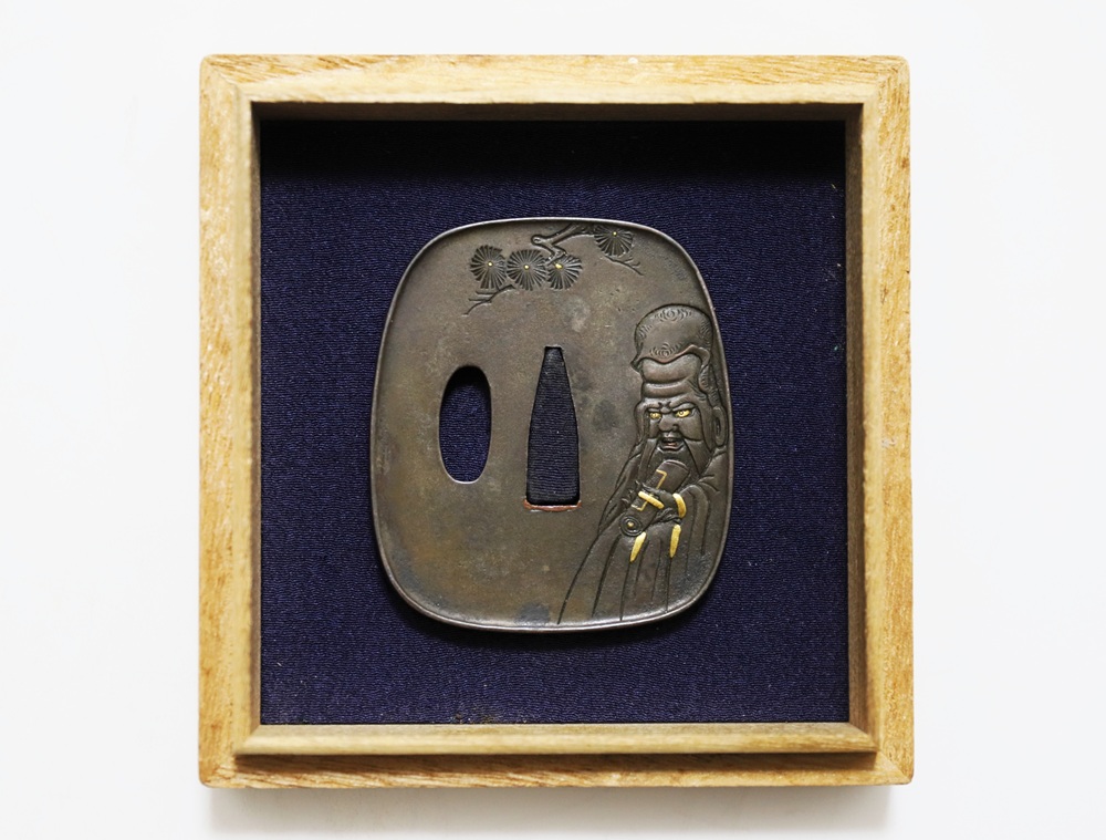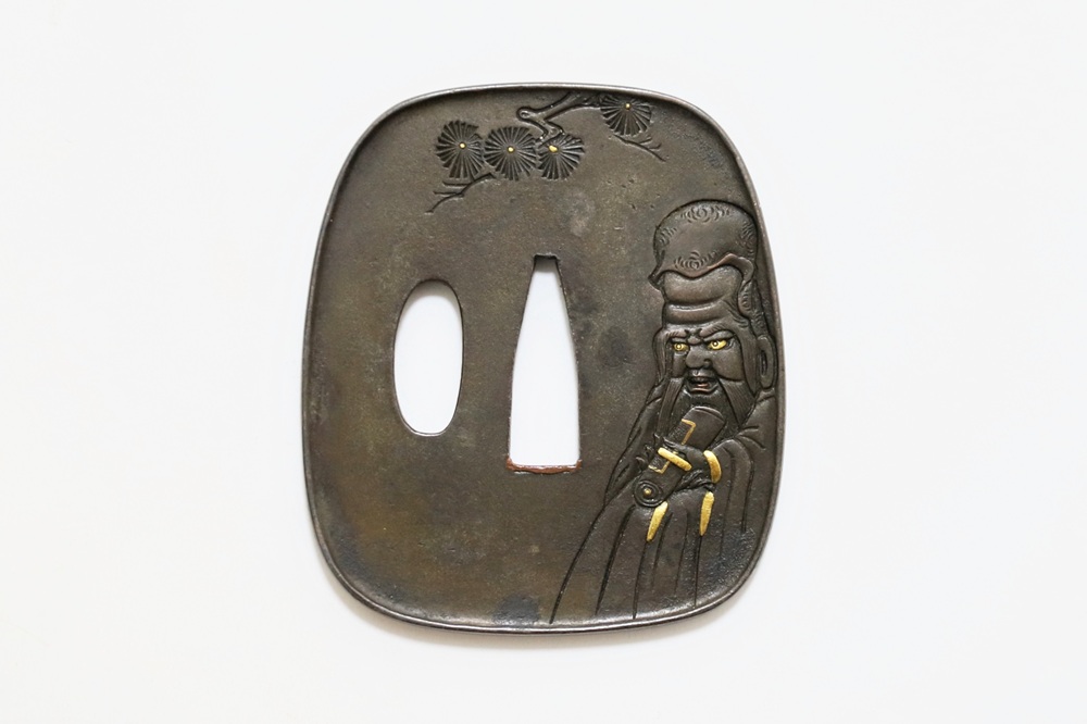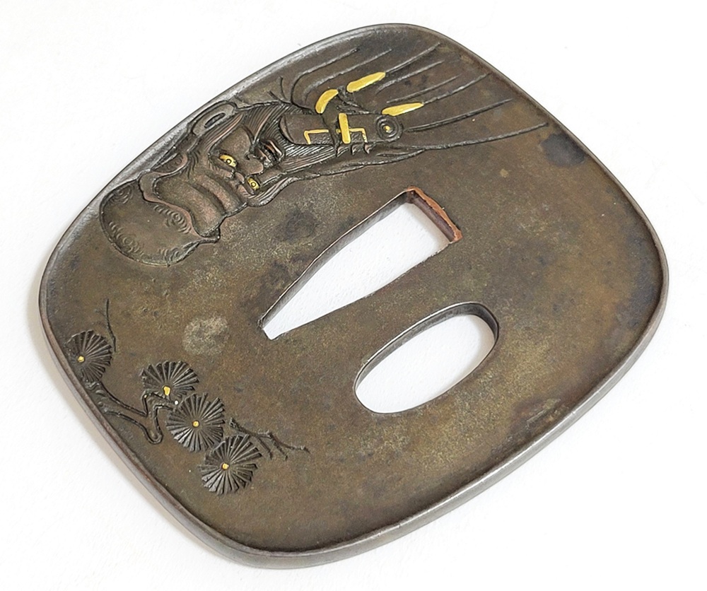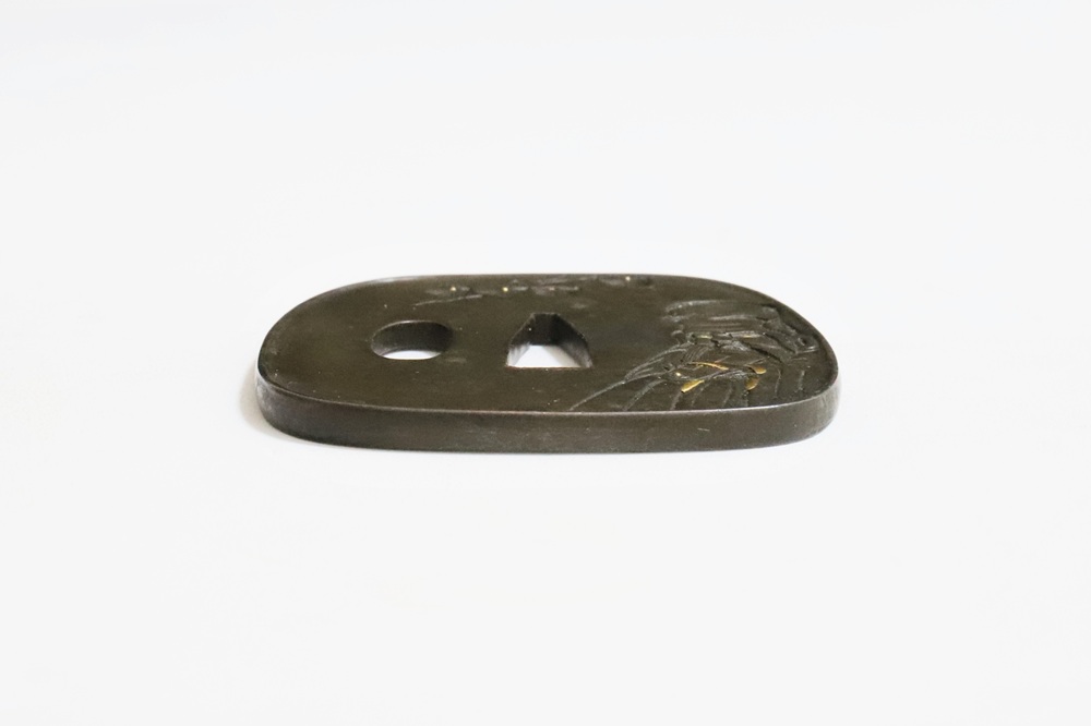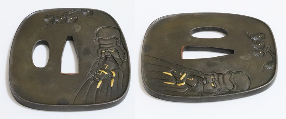 | 無銘ながら岩間派と極められた福禄寿鐔。岩間派は浜野本家で学んだ岩間政盧(まさよし)(明和元年1764・江戸下谷生)を祖とし、信随(のぶゆき)、信盧(のぶよし)、尚盧(たかよし)ら岩間の苗字を許された門弟と共に政随風の高彫工法で主に和漢の人物図作を成す。本作は、厳しく威厳ある顔を端正な彫であらわす。平成28年(2016)保存審査合格。 |