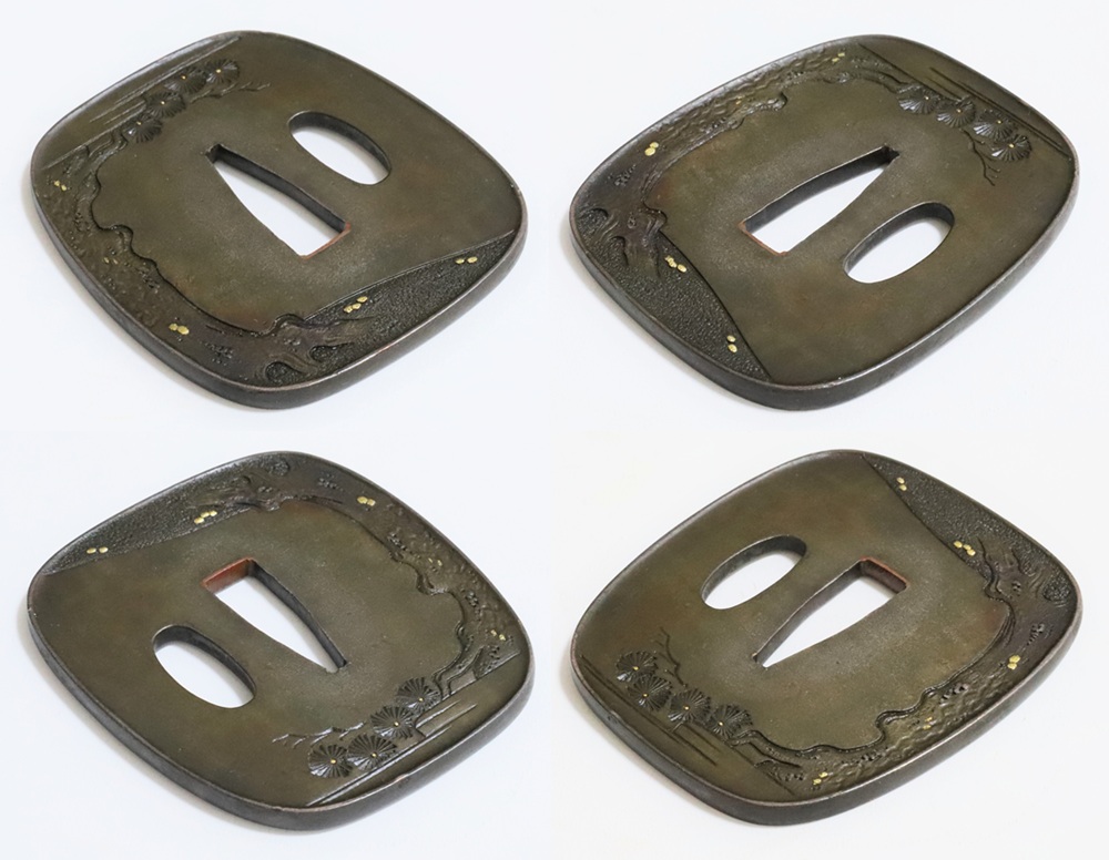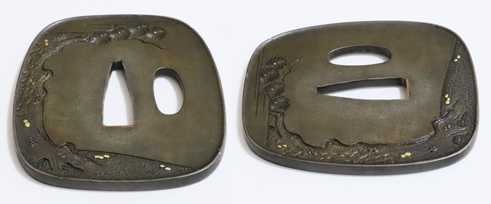 | 材質 | 四分一荒し地 障泥形 肉合彫 象嵌色絵 打返耳 |