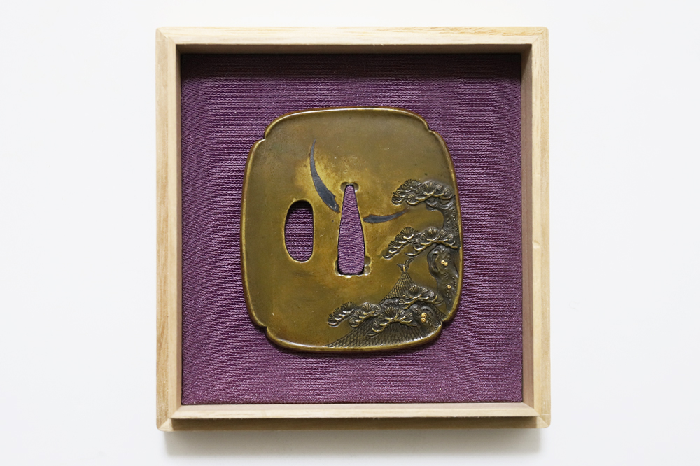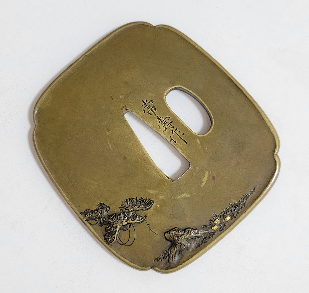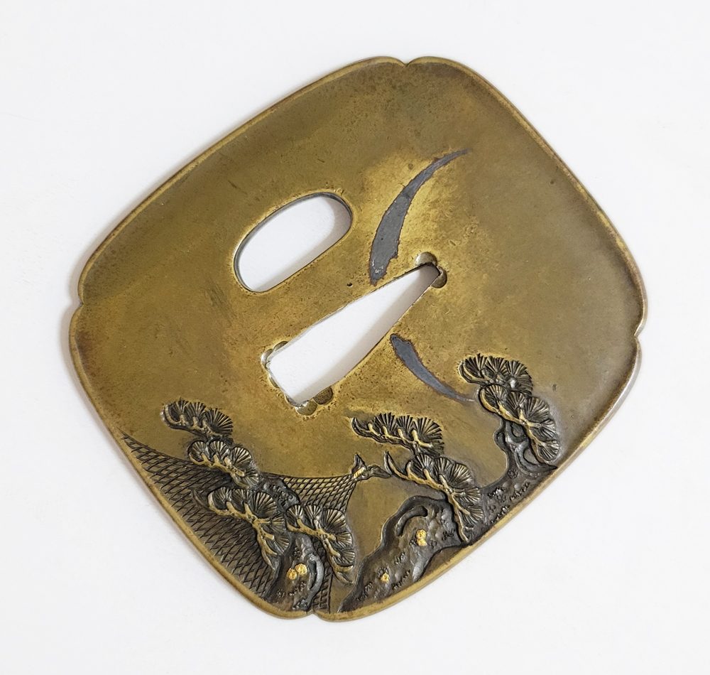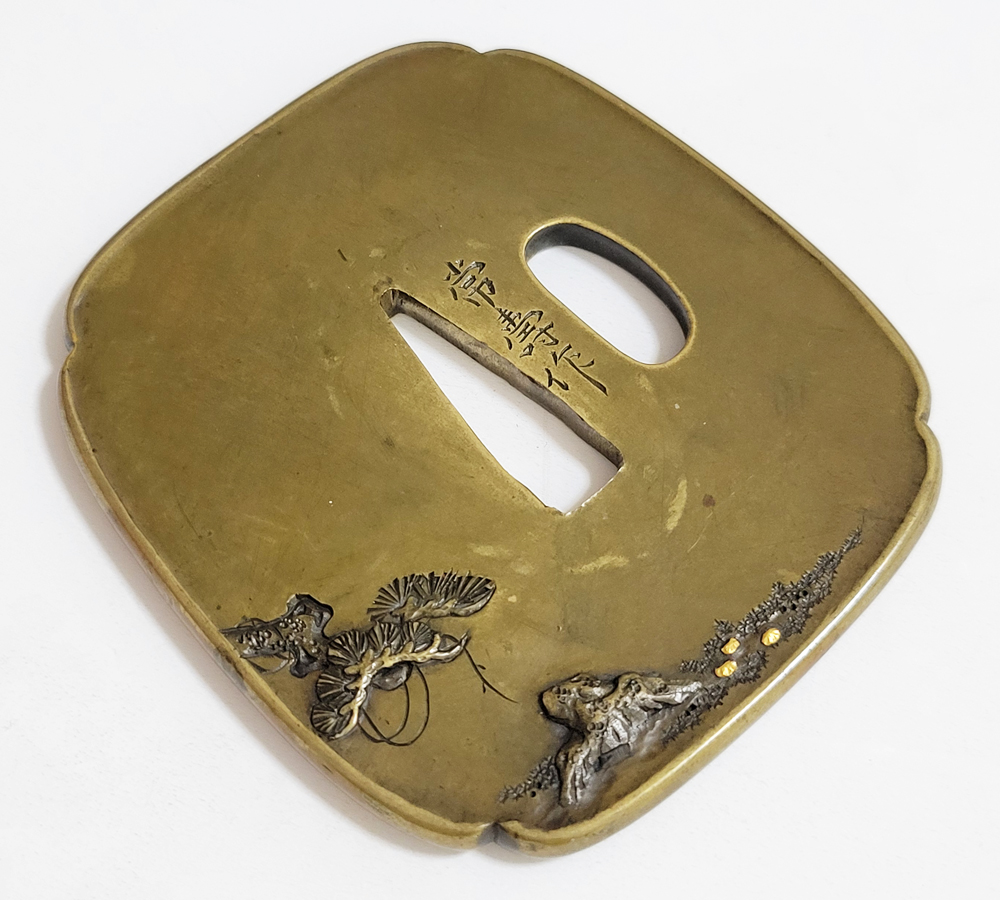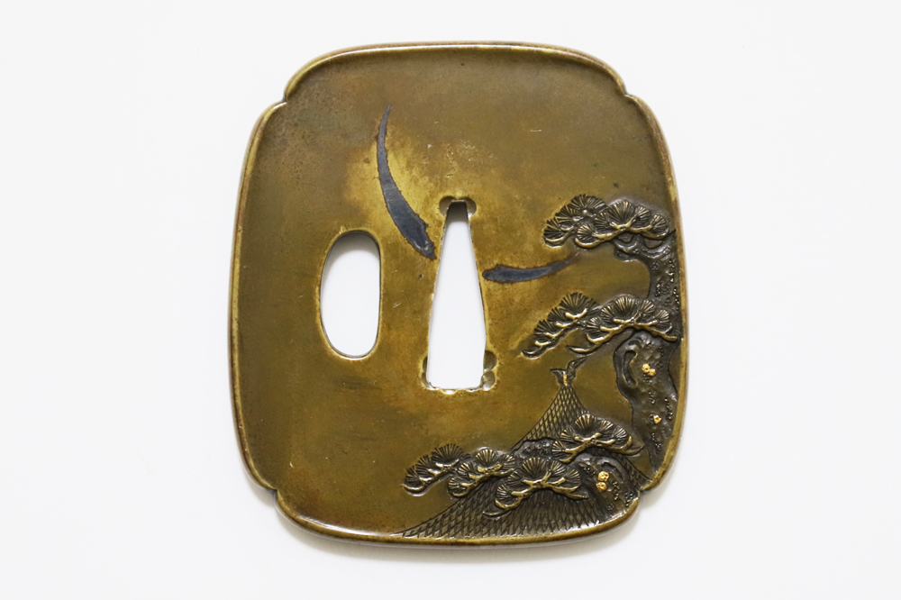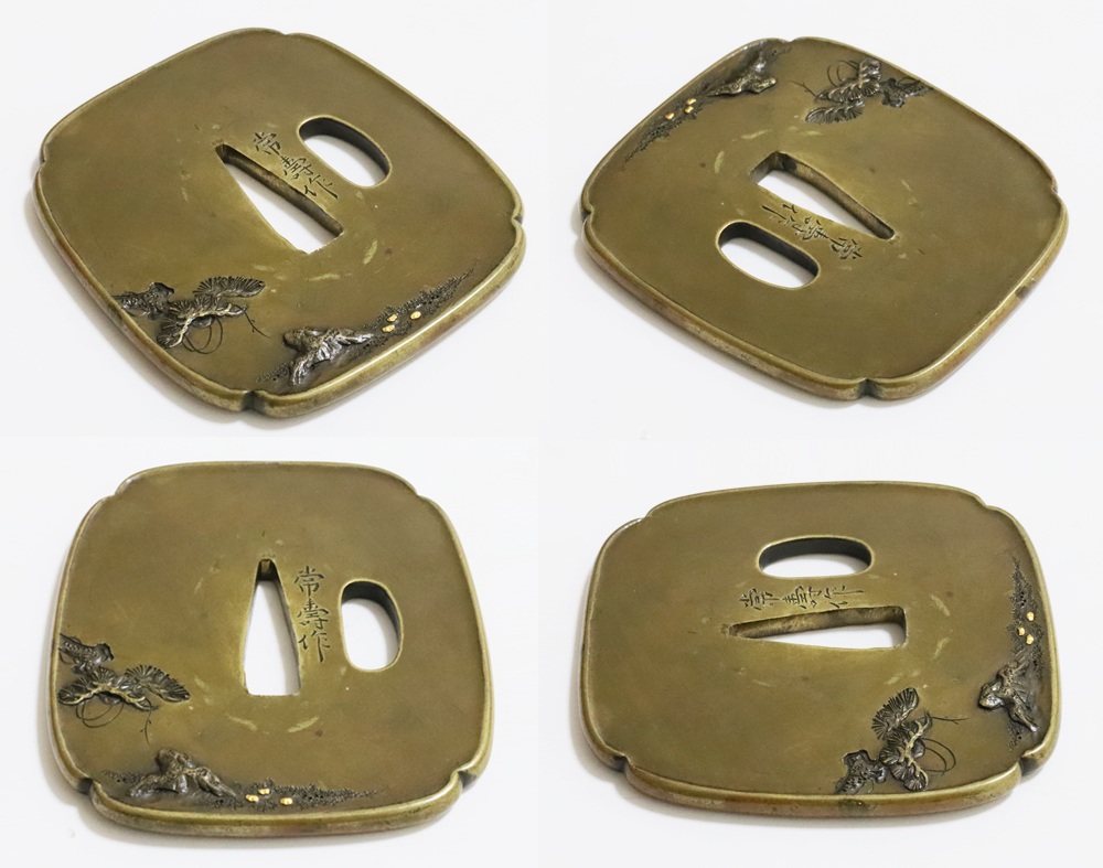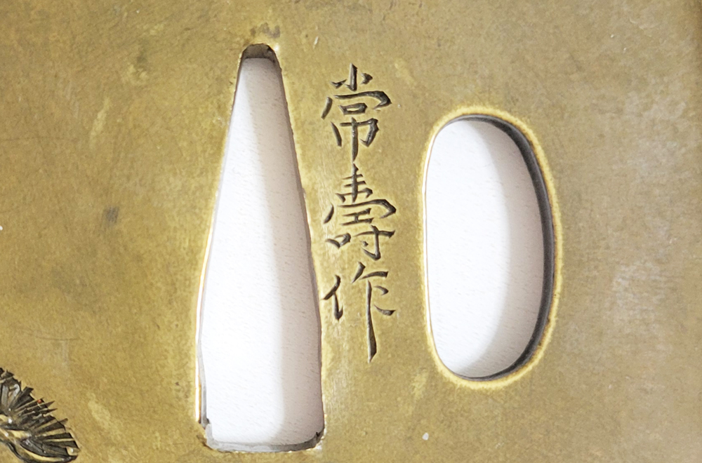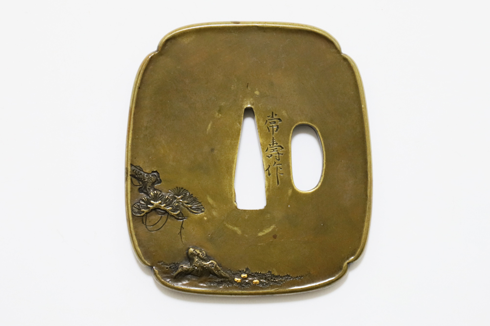 | 常寿は小熊氏。小熊派の初代。伊達家の抱工。陸奥国仙台住。江戸の田中清寿門下で高彫色絵の工法を学ぶ。号は東藁斎・東洞子・東洋斎。天保六年(1835)48歳没。子に同じく伊達家藩工で田中清寿に学んだ寿興がいる。本作は干し網と松上の三日月を茎孔を跨いで銀平象嵌であらわす奇抜な意匠で出来が良い。2024年保存審査合格。 |