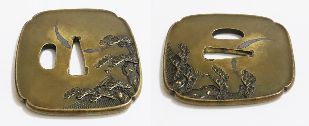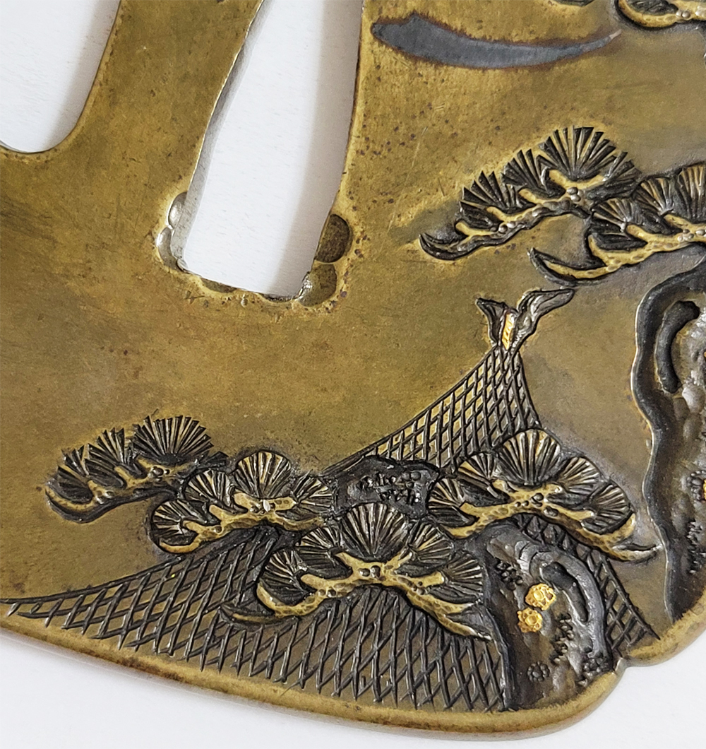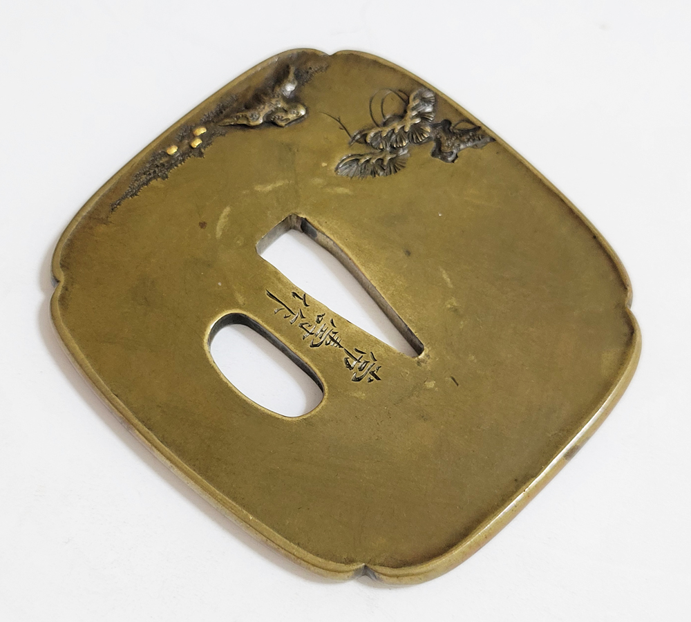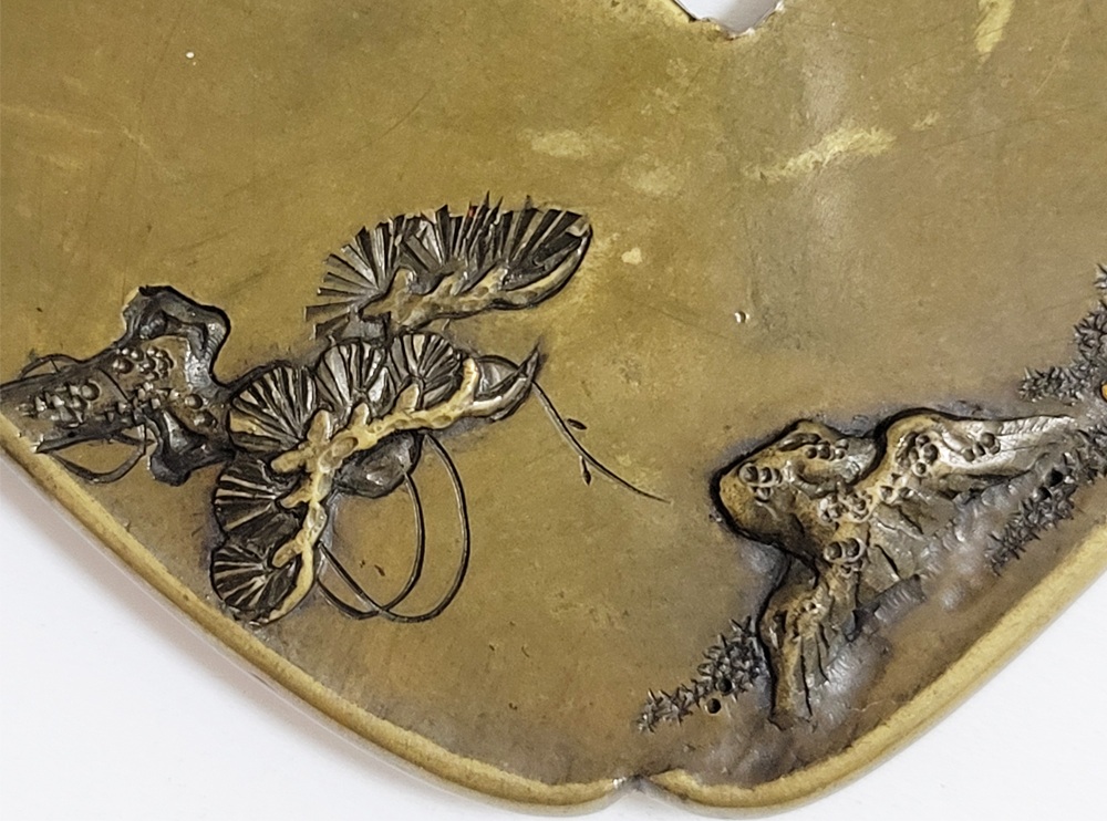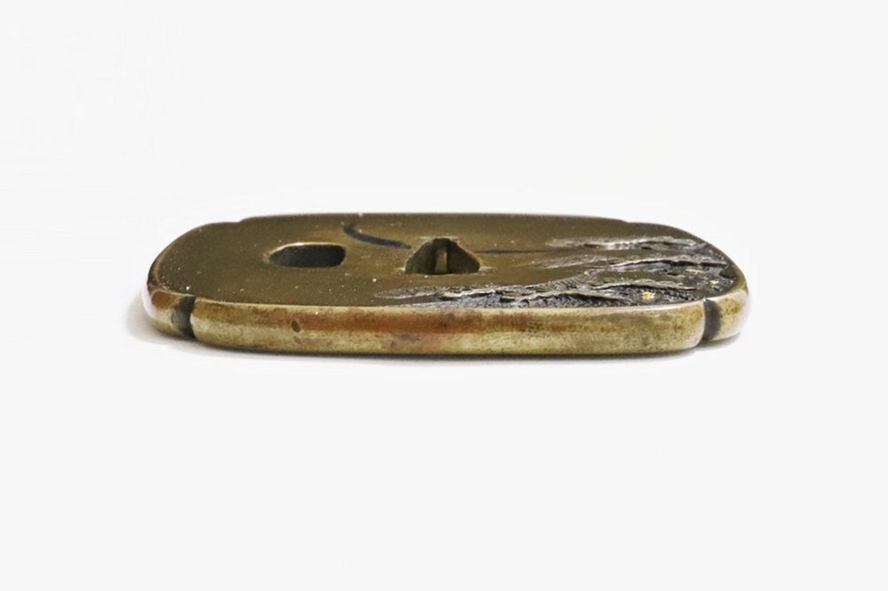 | 材質 | 真鍮磨地 障泥木瓜形 鋤出高彫 象嵌色絵 打返耳 |