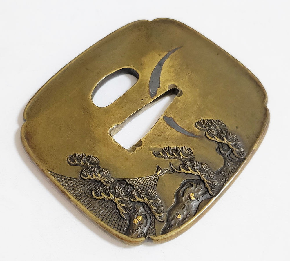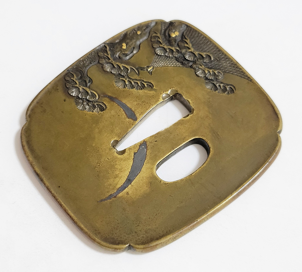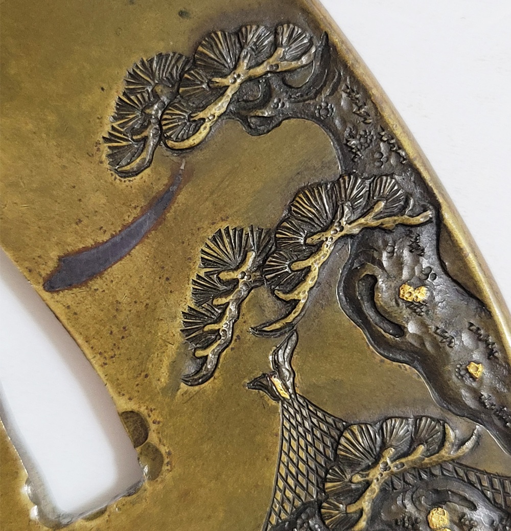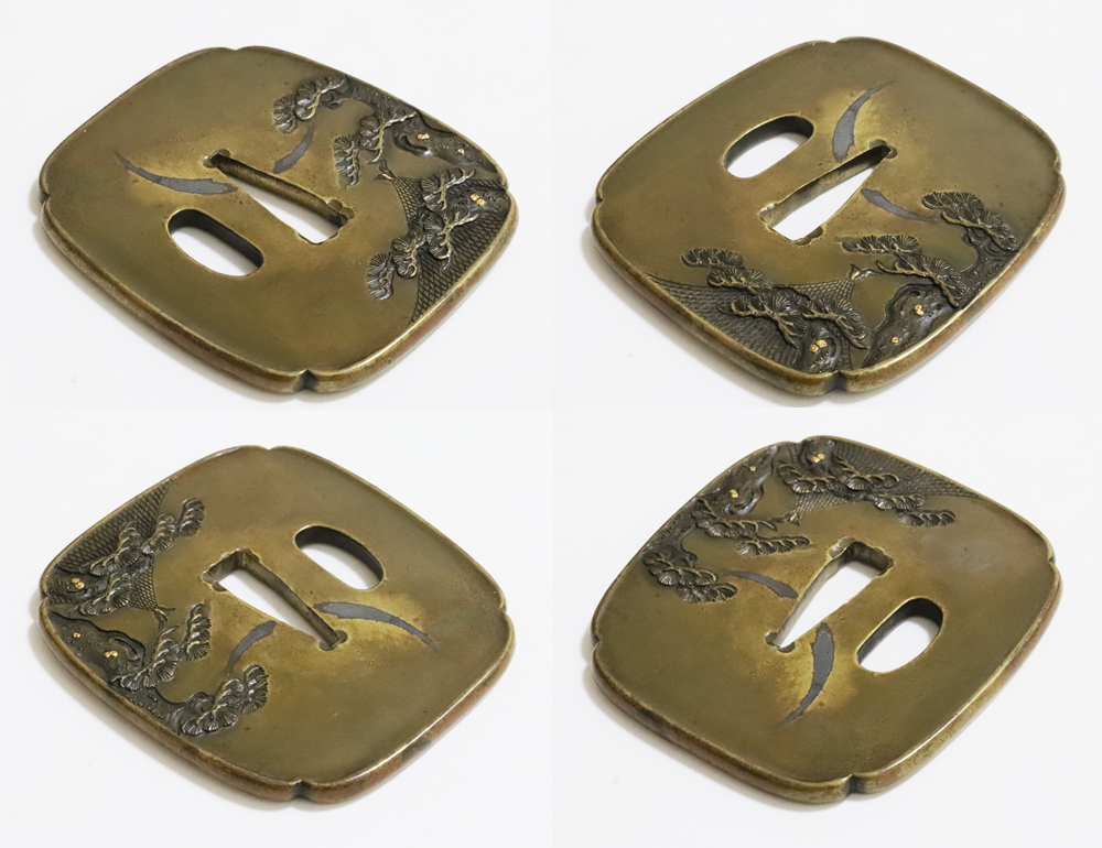 | 材質 | 真鍮磨地 障泥木瓜形 鋤出高彫 象嵌色絵 打返耳 |