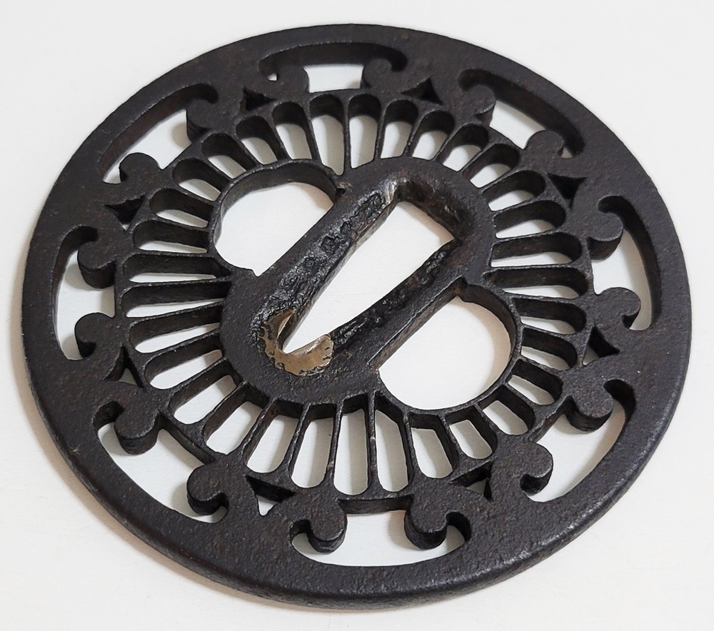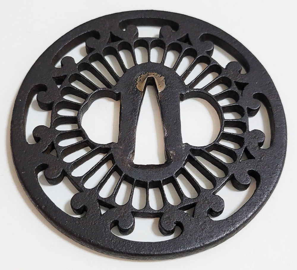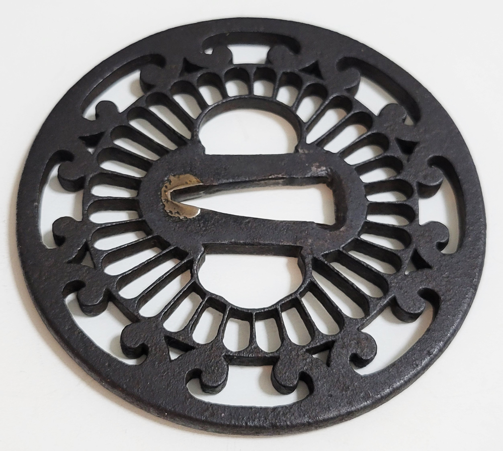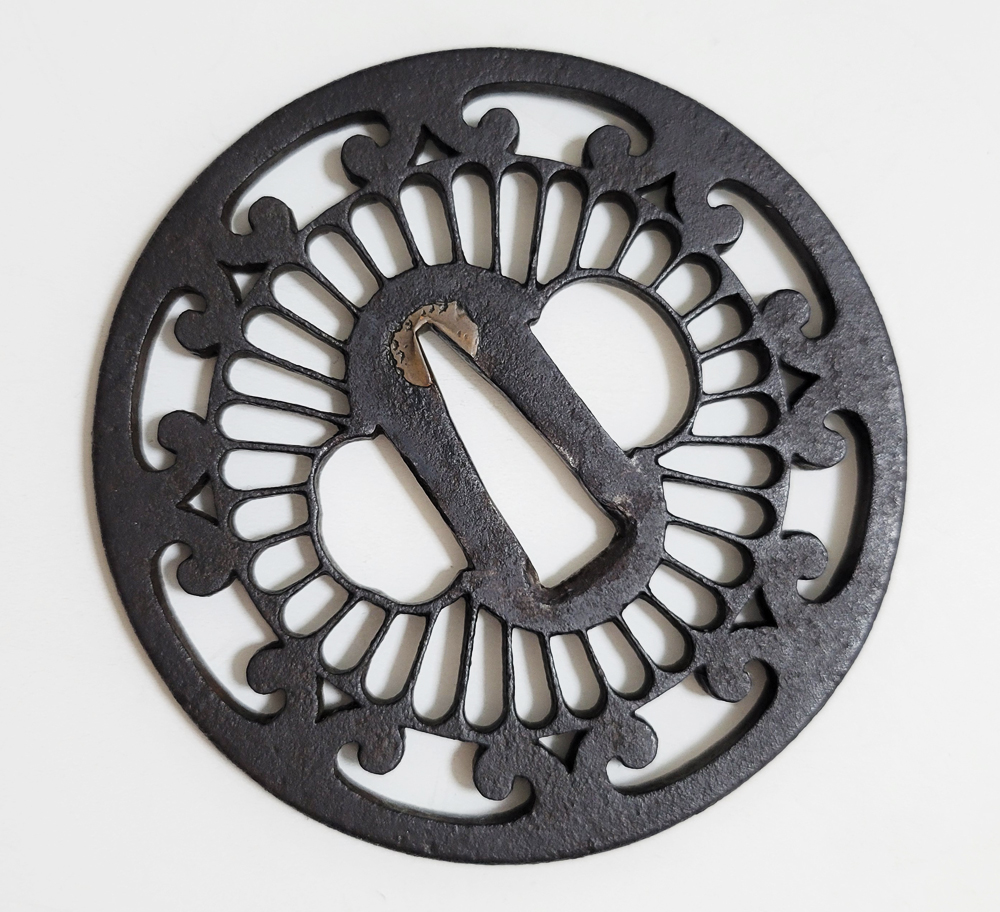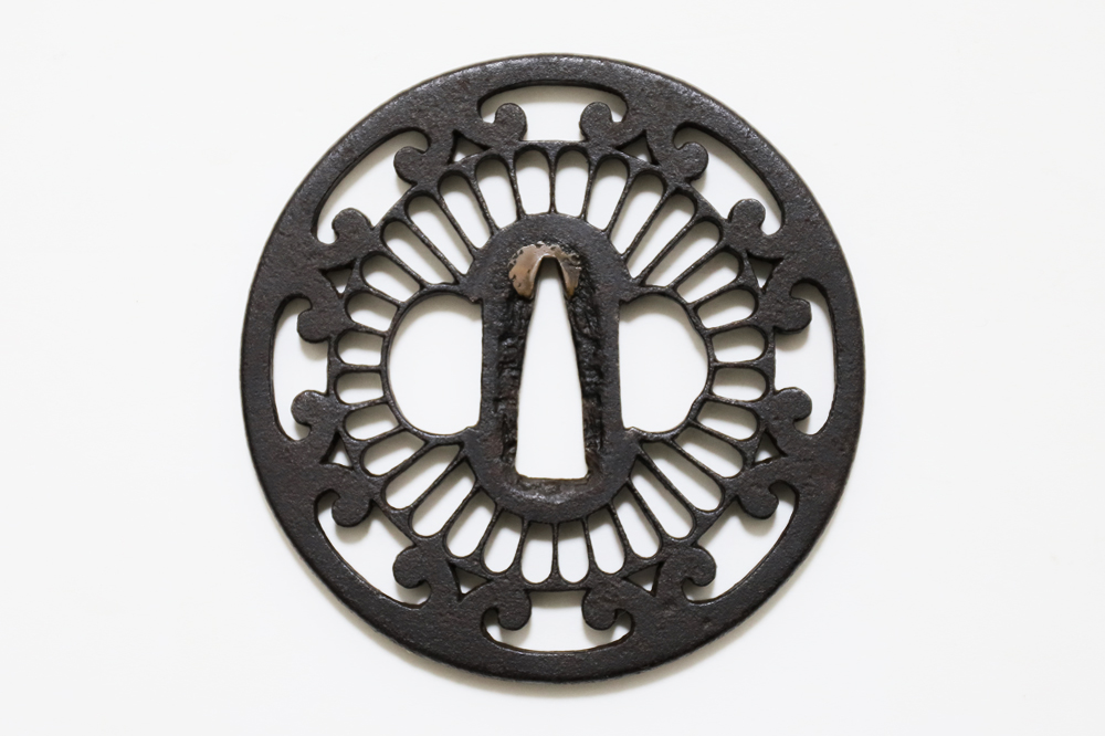 | 平地を菊花形に透かし、その外周を蕨手で繋ぐ意匠の鉄透鐔。頑丈で上手い左右対称の造込みに絵風の図案から時代の下がる尾張鐔と思われる。 |