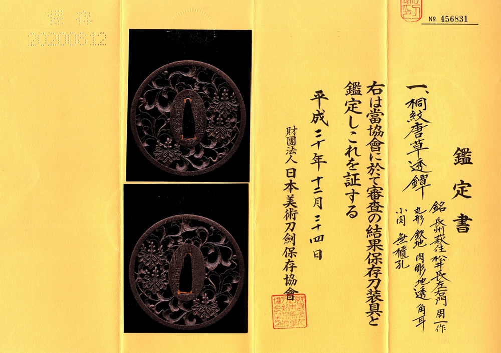 | 松井長左右門周一は、江戸中期、長門国住。鉄地丸形に草花図を肉彫地透にした鉄鐔を造る。嫡弟長左衛門松井氏周一と銘を切って河治友周と合作鐔もある。本作は、鉄色黒く、彫法が精巧で柔らか味がある。表に「長州萩住 松井長左右門」、裏に「周一作」と長銘を切った入念作。2008年保存刀装具審査合格。 |