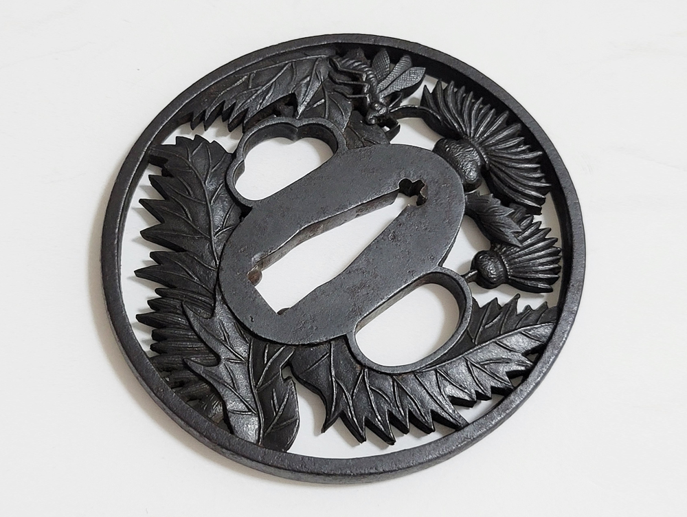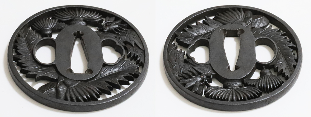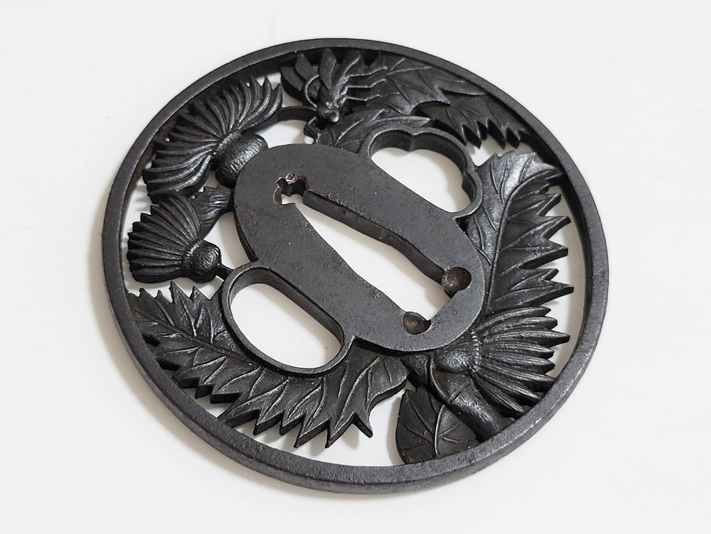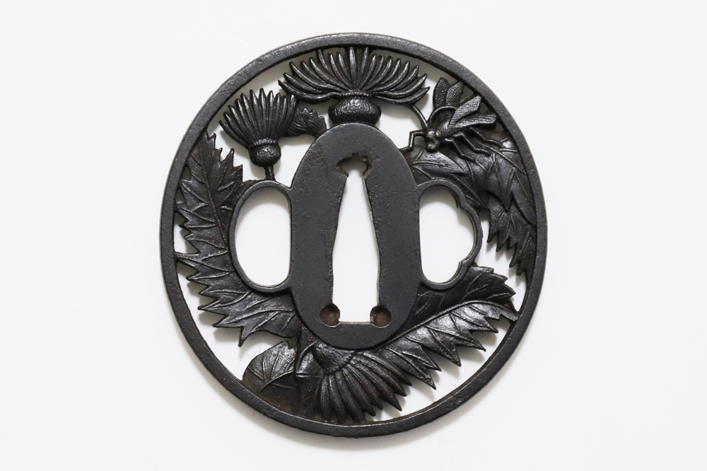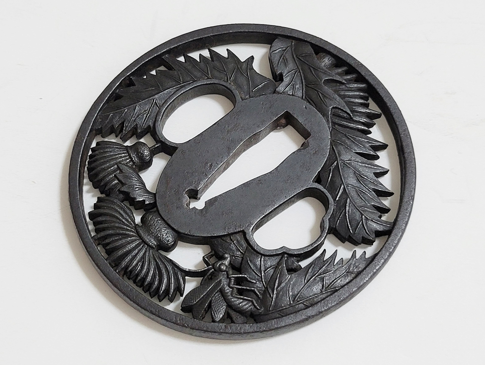 | 菊花と秋虫図の鉄地肉彫地透鐔。立体感ある精巧な菊花の彫り込みに秋虫を宿し目に金露象嵌を施す。出来優れ極めに思いが巡る。 |