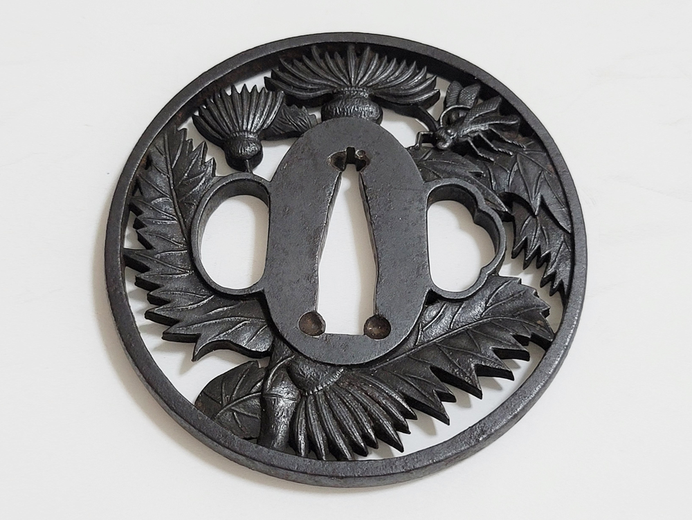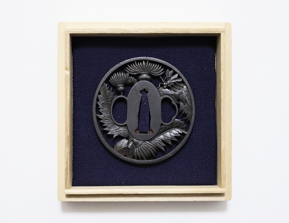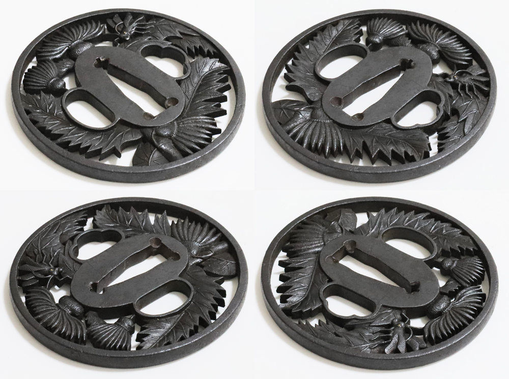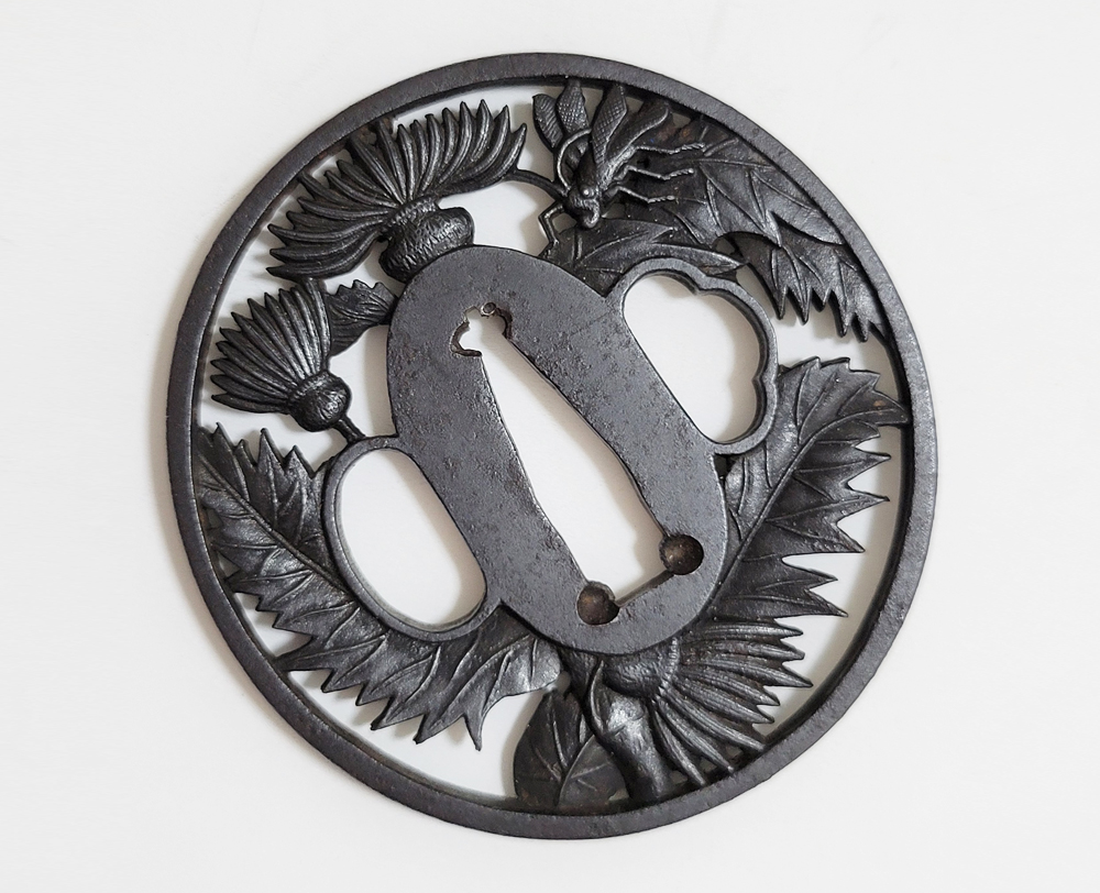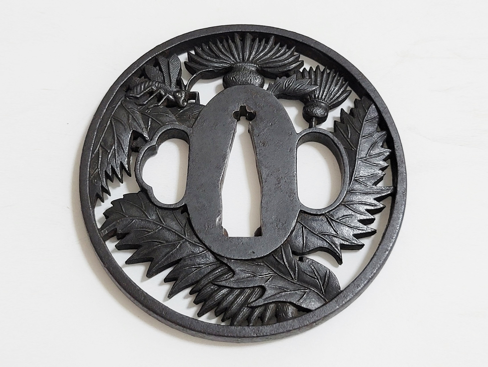 | 菊花と秋虫図の鉄地肉彫地透鐔。立体感ある精巧な菊花の彫り込みに秋虫を宿し目に金露象嵌を施す。出来優れ極めに思いが巡る。 |