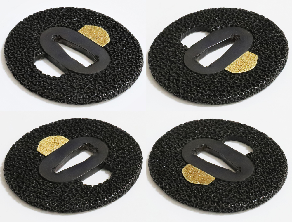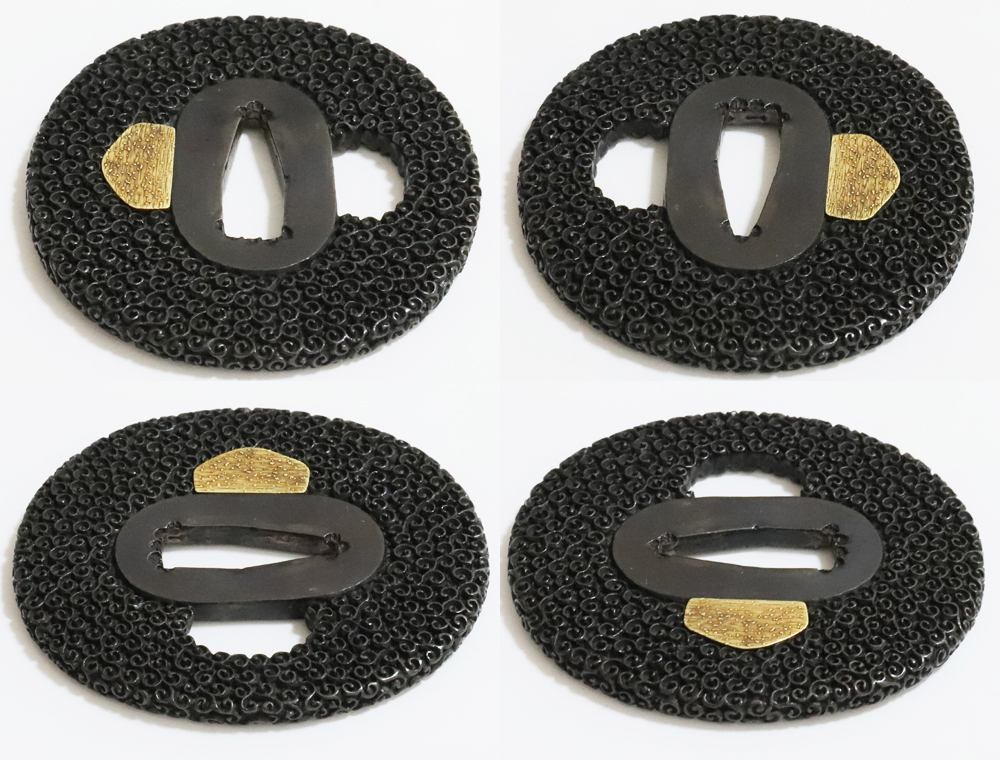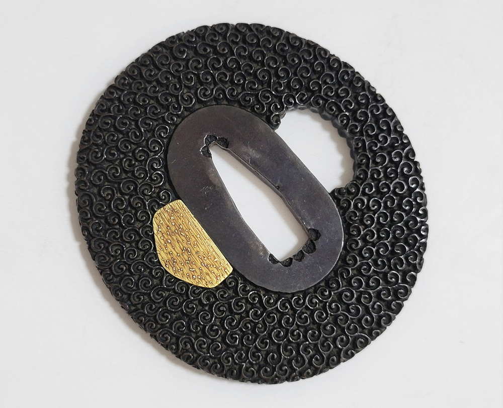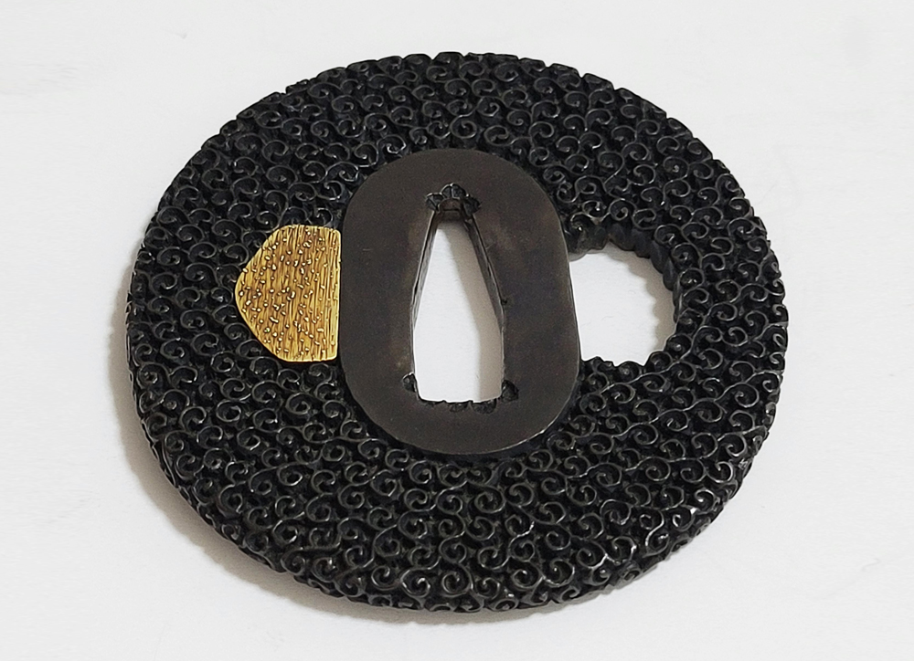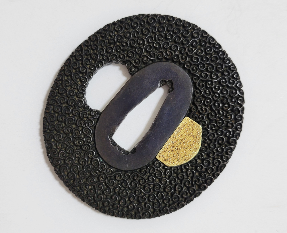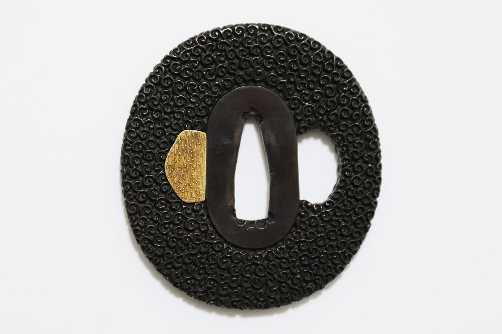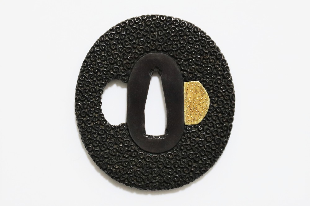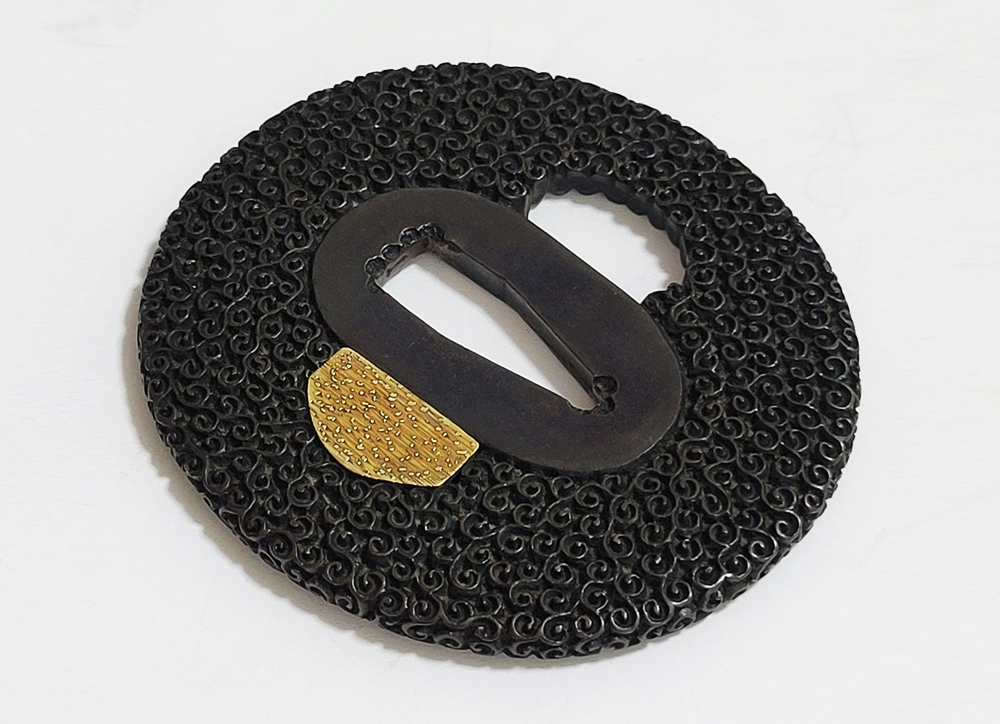 唐草を全面に鋤彫であらわした意匠の赤銅地鐔。めずらしい。2025年2月刀装具審査で「肥後」と極められ保存合格。