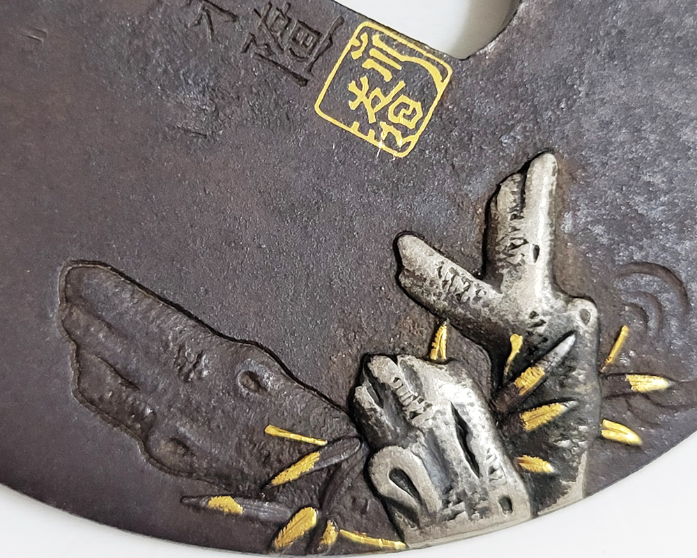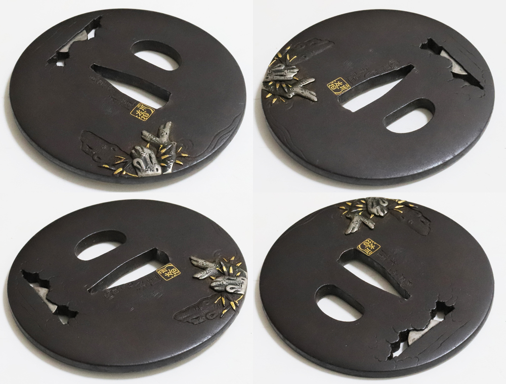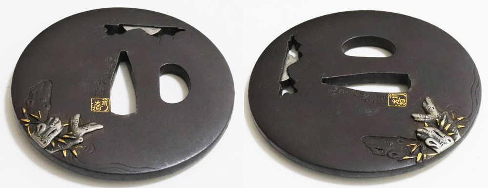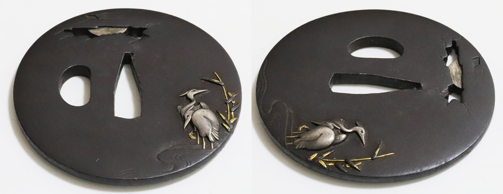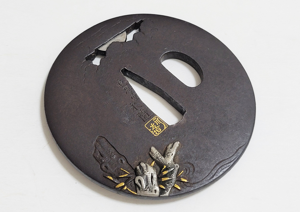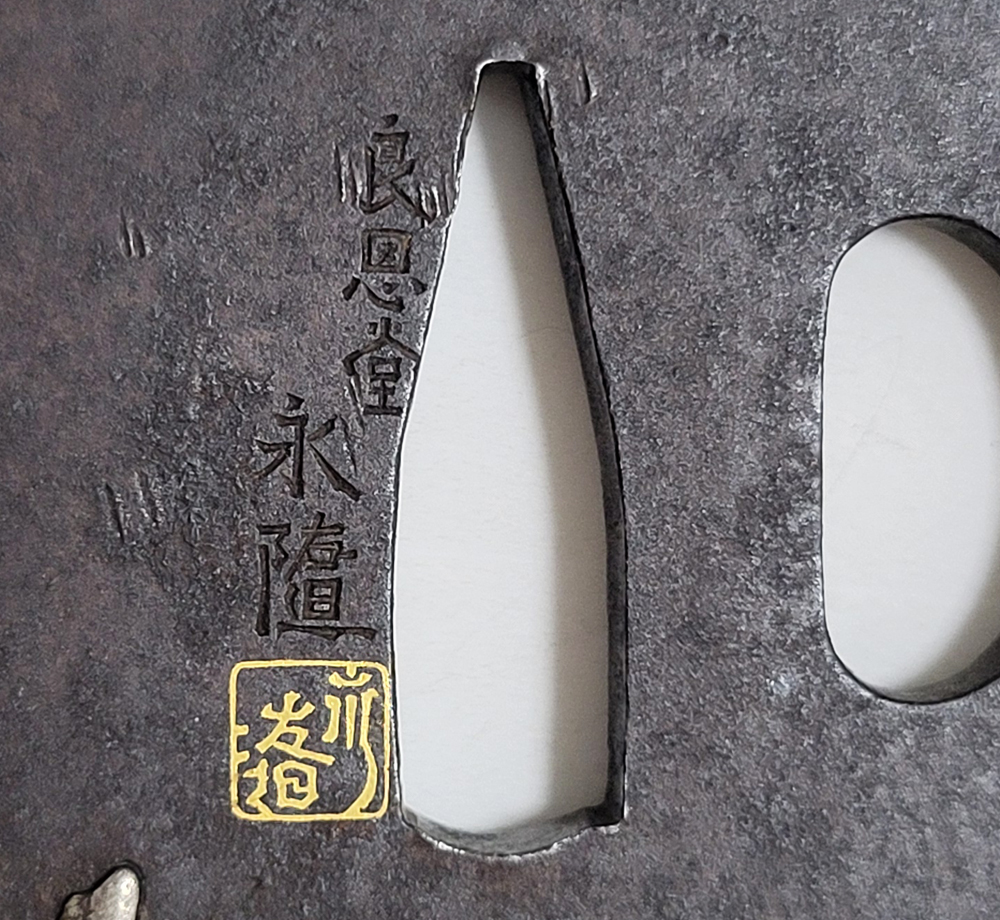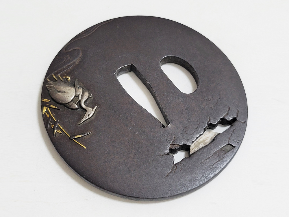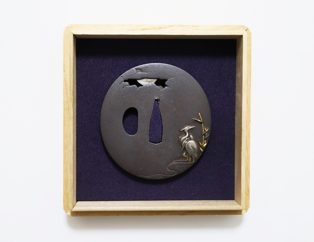 | 永随(ながゆき)は吾妻氏。はじめ稲川良克に学び良随と名乗る。のちに名手の濱野矩随(のりゆき・濱野政随に学び濱野の姓を許された)に師事し永随と改めた。本作は良恩堂を号し金印平象嵌を刻した永随の入念作。技法を駆使した濱野流の粋で思い切りのよい月下白鷺図鐔。 |