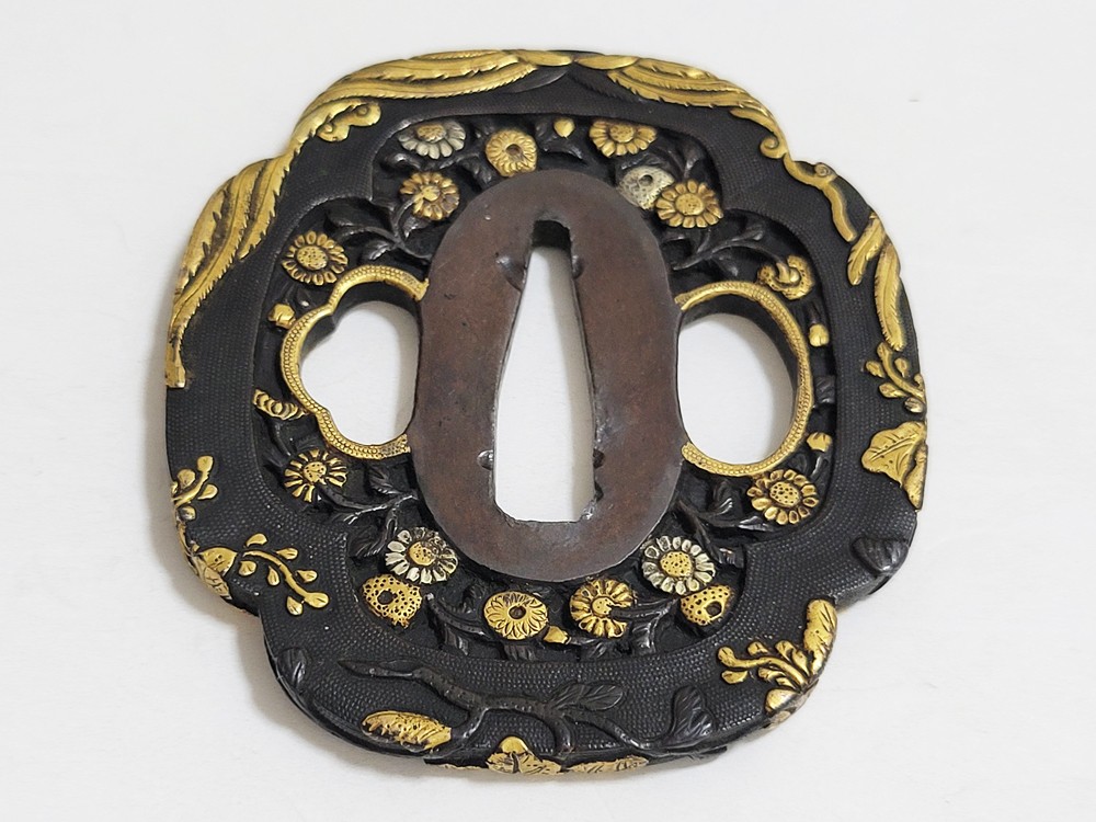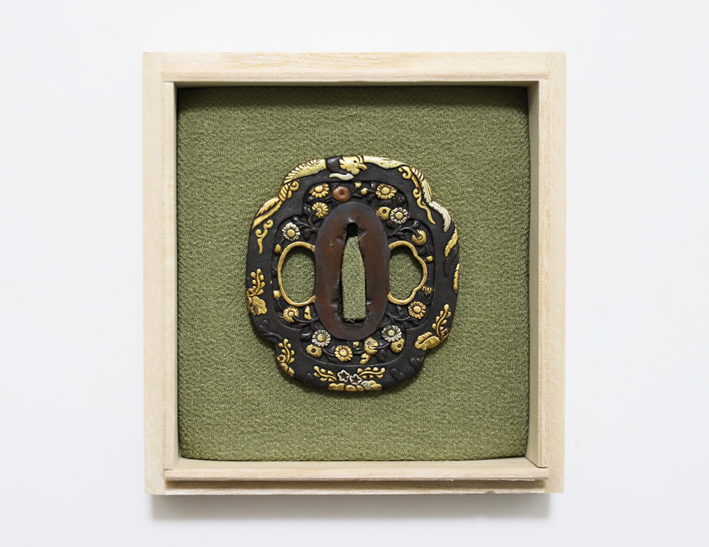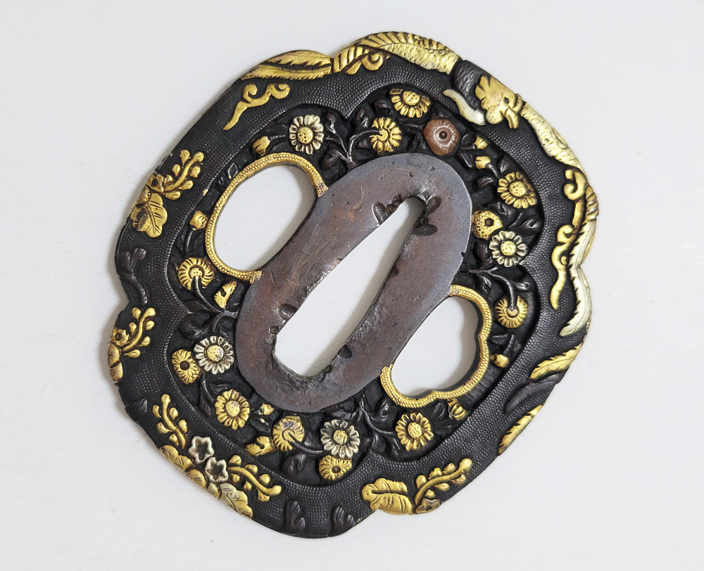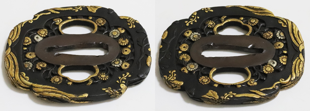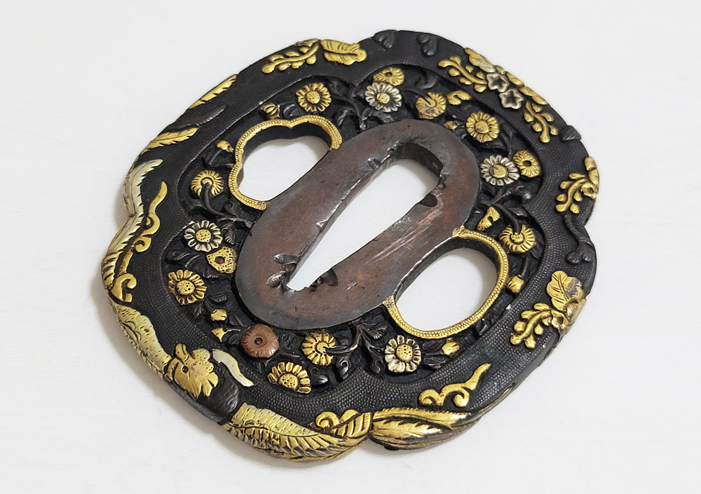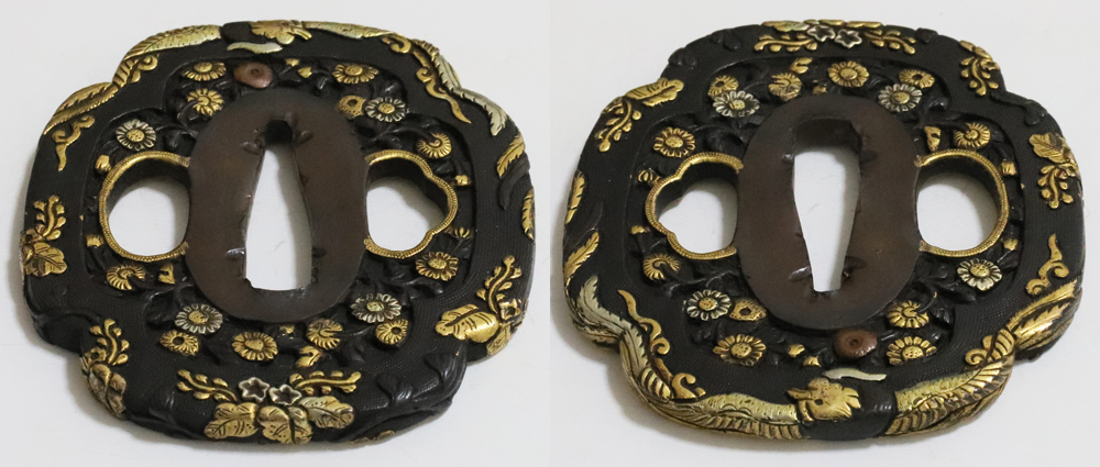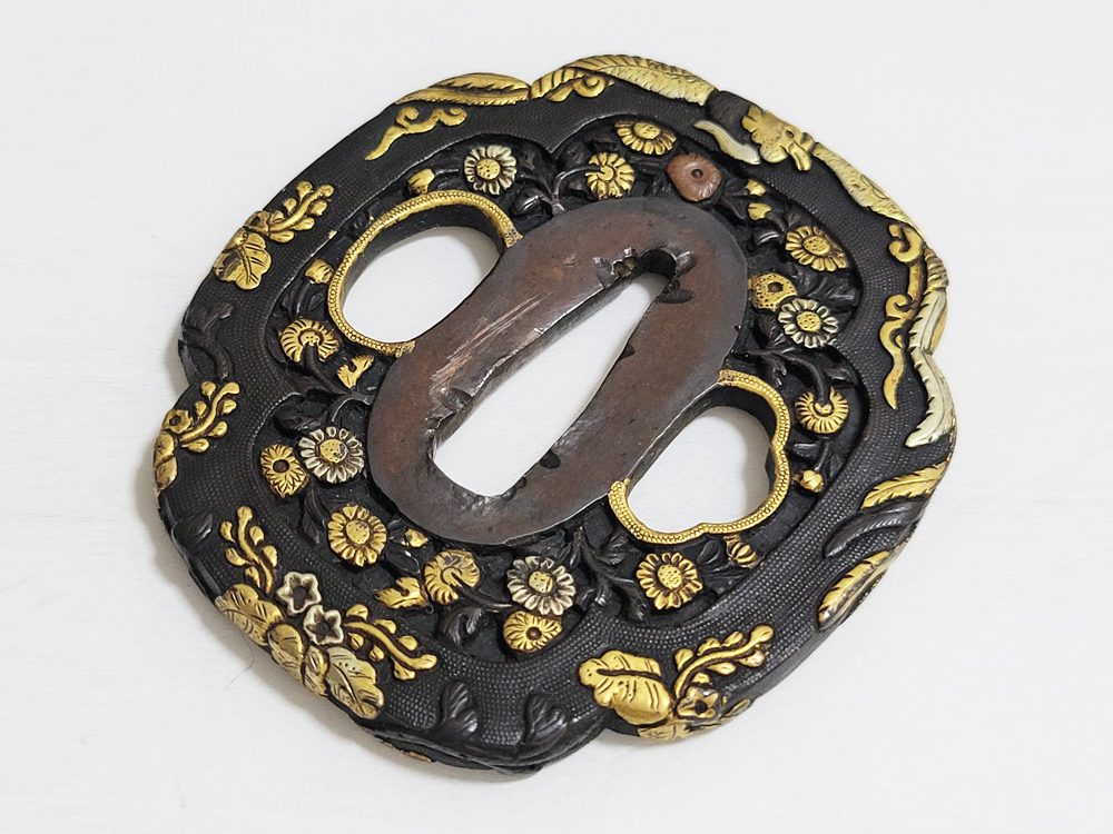 | 材質 | 赤銅魚子地 木瓜形 高鋤彫色絵 |