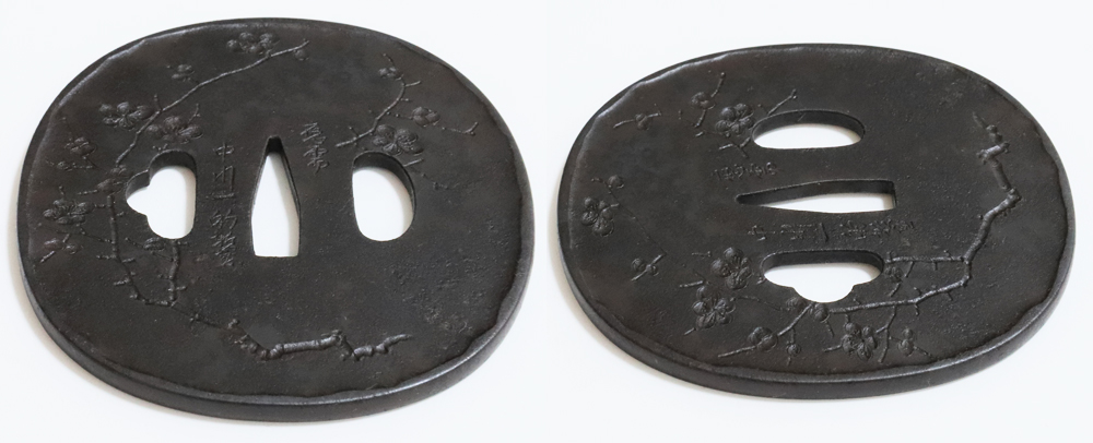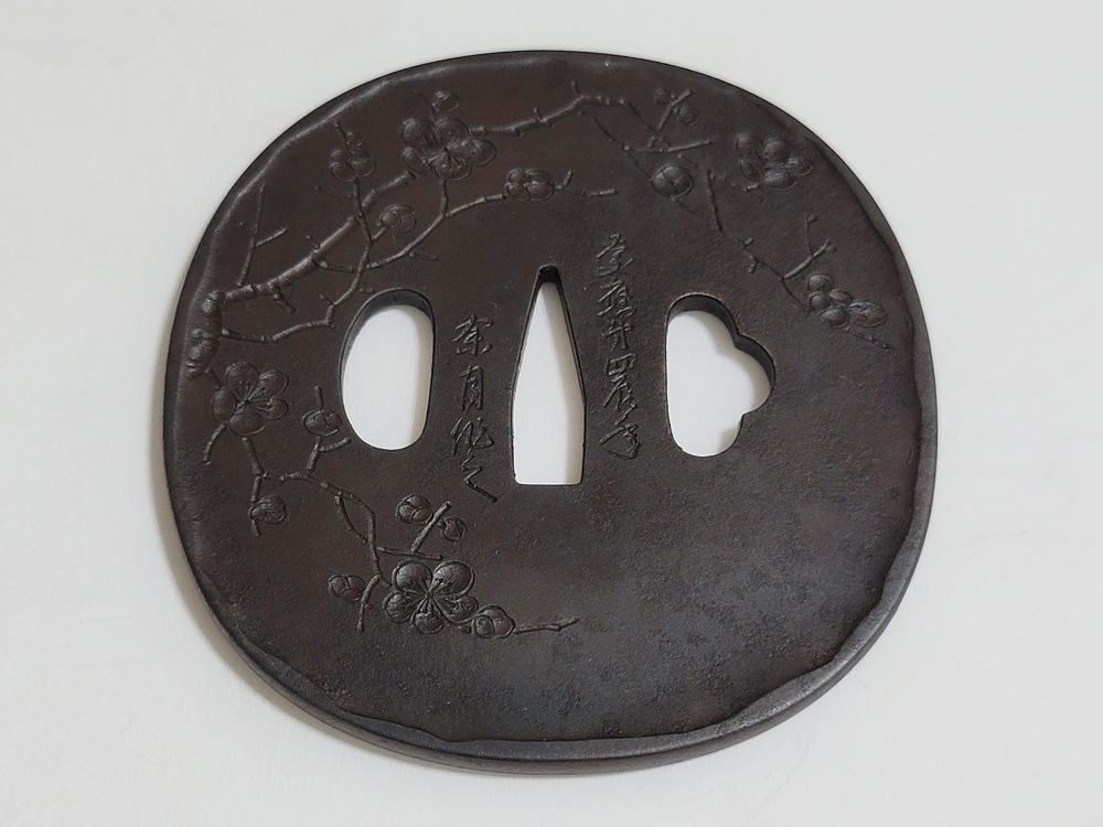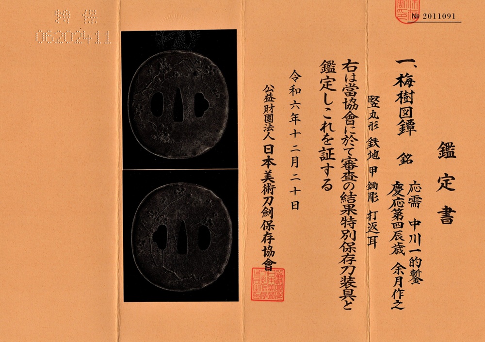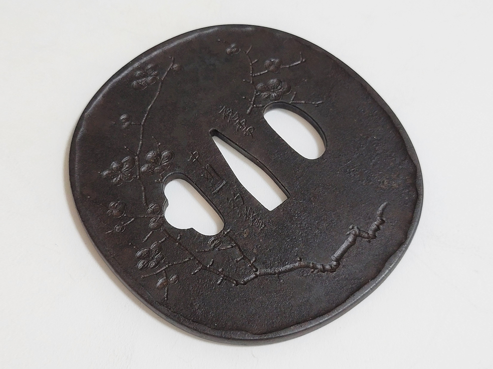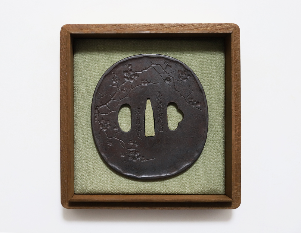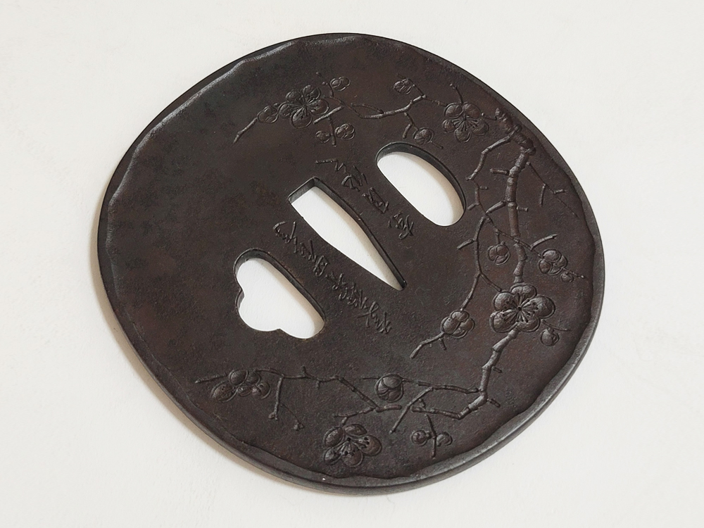 | 中川一的は天保六年(1835)作州津山生まれ。若銘を勝好、勝敬と名乗る。中川一匠、正阿弥勝義が兄。文久元年(1861)父兄の協議で中川本家の継承者となり中川家九代目を相続、津山藩松平家の抱え工となる。明治になり兄一匠の仲介で後藤一乗の門人となり師の一字を許され一的と名乗る。一乗門筆頭格である一琴風の毛彫・甲鋤彫・平象嵌などを得意とする。本作は茎櫃孔が原形で保たれた美品。甲鋤彫で巧みに梅樹が描かれている。2024年特別保存刀装具審査合格。 |