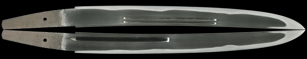 | 水戸住近知は菊池豊三郎近知。文化十二年(1815)水戸生まれ。五代坂東太郎卜伝(水戸家御召抱工となる濃州関善定家武蔵守吉門を改名)を称した師の川村勘三郎に男子が無く養子となり、関善定家近則に改名する。本作は近則に改名する前の天保十二年(1839)近知24歳若打ち。近知は大慶直胤が日立助川城で駐槌した際に入門し、さらに天保十四年江戸へも出て直胤に師事した(直胤は天保十年、嘉永四年、安政二年と計3度助川海防城に来訪した)。本作は直胤に師事した作刀と思われる。精美な小板目柾流れの鍛えに小沸付いて金線交じる湾れ刃文の平造り寸延び短刀。2024年12月刀剣審査で特別保存合格。 |