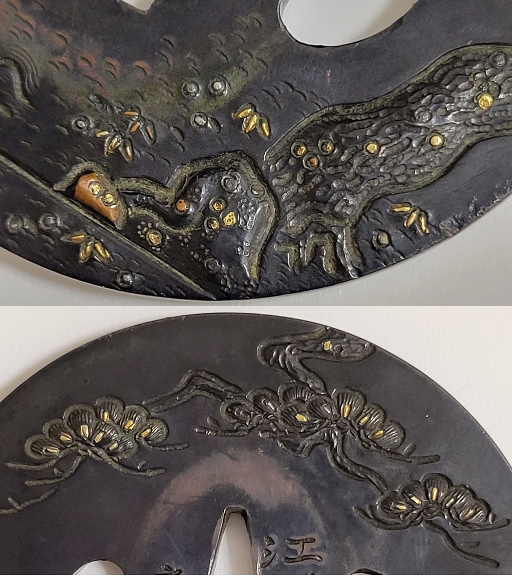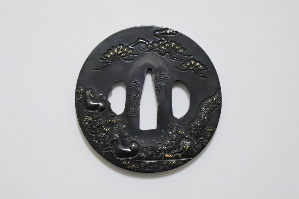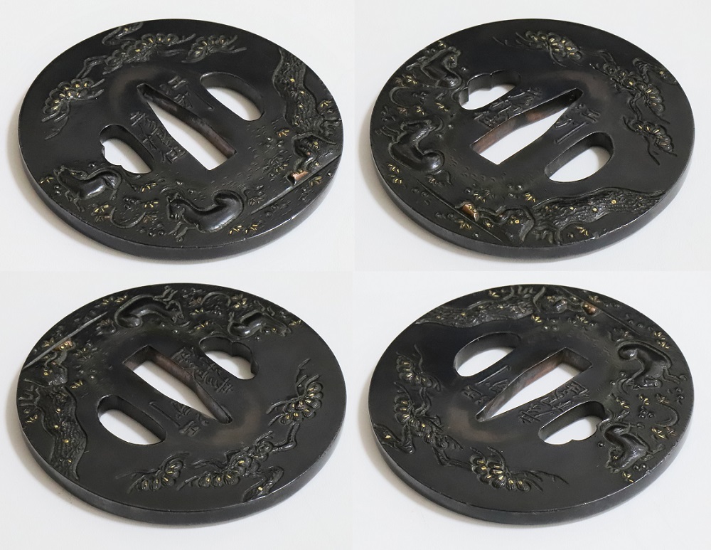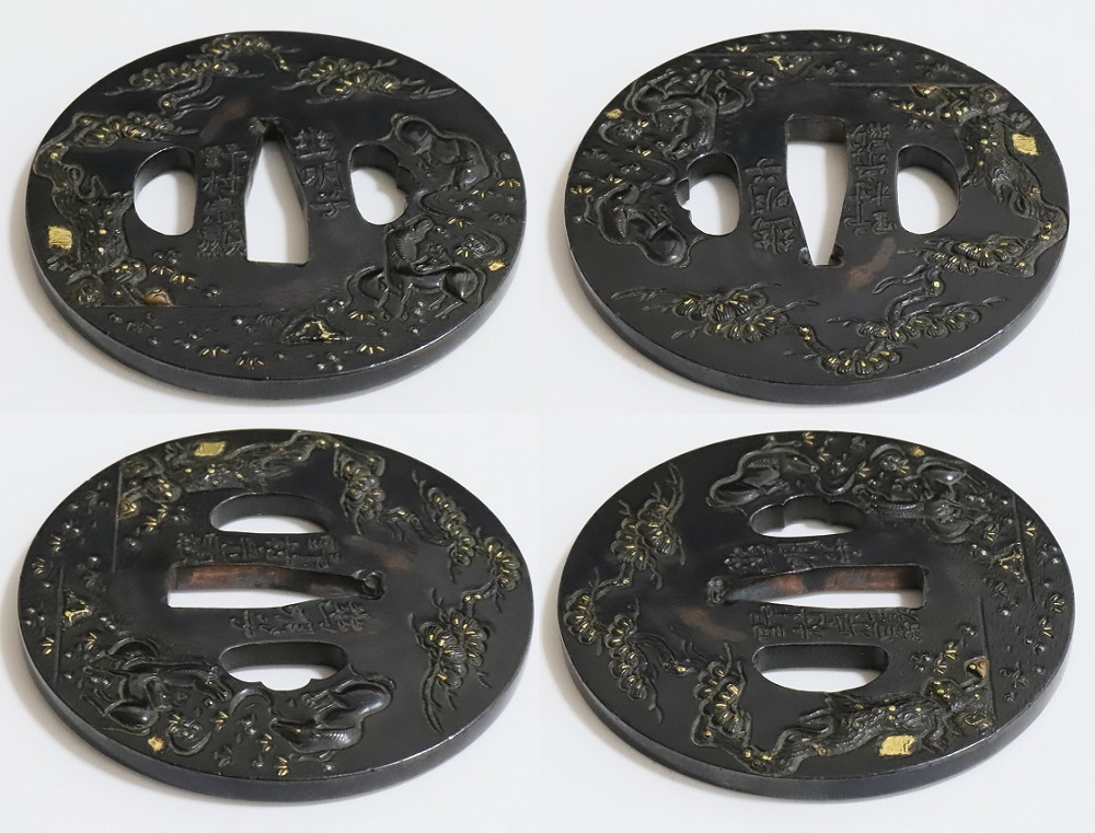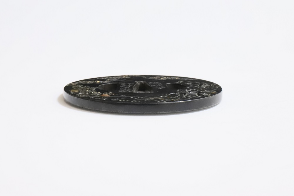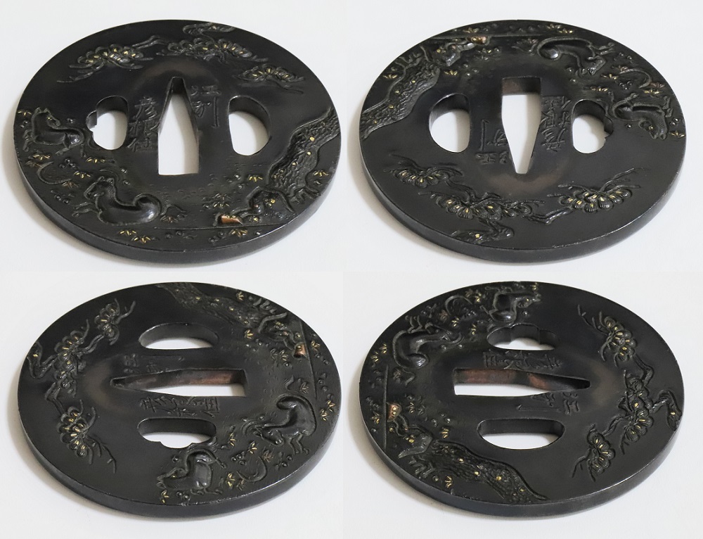 | This craftsman, Muneaki, was a disciple of Nomura Kanenori. Muneaki was active during the Mid Edo Period in Hikone, Ohmi Province. His craftsman's name "Go" was Yumeishi. The features of this Tsuba resembles Soheishi / The Kitagawa Tradition. It is elaborate work for an fine Tsuba. It has passed the Tokubetsu Hozon Shinsa in August 2022. The Paulownia box was recessed for this item. |