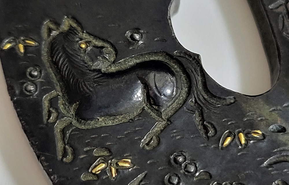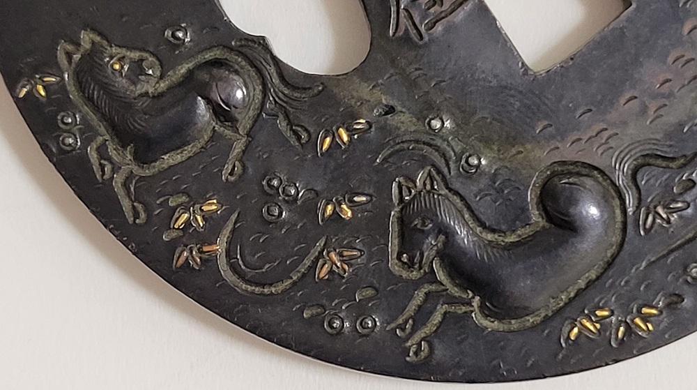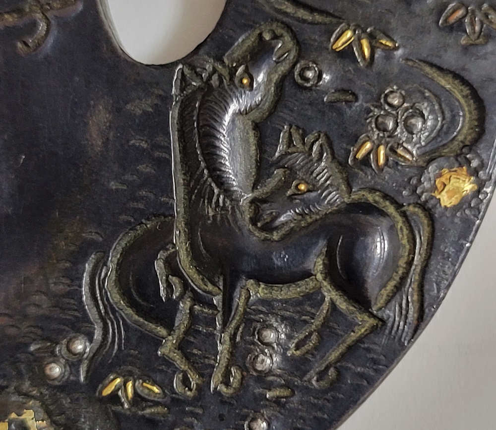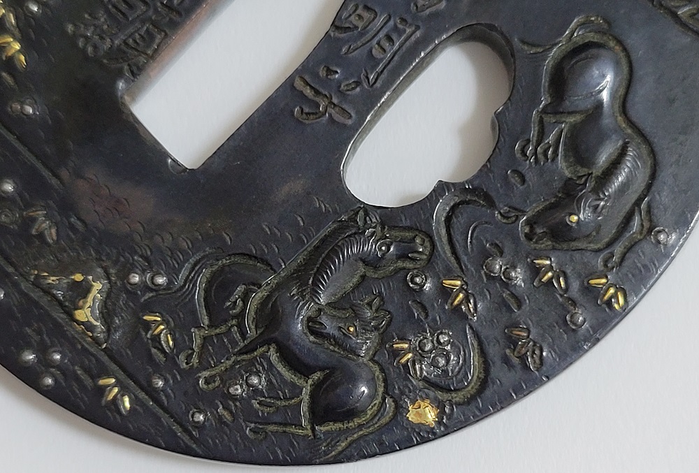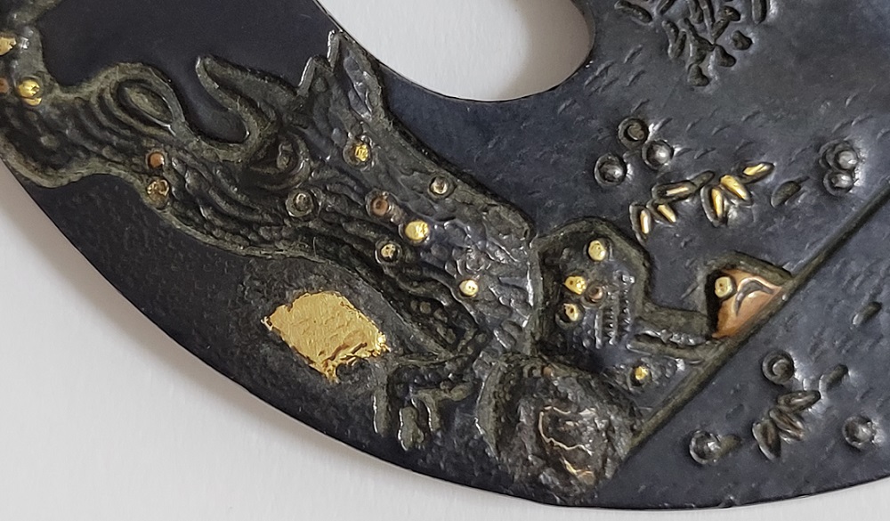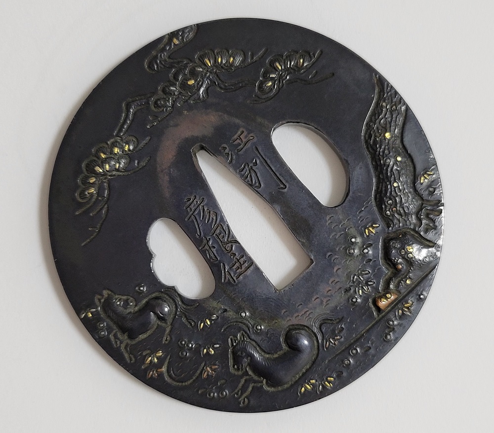 | This craftsman, Muneaki, was a disciple of Nomura Kanenori. Muneaki was active during the Mid Edo Period in Hikone, Ohmi Province. His craftsman's name "Go" was Yumeishi. The features of this Tsuba resembles Soheishi / The Kitagawa Tradition. It is elaborate work for an fine Tsuba. It has passed the Tokubetsu Hozon Shinsa in August 2022. The Paulownia box was recessed for this item. |