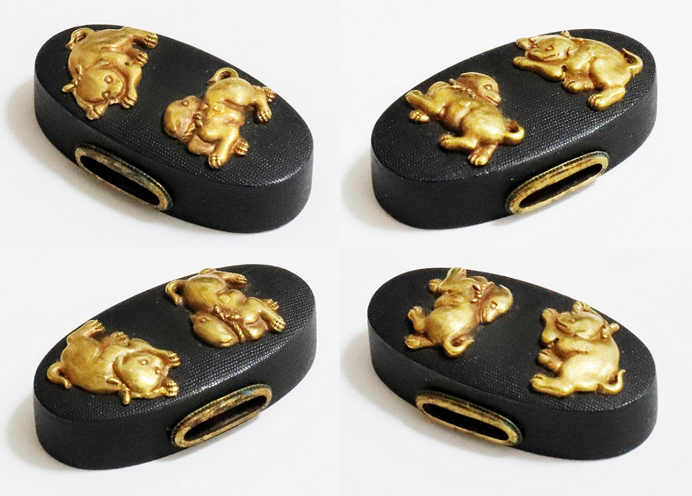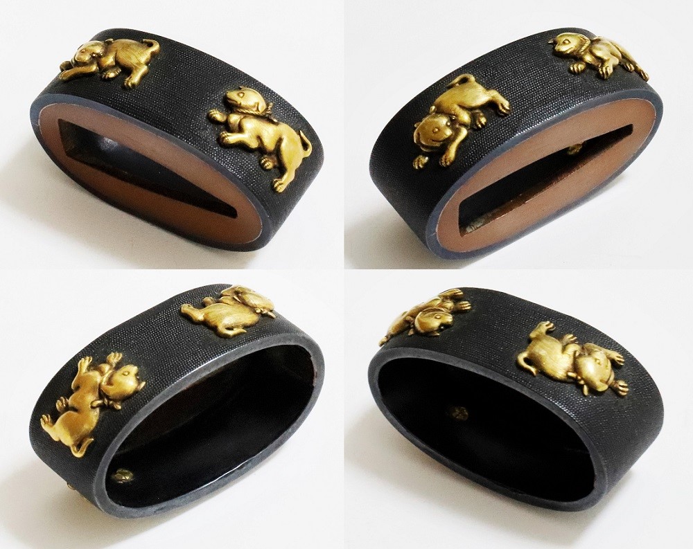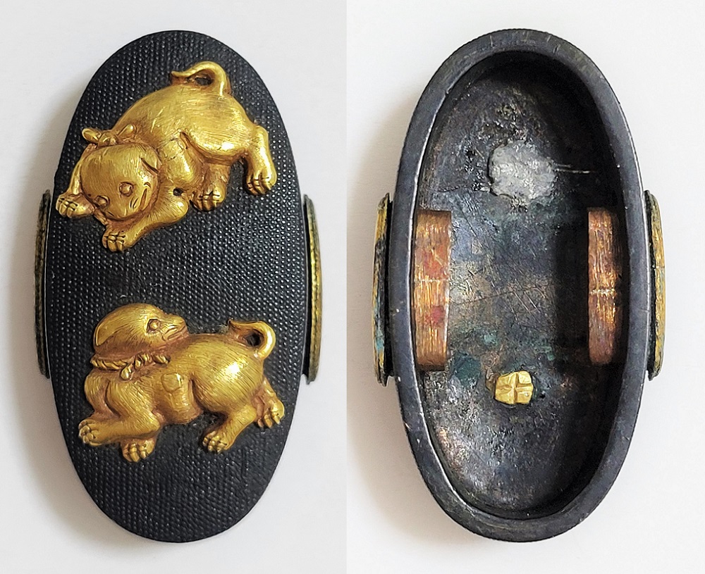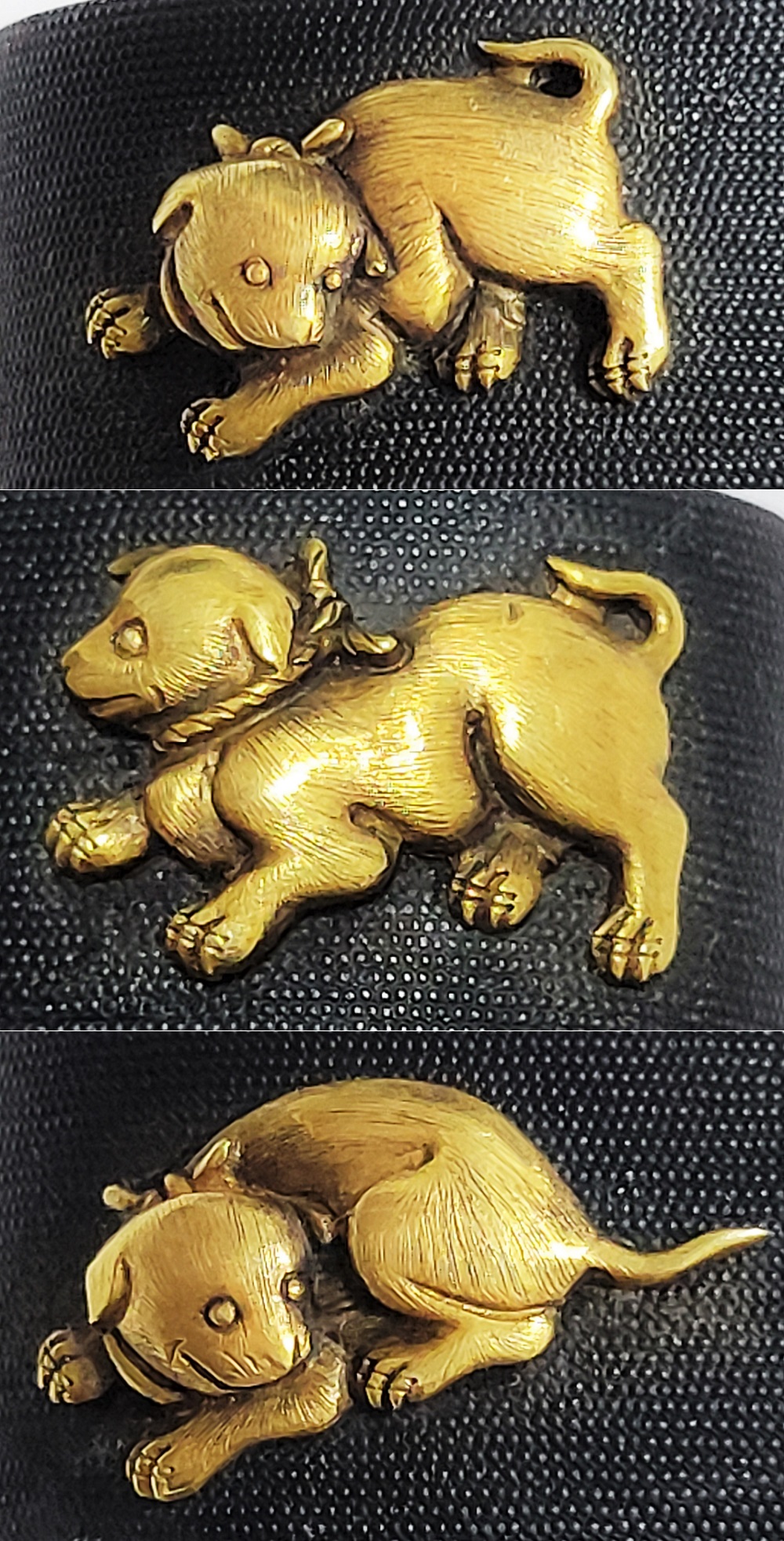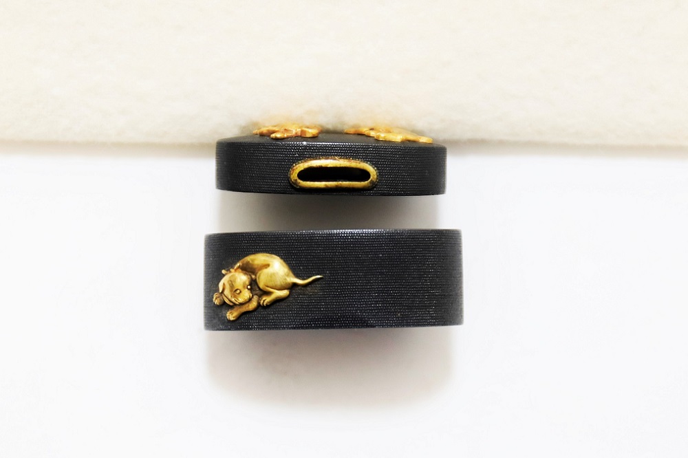 | 江戸時代、犬公方(いぬくぼう)と呼ばれた五代将軍徳川綱吉(1680年 - 1709年)の治世下では、江戸城で座敷犬、抱き犬として犬が大切にされた。本作は、愛らしい金の仔犬を据紋した仔犬図縁頭。金据紋の足が赤銅魚子地の裏側に貫通して留めがわかる希少品。赤銅地に魚子が微細に打たれ金紋の仔犬は動きがあり上手。2024年5月刀装具審査で京金工に極められて特別保存合格。 |
