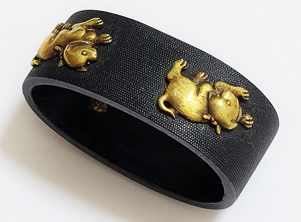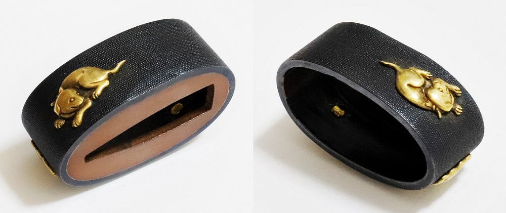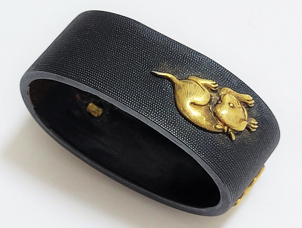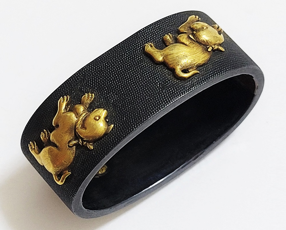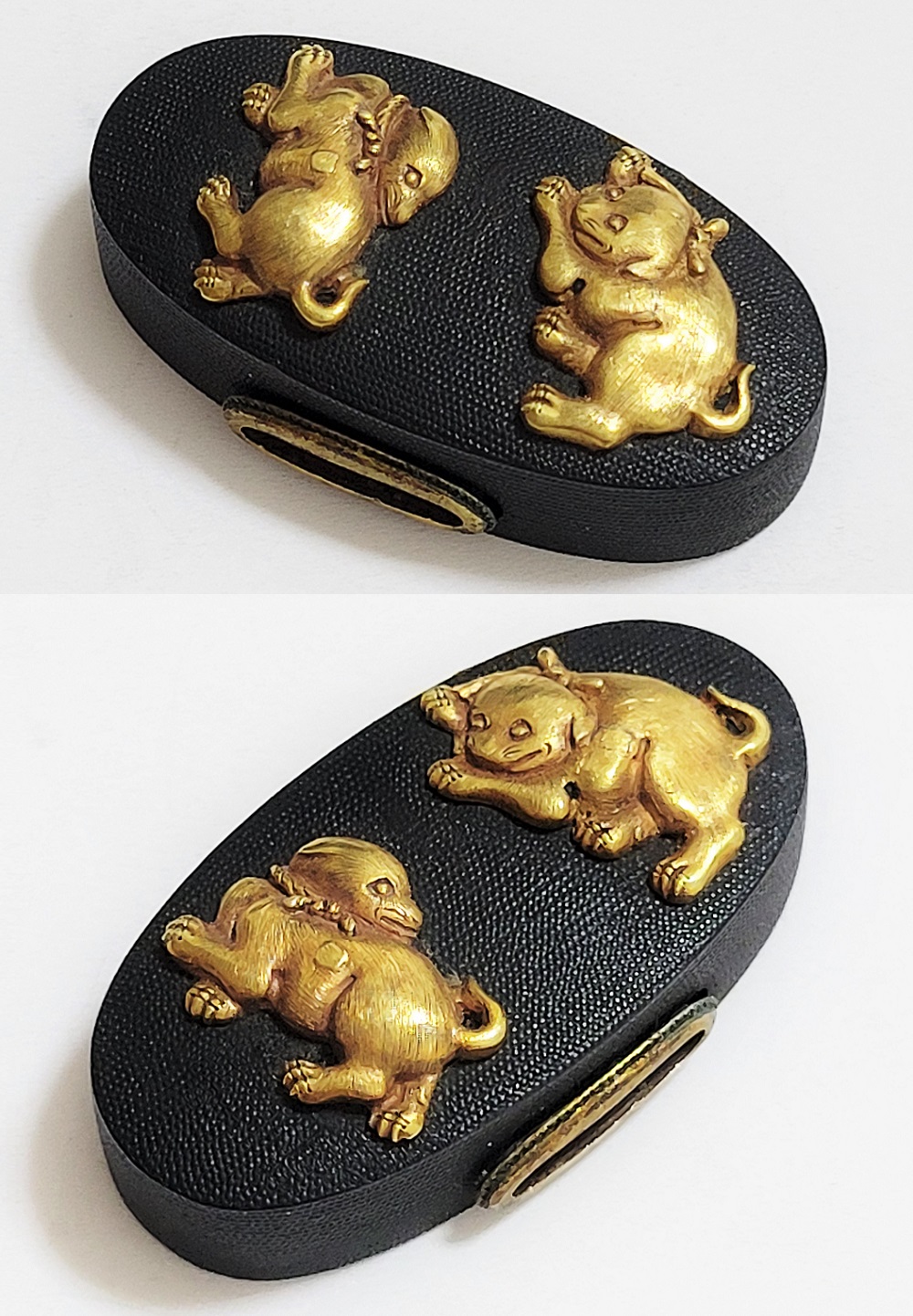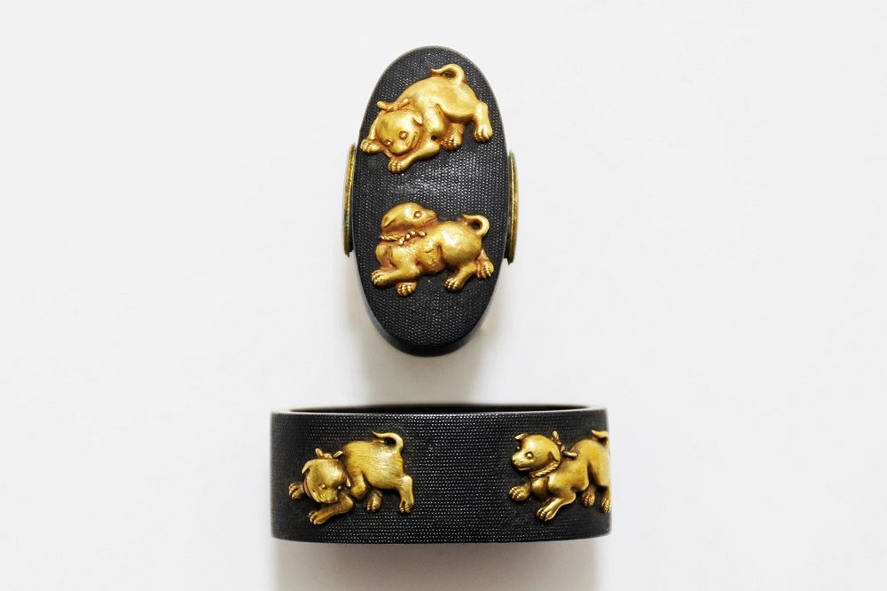 | 江戸時代、犬公方(いぬくぼう)と呼ばれた五代将軍徳川綱吉(1680年 - 1709年)の治世下では、江戸城で座敷犬、抱き犬として犬が大切にされた。本作は、愛らしい金の仔犬を据紋した仔犬図縁頭。金据紋の足が赤銅魚子地の裏側に貫通して留めがわかる希少品。赤銅地に魚子が微細に打たれ金紋の仔犬は動きがあり上手。2024年5月刀装具審査で京金工に極められて特別保存合格。 |