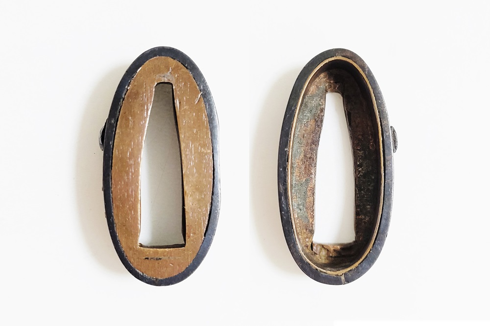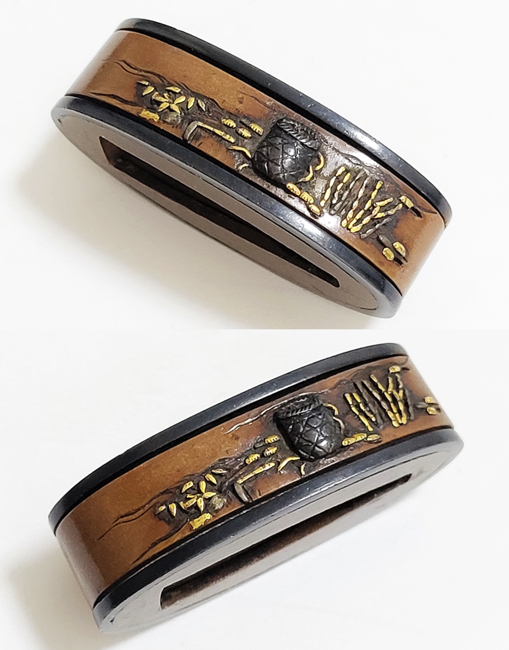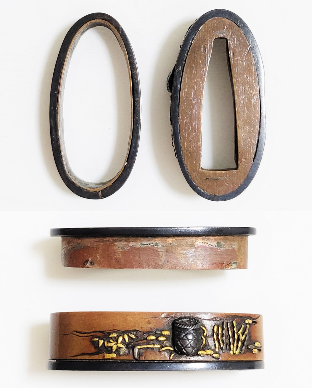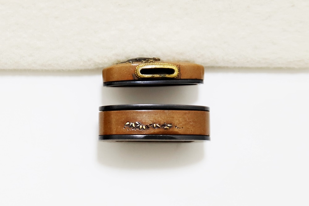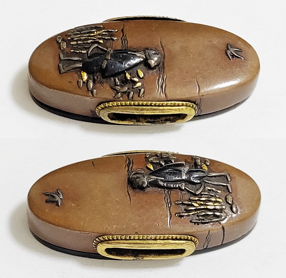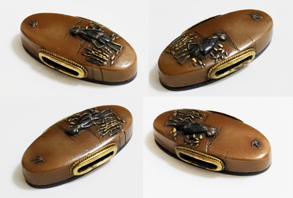 | 鎌を手にした仕事着姿の老人が天を仰ぎ、その足元に群生する木賊(とくさ)を配する画題は「木賊刈(とくさがり)」。古くは金家に始まり、安親が得意とした画題。木賊は水辺に生える植物で縦刻みの線があり、強靭で木など物を磨くことに使われた。「木賊刈」は、「謡曲木賊」で、子をさらわれひとり寂しく木賊を刈る老人が、往来の旅人に息子の消息を尋ね続けて年月が経ち、今日も息子の消息が分からずに日が暮れると天を仰いで一日の仕事を終えた疲れと虚無感が滲み出た場面。やがて老人は都から来て道に迷った若い僧に会うと、その僧が我が息子とわかり父子再会、喜びの物語りとなる。本作は、無銘木賊刈図縁頭。 |