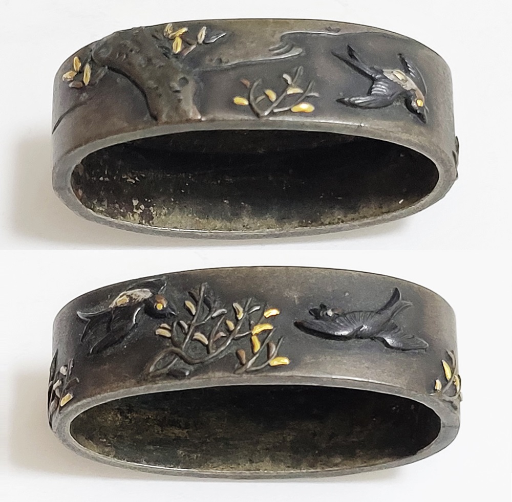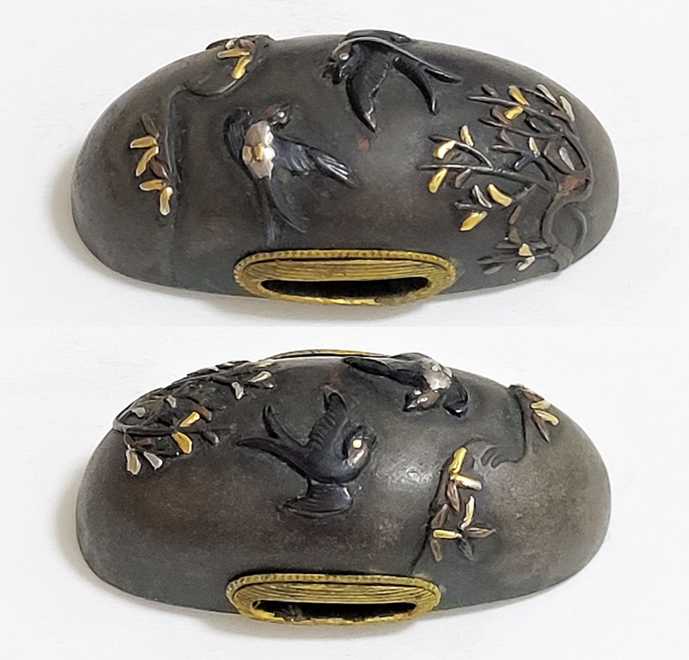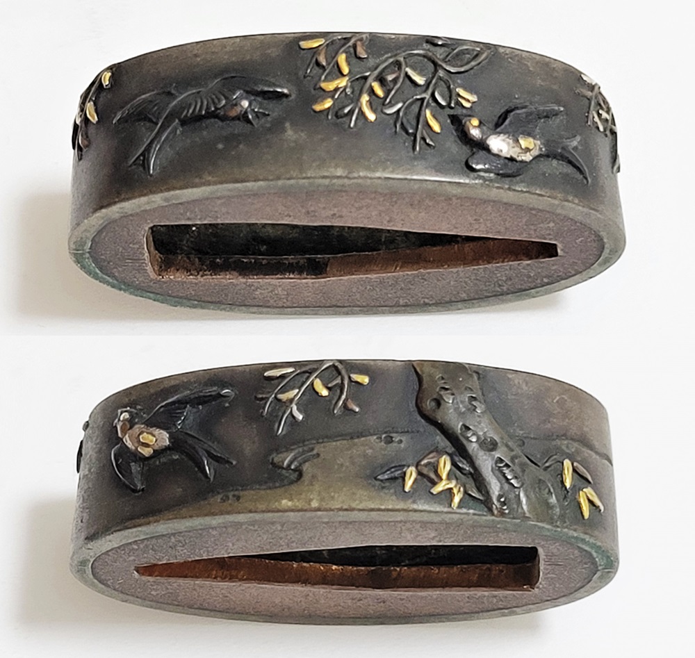 柳は春の訪れを告げ古くから愛され日本の風景や文化に深く根付いた植物。燕は農作物を生育する3月中旬ごろから南方より日本に渡って来る夏鳥。害虫を沢山食べることから人にとって益鳥とされ、燕が巣を作ることでその年は豊作になると言われ、商売繁盛や幸運の象徴として大切にされた。本作は柳の傍を飛行する番の燕図。初夏の情景をあらわす図。