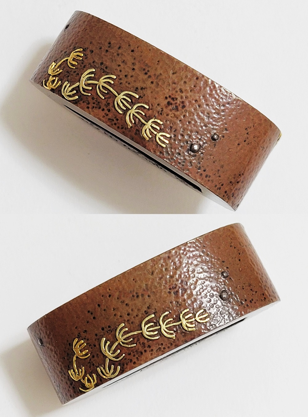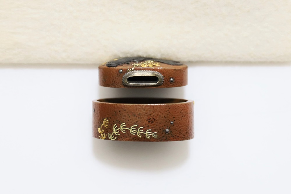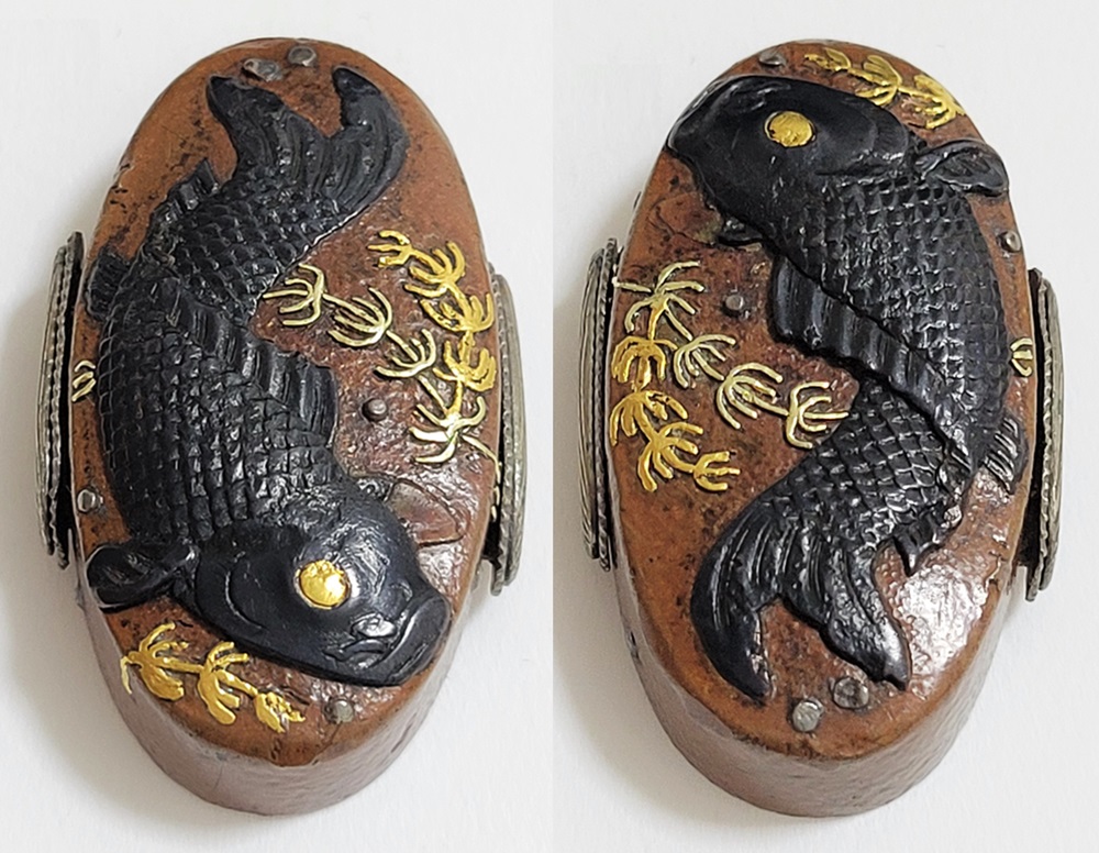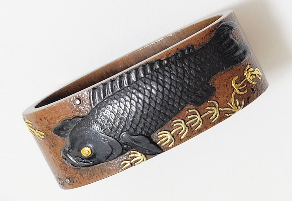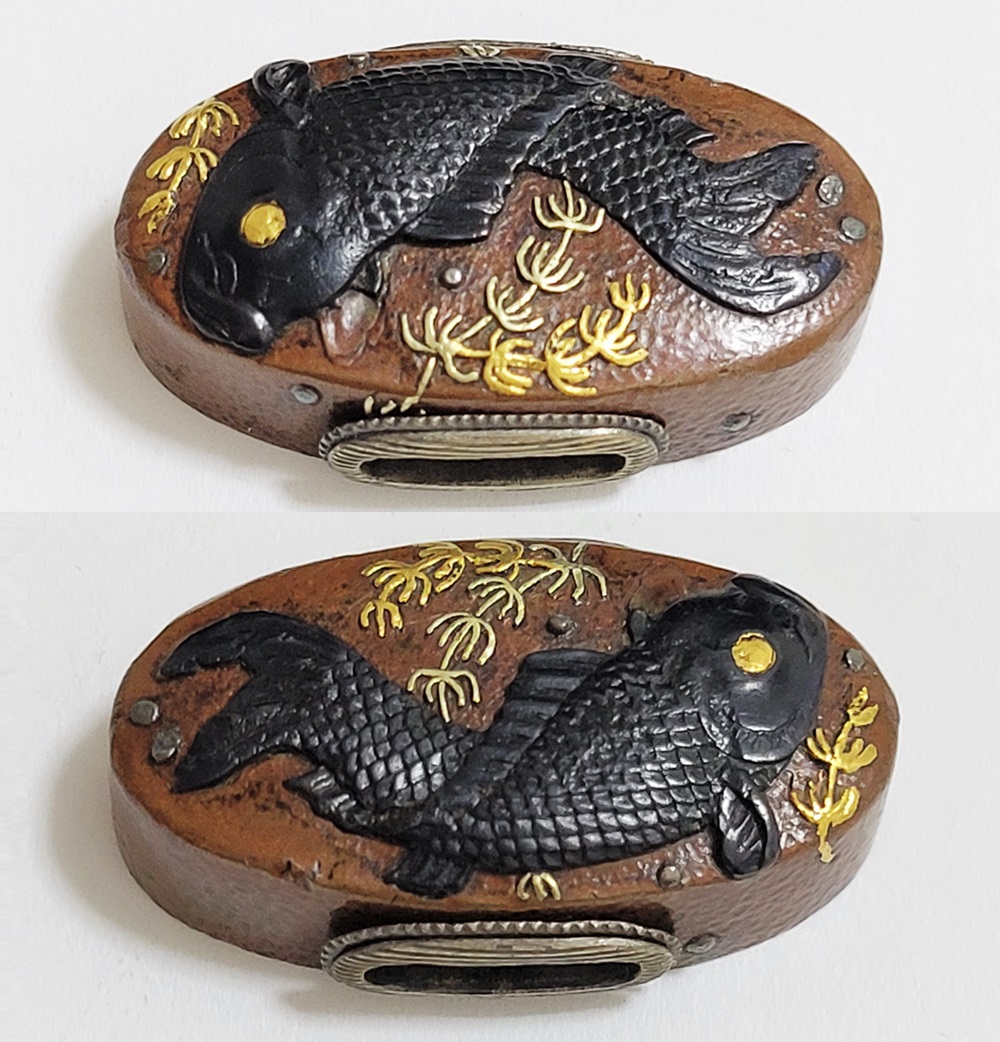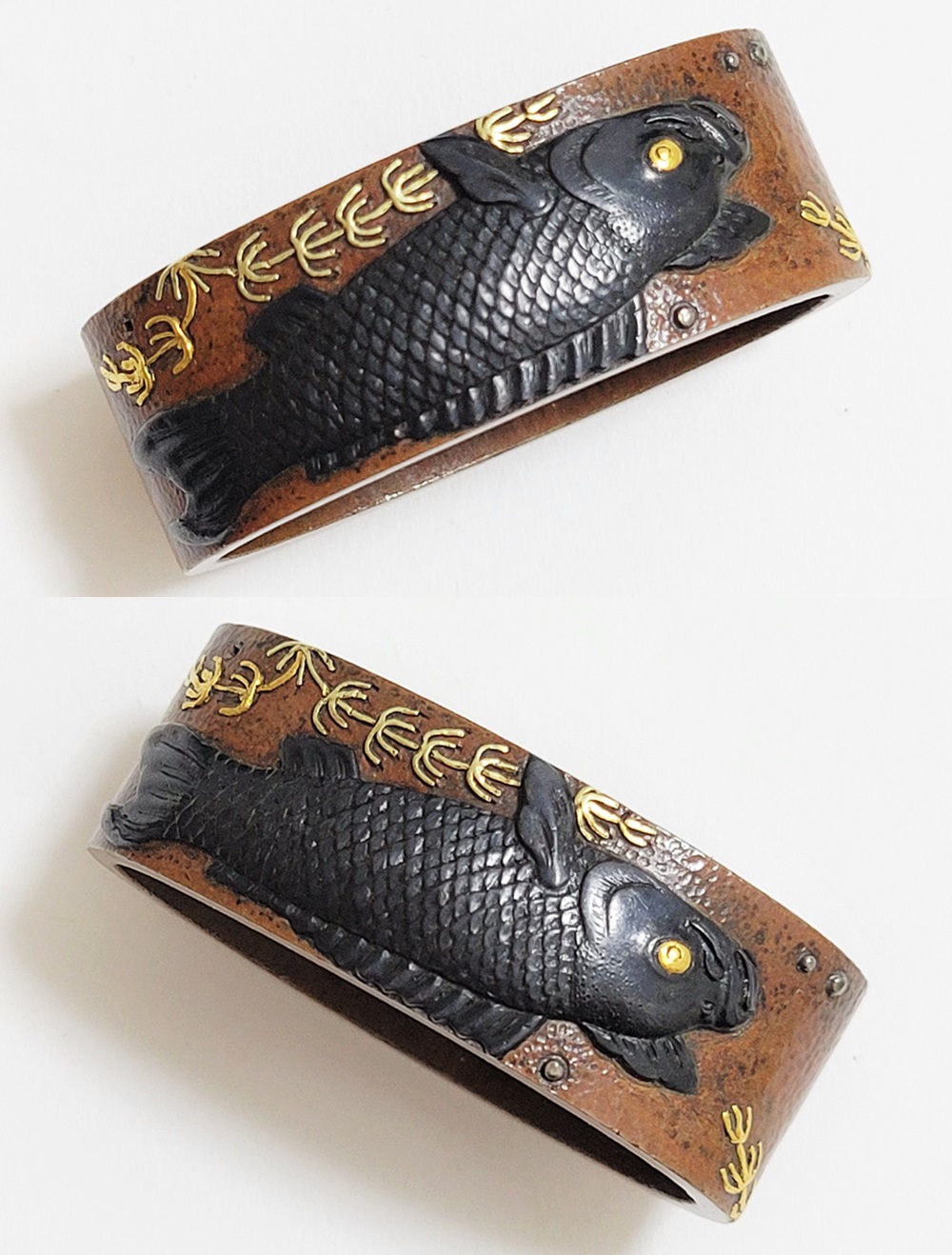 | 藻鯉図は吉兆図。鯉は普段深みに棲むが春から夏の一時期産卵のため川藻の浅瀬にあらわれる。それを古人は「藻出鯉(もいでこい)」として愛でた。あまり見る事のない川魚の長である鯉をみる目出度い徴(しるし)であり、産卵は子孫繁栄の吉祥事。本作は、素銅磨地に雄渾な藻出鯉をあらわす縁頭。作者の志田政寿は江戸後期の金工であろう。2019年特別保存刀装具審査合格。 |