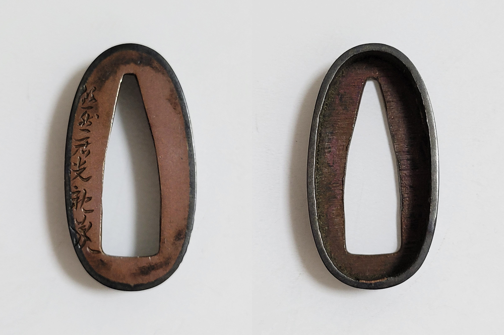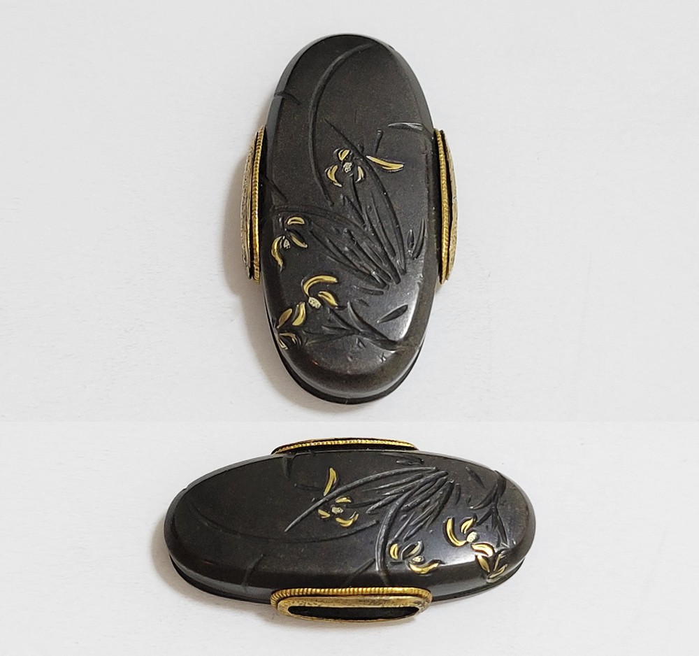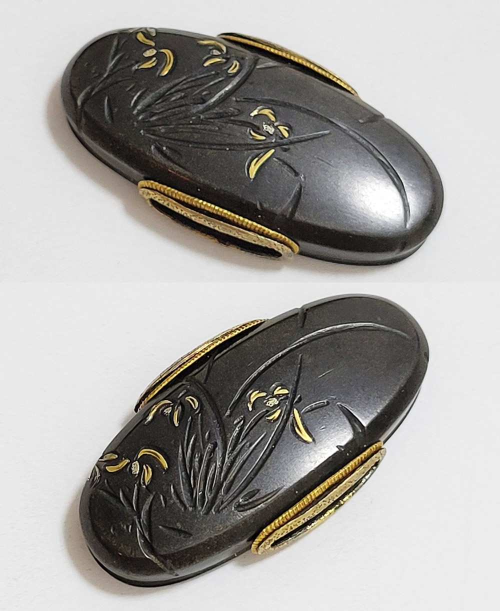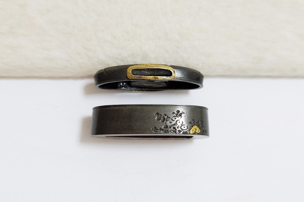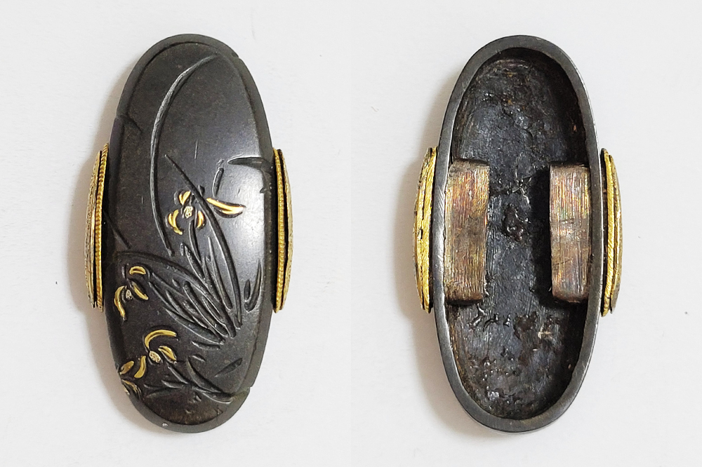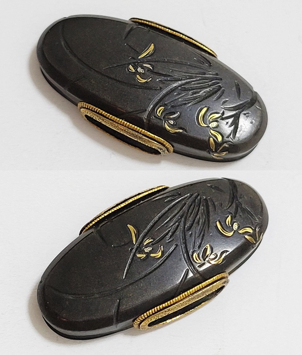 | 四君子は高潔な美しさを持つ梅、菊、蘭、竹の四つの植物を組み合わせた文様。君子の持つ高潔な資質とみなされ古来吉祥文様として好んで用いられた。作者の悠然居光親は鷲田氏。鷲田二代光時の子で父に学ぶ。鷲田派の最後を飾る上手。明治35年(1902)79歳没。庄内鶴岡住。本作は甲鋤毛彫に金銀平象嵌で四君子をあらわす。洗練された意匠。2015年保存刀装具審査合格。 |