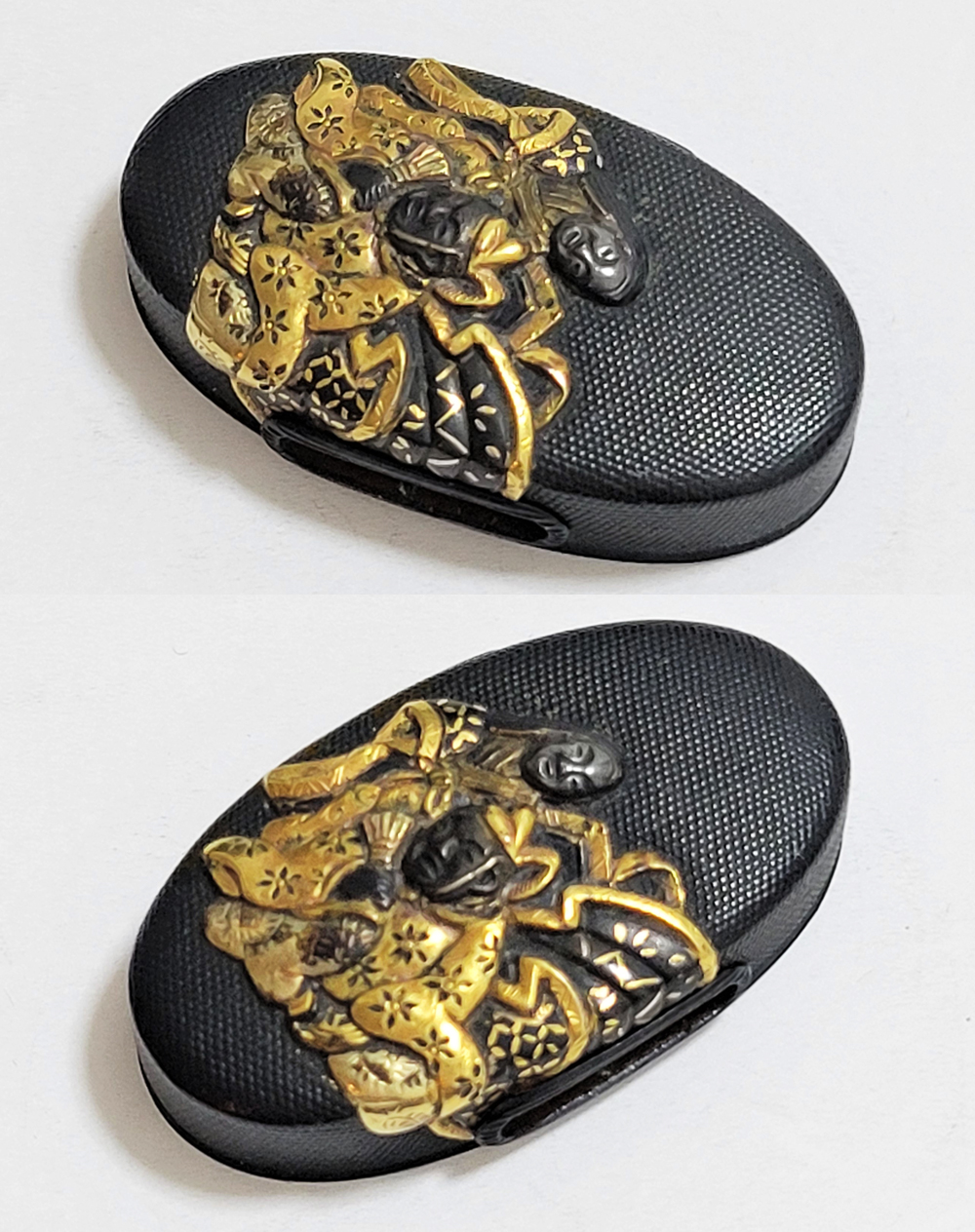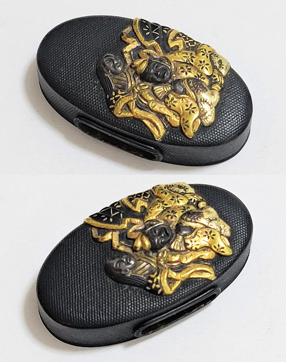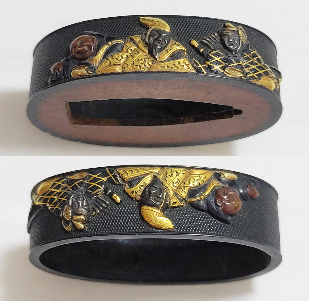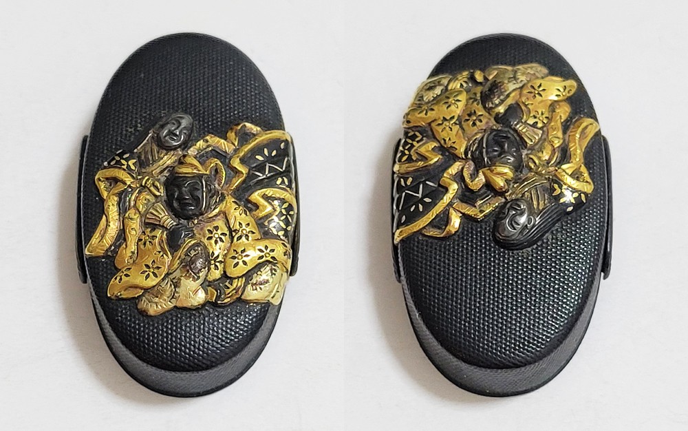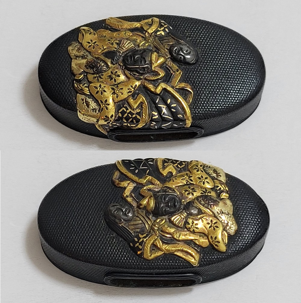| 六歌仙とは、平安時代に編纂された古今和歌集の仮名序において紀貫之が挙げた六人の歌人のこと。そこには「近き世にその名聞こえたる人」として僧正遍昭 (そうじょうへんじょう)・在原業平 (ありひらのなりひら)・文屋康秀 (ぶんやのやすひで)・喜撰法師 (きせんほうし)・小野小町 (おののこまち)・大伴黒主 (おおとものくろぬし)の六人が紹介されている。本作縁頭には縁に4人(左から喜撰法師、文屋康秀、大伴黒主、僧正遍照)、頭に2人(小野小町、在原業平)が描かれている。平安時代の煌びやかな衣装を纏った六歌仙縁頭。 |