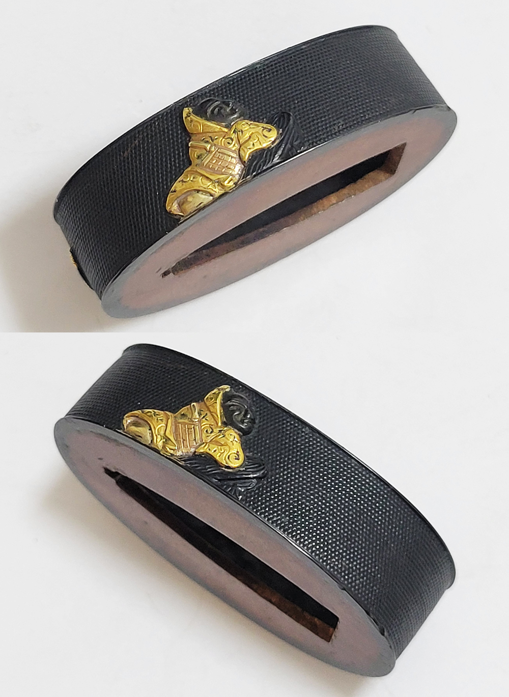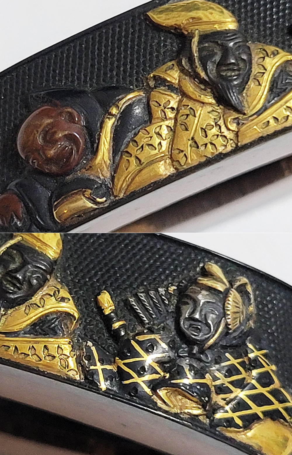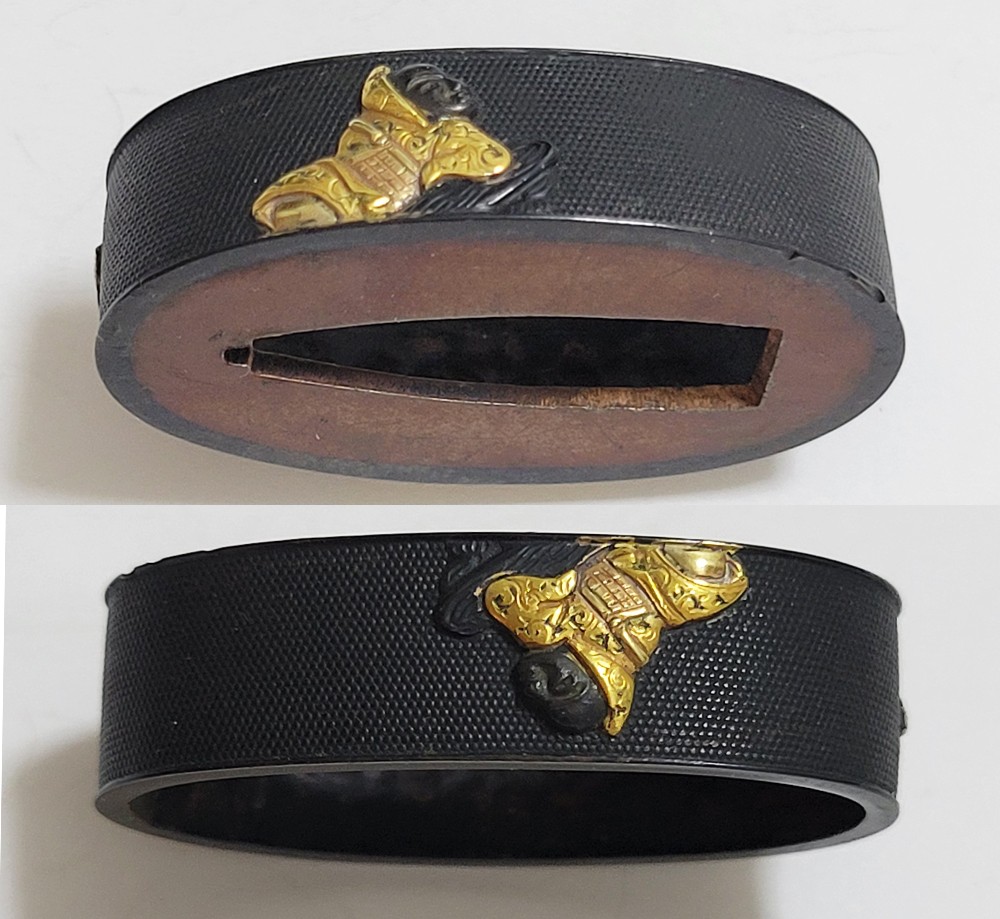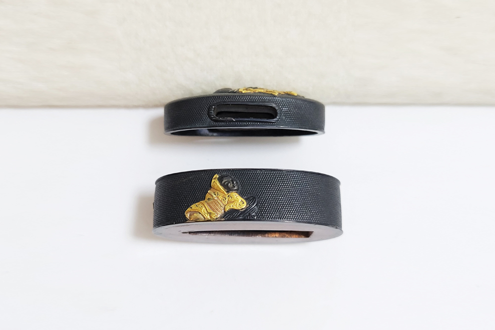 | 六歌仙とは、平安時代に編纂された古今和歌集の仮名序において紀貫之が挙げた六人の歌人のこと。そこには「近き世にその名聞こえたる人」として僧正遍昭 (そうじょうへんじょう)・在原業平 (ありひらのなりひら)・文屋康秀 (ぶんやのやすひで)・喜撰法師 (きせんほうし)・小野小町 (おののこまち)・大伴黒主 (おおとものくろぬし)の六人が紹介されている。本作縁頭には縁に4人(左から喜撰法師、文屋康秀、大伴黒主、僧正遍照)、頭に2人(小野小町、在原業平)が描かれている。平安時代の煌びやかな衣装を纏った六歌仙縁頭。 |