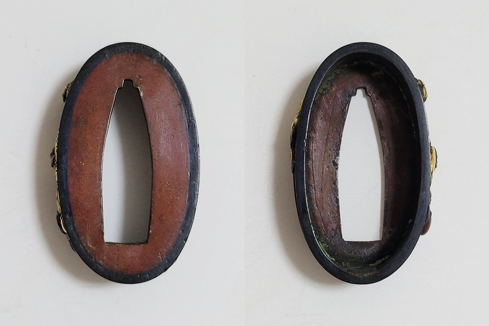 | 材質 | 赤銅魚子地 高彫象嵌色絵 |
