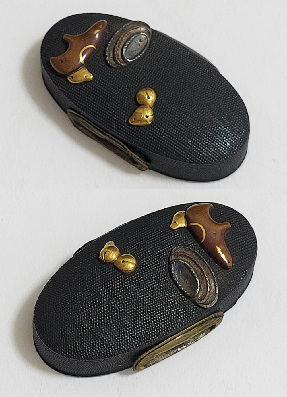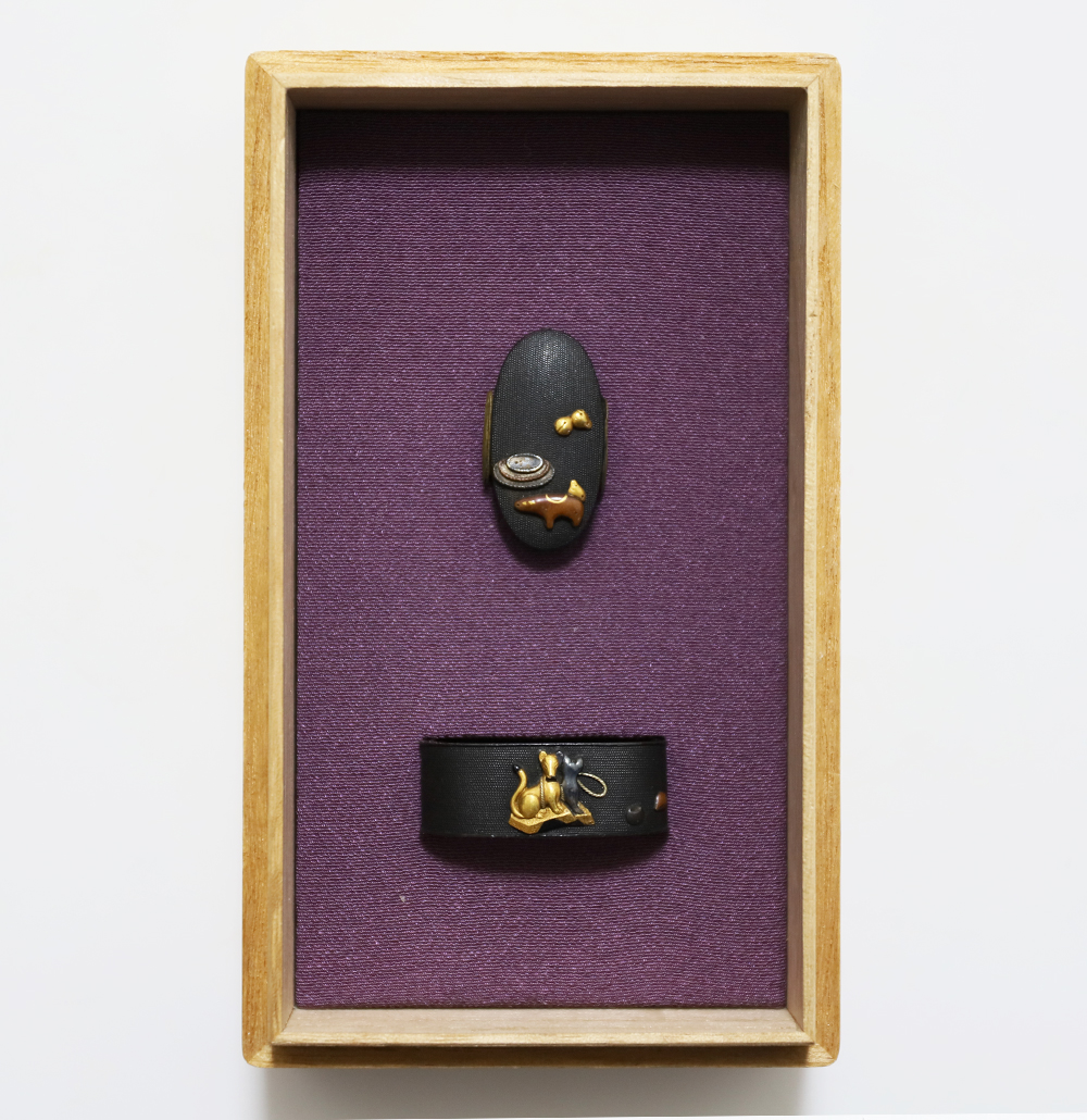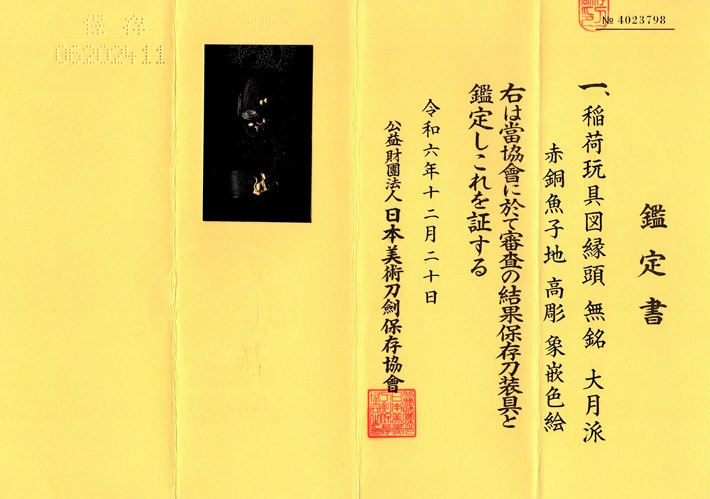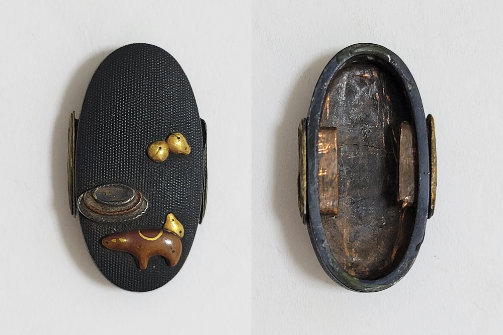 無銘ながら大月派に極められた縁頭。大月派は名工四代大月光興によって大いに隆盛した江戸後期、京都の一門。精巧で堅実な彫法で奇抜、禅味のある作風を遺す。本作は、鉄砲狐、張り子人形、貝合わせ、鈴であろうか。江戸時代の玩具を赤銅魚子地に高彫象嵌色絵であらわす。出来が良い。2024年保存刀装具審査合格。
