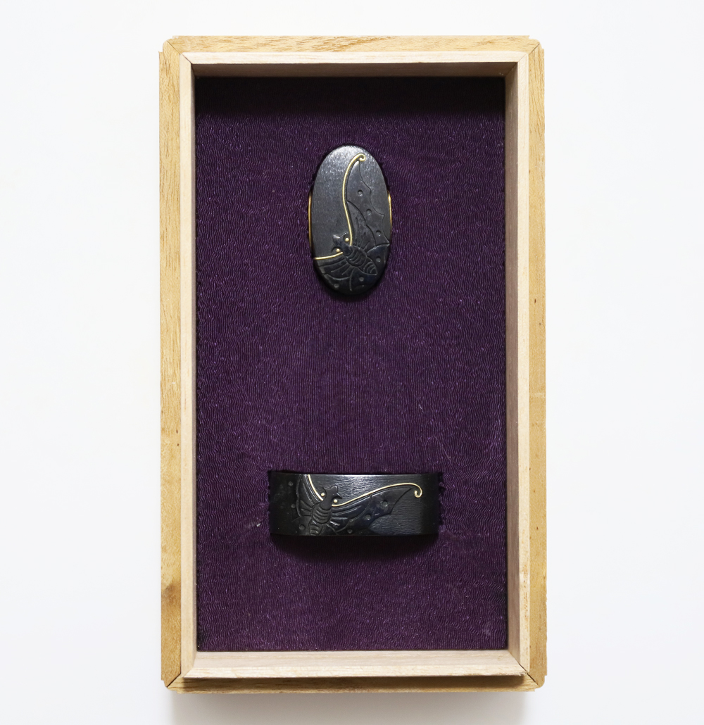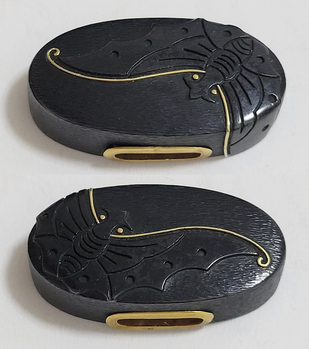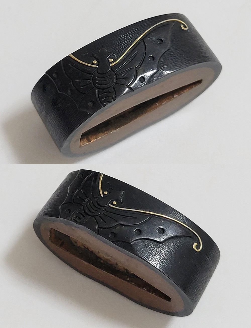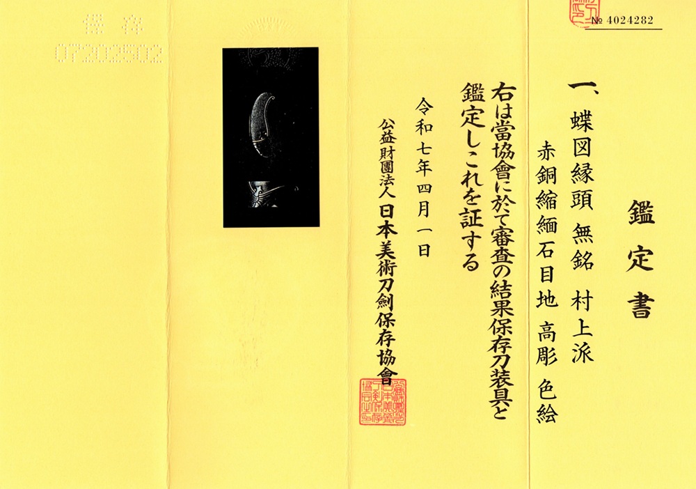 | 本作は村上派と極められた蝶図縁頭。村上派の代表工村上如竹は師伝が明確ではないが、鐙(あぶみ)象嵌師から転じて著名な金工になったと伝わる。高彫の据紋象嵌が多く彫刻は精巧。風格ある作を遺す。子弟みな如某と名のり如竹一派として愛好され、独自の縮緬石目地に蝶や蜻蛉、魚類などをあらわす。本作は赤銅の色よく如竹一門得意の図。2025年2月刀装具審査で保存合格。 |