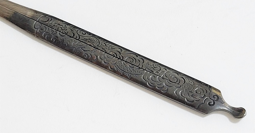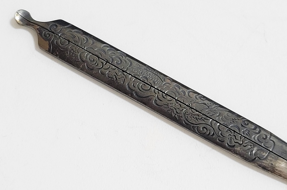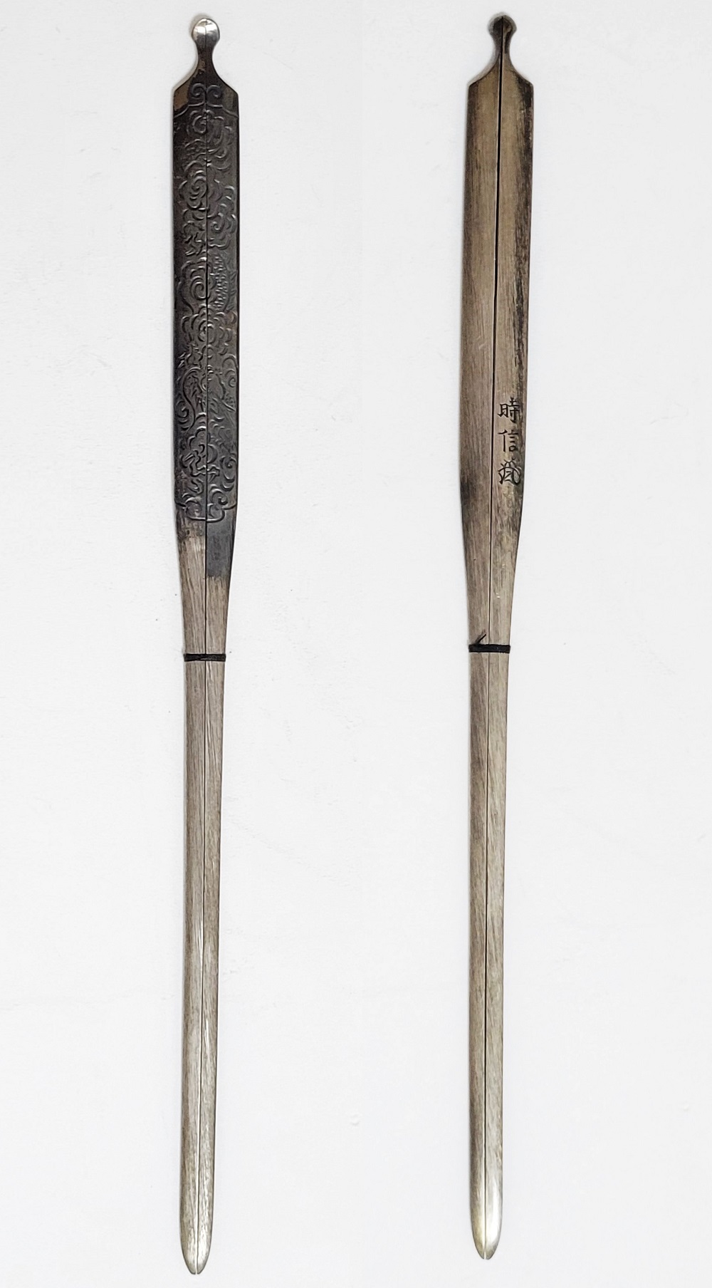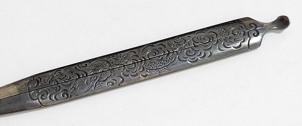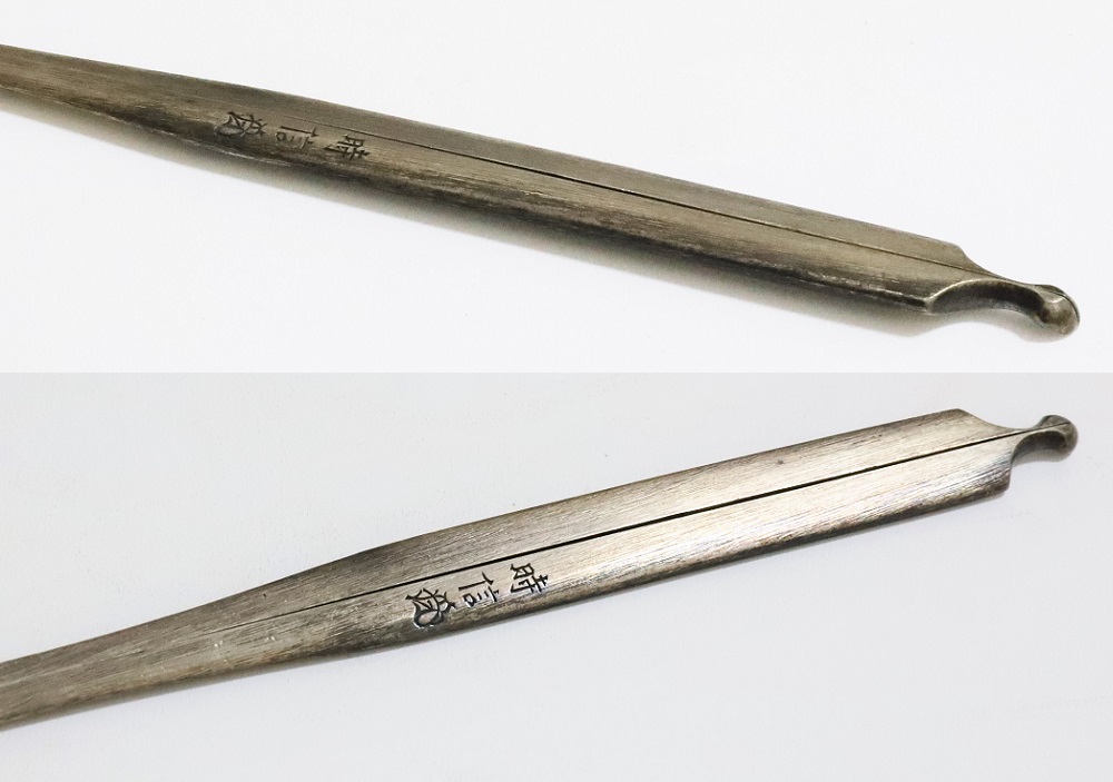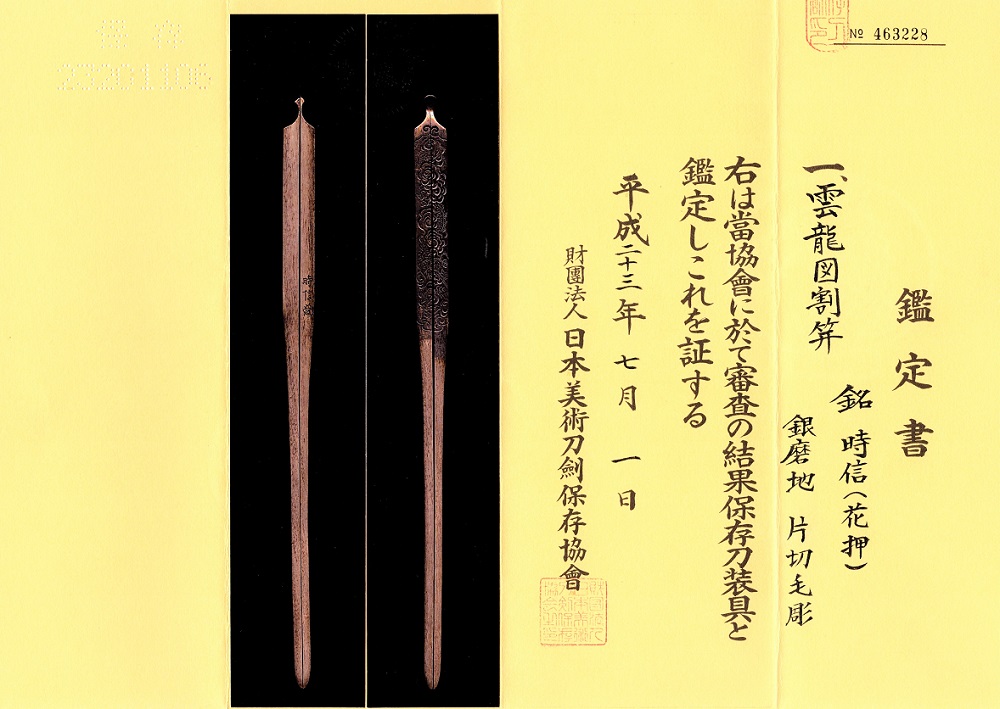 | 時信は佐野氏。柳川直時の門人で、のちに佐野直照の養子となる。文政十一年(1828)生まれ、明治十二年(1879)52歳没。江戸住。本作は片切彫で地板全面に雲龍図を描いた銀地割笄。銀の変色が時代を伝えている。保存刀装具。 |