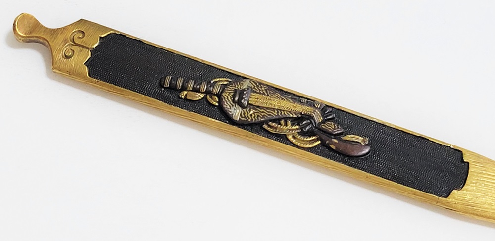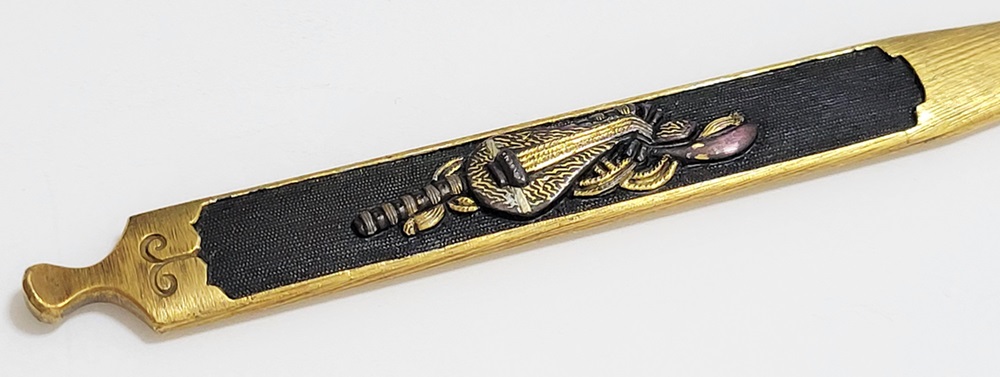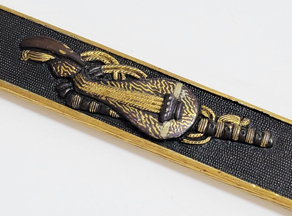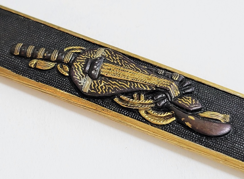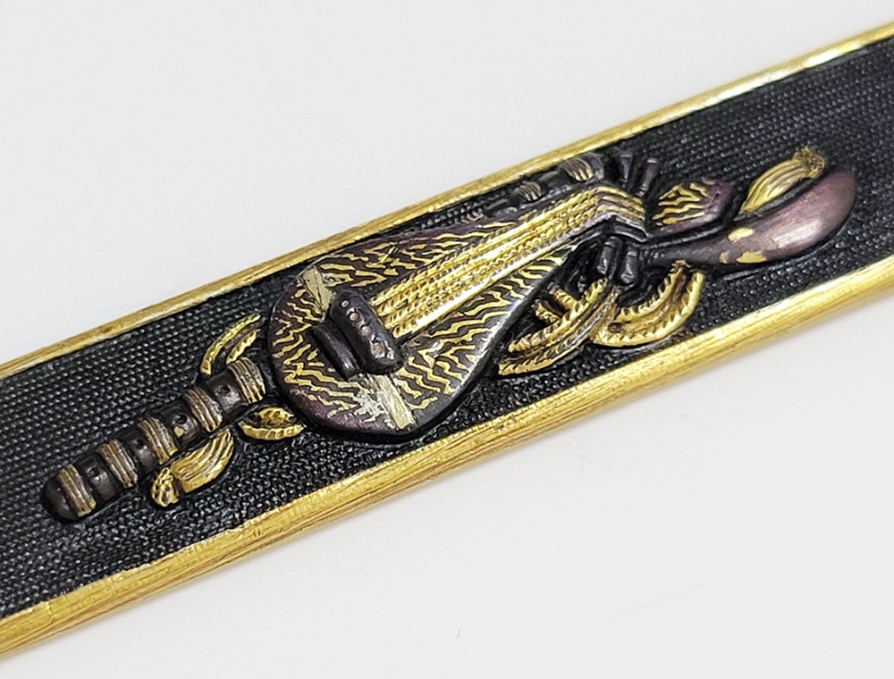 | 雅楽は奈良・平安時代から宮廷、寺社仏閣で盛んに演奏されてきた日本の古典音楽。本作は雅楽器の琵琶と竜笛を繊細優美にあらわす。金を多用した華麗な作から加賀金工とおもわれる。 |