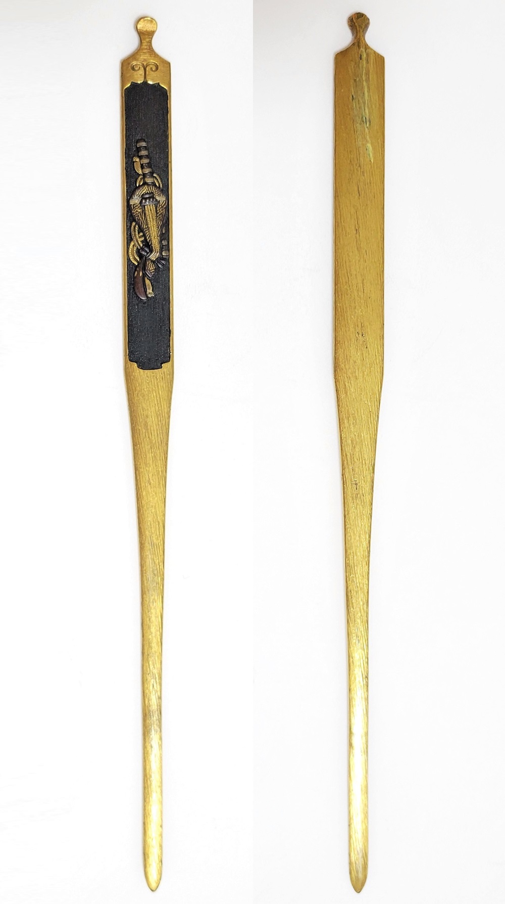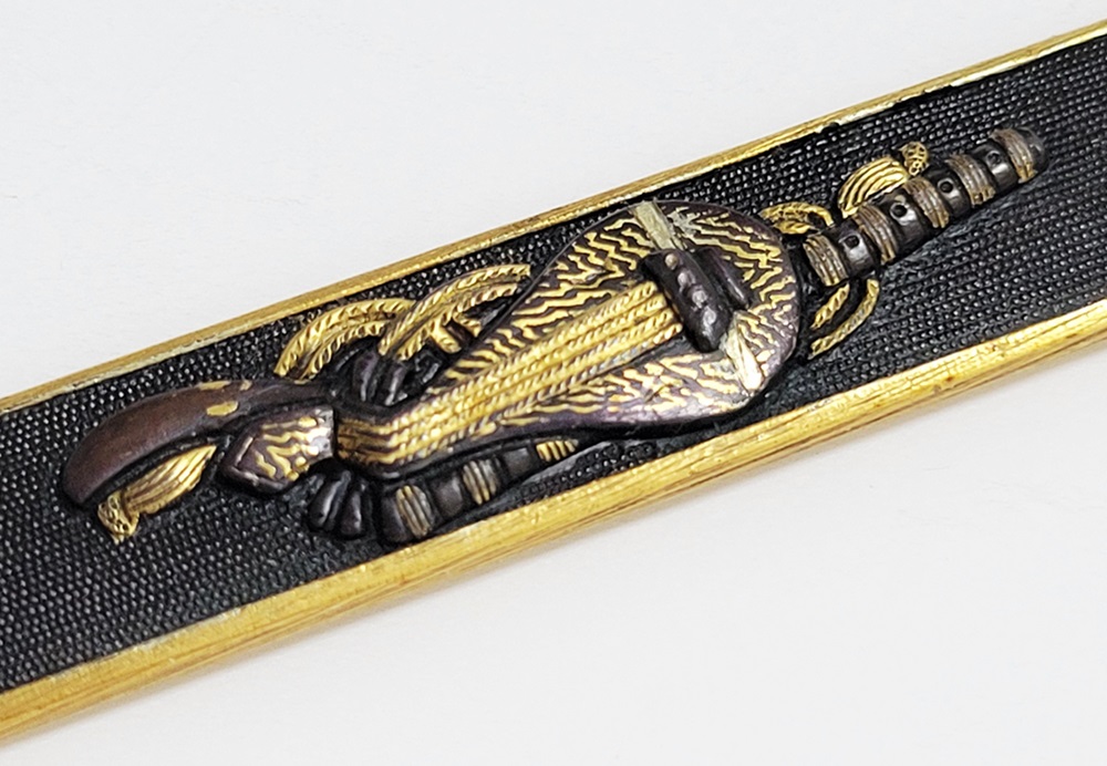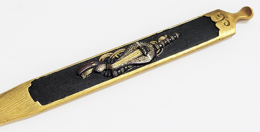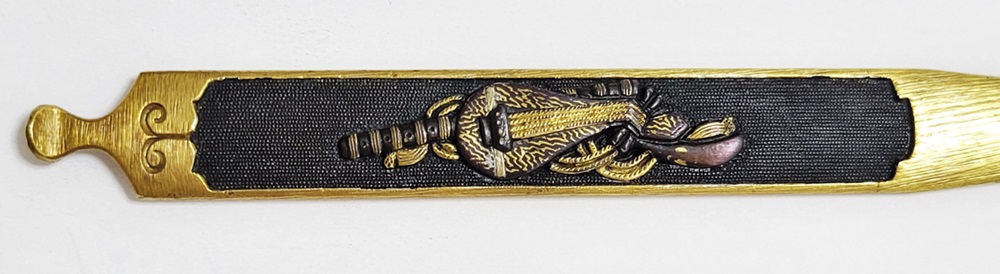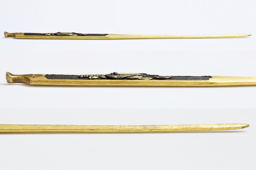 | 雅楽は奈良・平安時代から宮廷、寺社仏閣で盛んに演奏されてきた日本の古典音楽。本作は雅楽器の琵琶と竜笛を繊細優美にあらわす。金を多用した華麗な作から加賀金工とおもわれる。 |