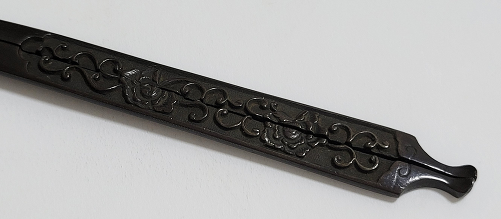 | 美濃は京都に近く交通の要衝であることから、地理的に好条件が整い古来より彫金技術が発達した。草花や動物を鋤下げて浮彫にする作風。桃山時代以前の作とされるものを「古美濃」、それ以降を「美濃」と称している。本作は美濃彫で、百家の王といわれる牡丹と伸び続けることから一族の繁栄や長寿を意味する唐草との吉兆図。2010年「古美濃」に極められ特別保存刀装具審査合格。 |