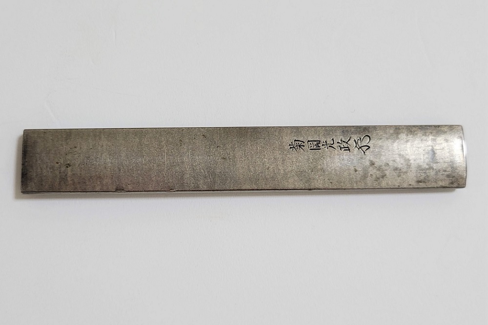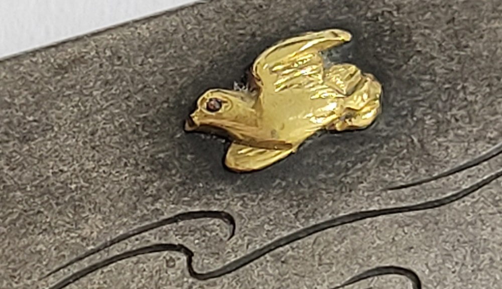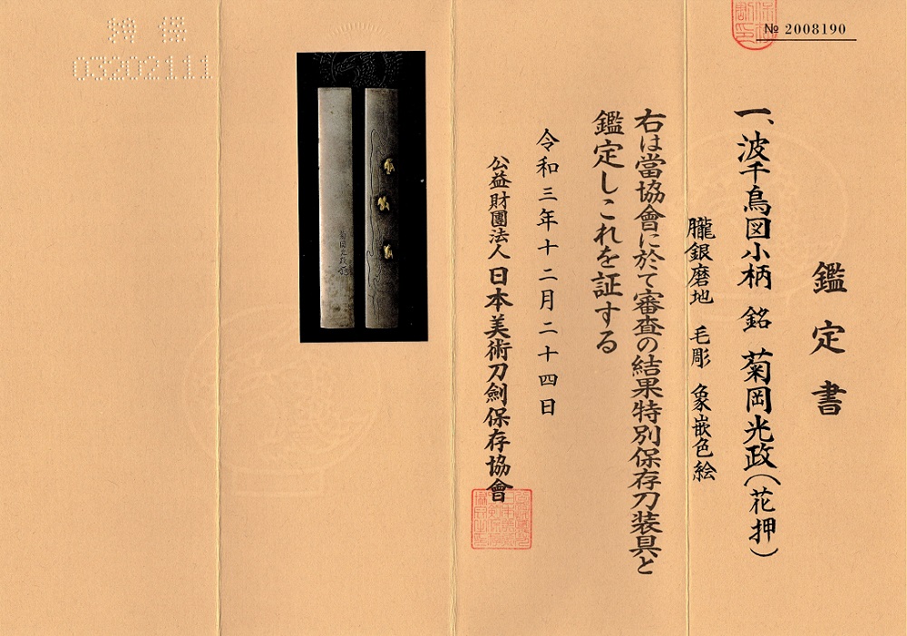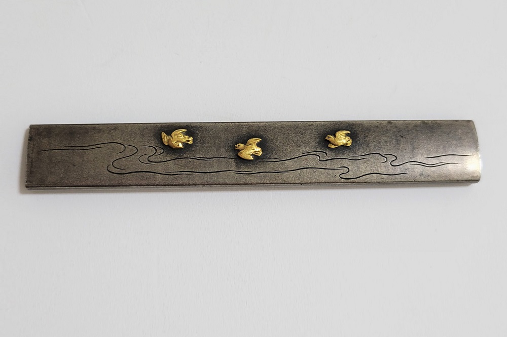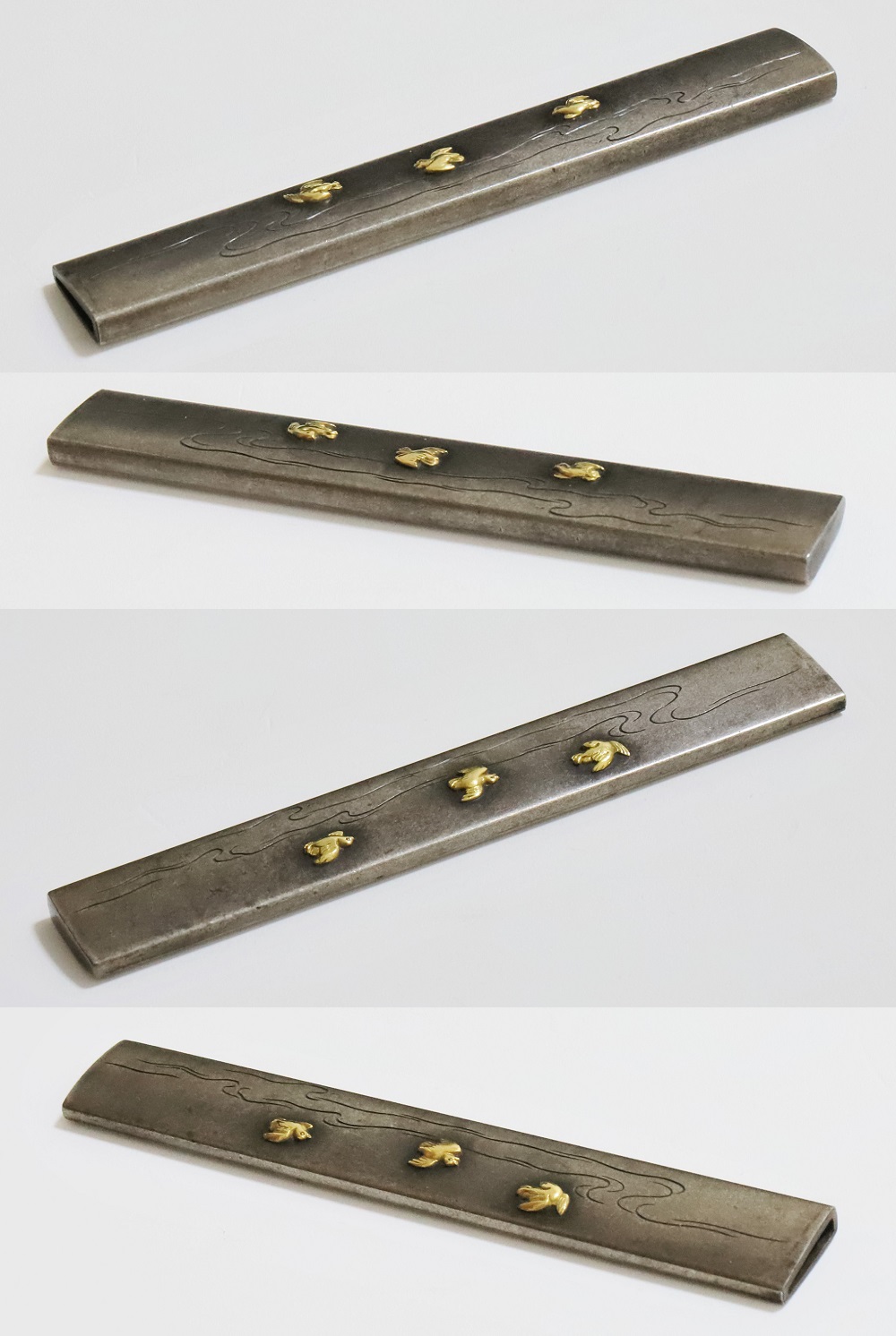 「波千鳥」は荒波を共に乗り越えていこうとする夫婦や家族の円満を表す縁起柄。本作は菊岡光政(花押)銘の波千鳥小柄。菊岡光政は菊岡光行の弟。柳川家三代目の柳川直光に師事する。文政七年(1824)66歳没。波千鳥の情景をあらわした堅実な作。特別保存刀装具。