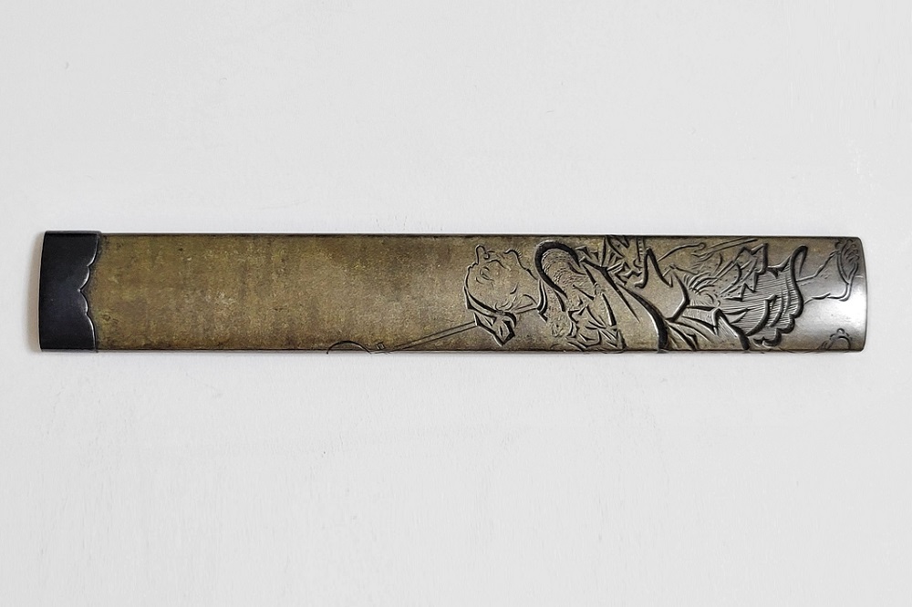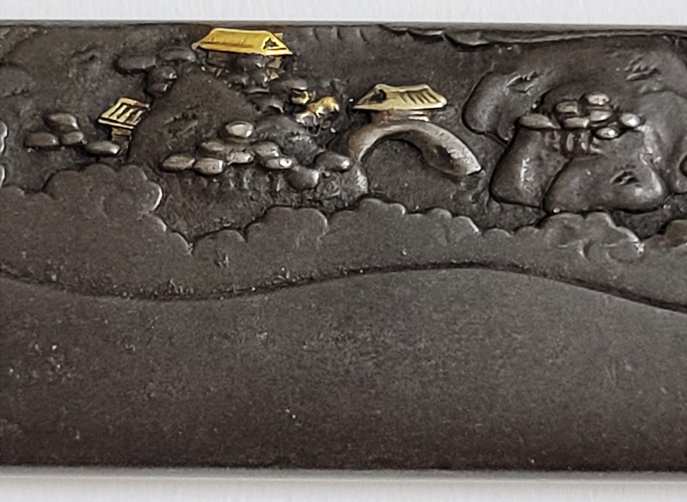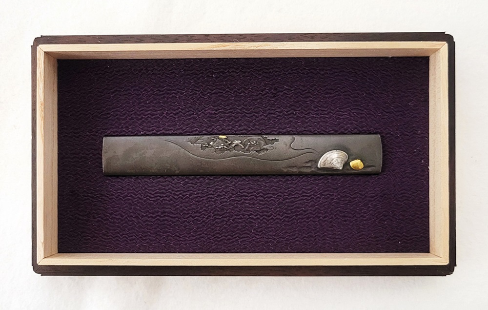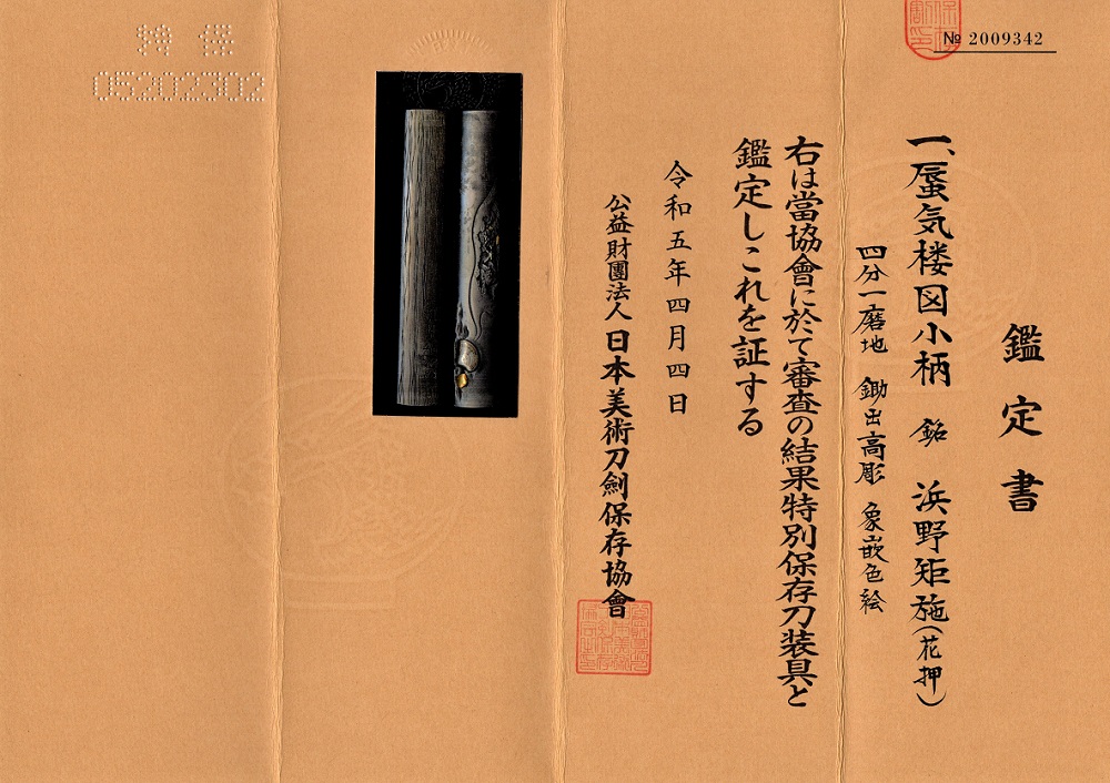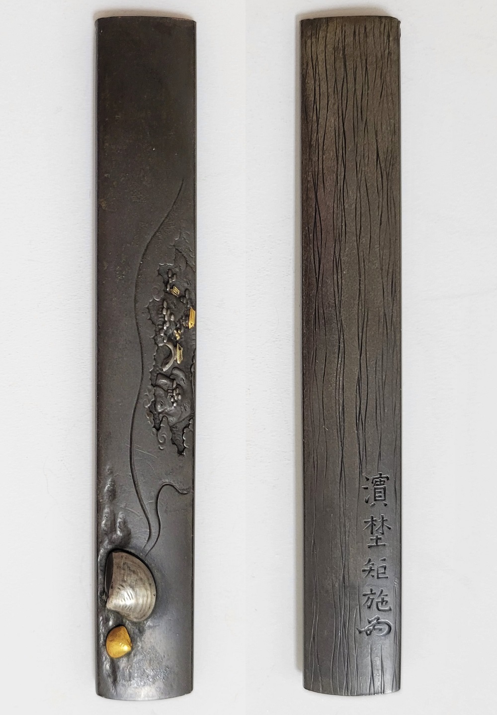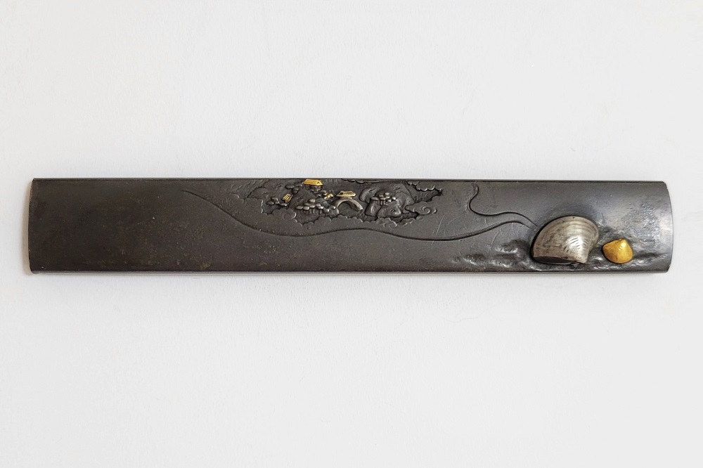 半開きになった大きな貝から気が立ち昇り、その中に山水や楼閣があらわれる図は「蜃気楼」。蜃(しん)とは、蜃気楼を作り出すといわれる伝説の生物。中国と日本で伝承され、竜の類とする説と巨大なハマグリとする説がある。 蜃気楼の名は「蜃(みずち)」が「気」を吐いて「楼」閣を出現させると考えられたことに由来する。 本作者の濱野矩施(のります)は二代濱野矩随(のりゆき)の若名。初代矩随の子で濱野政随に14歳で入門。17歳で政方と名乗り、その後一門の永随に師事して矩施と改める。22歳時に亡父の遺言により二代矩随を名乗る。明和八年(1771)生まれ嘉永五年(1852)没。二代矩随は濱野を「濱埜」と鐫る。初代に劣らぬ良工。特別保存刀装具。
